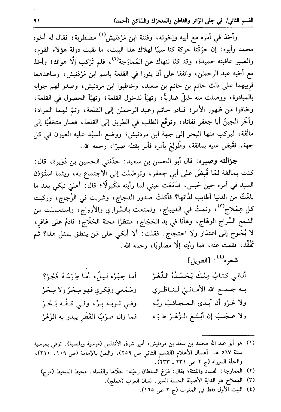 وأخذ في أمره مع أبيه وإخوته، وفتنة ابن مردنيش «1» مضطربة؛ فقال له أخوه محمد وأبوه: إن حركنا حركة كنا سببا لهلاك هذا البيت، ما بقيت دولة هؤلاء القوم، والصبر عاقبته حميدة، وقد كنّا ننهاك عن الممارجة «2» ، فلم تركب إلّا هواك؛ وأخذ مع أخيه عبد الرحمن، واتفقا على أن يثورا في القلعة باسم ابن مردنيش، وساعدهما قريبهما على ذلك حاتم بن حاتم بن سعيد، وخاطبوا ابن مردنيش، وصدر لهم جوابه بالمبادرة، ووصلت منه خيل ضاربة، وتهيّأ لدخول القلعة؛ وتهيّأ الحصول في القلعة، وخافوا من ظهور الأمر؛ فبادر حاتم وعبد الرحمن إلى القلعة، وتمّ لهما المراد؛ وأخّر الجبن أبا جعفر ففاتاه، وتوقّع الطلب في الطريق إلى القلعة، فصار متخفّيا إلى مالقة، ليركب منها البحر إلى جهة ابن مردنيش؛ ووضع السيّد عليه العيون في كل جهة، فقبض عليه بمالقة، وطولع بأمره فأمر بقتله صبرا، رحمه الله.