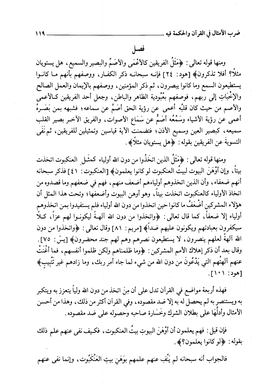 وَمِنْهَا قَوْله تَعَالَى: {مَثَلُ الْفَرِيقَيْنِ كَالأَعْمَى وَالأَصَمِّ وَالْبَصِيرِ وَالسَّمِيعِ هَلْ يَسْتَوِيَانِ مَثَلا أَفَلا تَذَكَّرُونَ} [هود: 24] فَإِنَّهُ سُبْحَانَهُ ذَكَرَ الْكُفَّارَ، وَوَصَفَهُمْ بِأَنَّهُمْ مَا كَانُوا يَسْتَطِيعُونَ السَّمْعَ وَمَا كَانُوا يُبْصِرُونَ، ثُمَّ ذَكَرَ الْمُؤْمِنِينَ، وَوَصَفَهُمْ بِالْإِيمَانِ وَالْعَمَلِ الصَّالِحِ وَالْإِخْبَاتِ إلَى رَبِّهِمْ، فَوَصَفَهُمْ بِعُبُودِيَّةِ الظَّاهِرِ وَالْبَاطِنِ، وَجَعَلَ أَحَدَ الْفَرِيقَيْنِ كَالْأَعْمَى وَالْأَصَمِّ مِنْ حَيْثُ كَانَ قَلْبُهُ أَعْمَى عَنْ رُؤْيَةِ الْحَقِّ أَصَمَّ عَنْ سَمَاعِهِ؛ فَشَبَّهَهُ بِمَنْ بَصَرُهُ أَعْمَى عَنْ رُؤْيَةِ الْأَشْيَاءِ وَسَمْعُهُ أَصَمُّ عَنْ سَمَاعِ الْأَصْوَاتِ، وَالْفَرِيقُ الْآخَرُ بَصِيرُ الْقَلْبِ سَمِيعُهُ، كَبَصِيرِ الْعَيْنِ وَسَمِيعِ الْأُذُنِ؛ فَتَضَمَّنَتْ الْآيَةُ قِيَاسَيْنِ وَتَمْثِيلَيْنِ لِلْفَرِيقَيْنِ، ثُمَّ نَفَى التَّسْوِيَةَ عَنْ الْفَرِيقَيْنِ بِقَوْلِهِ: {هَلْ يَسْتَوِيَانِ مَثَلا} [هود: 24] .