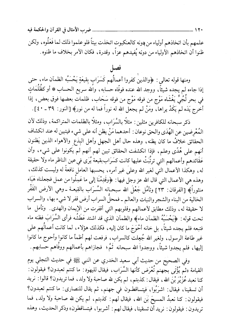 وَتَأَمَّلْ مَا تَحْتَ قَوْلِهِ: {يَحْسَبُهُ الظَّمْآنُ مَاءً} [النور: 39] وَالظَّمْآنُ الَّذِي قَدْ اشْتَدَّ عَطَشُهُ فَرَأَى السَّرَابَ فَظَنَّهُ مَاءً فَتَبِعَهُ فَلَمْ يَجِدْهُ شَيْئًا، بَلْ خَانَهُ أَحْوَجُ مَا كَانَ إلَيْهِ، فَكَذَلِكَ هَؤُلَاءِ، لَمَّا كَانَتْ أَعْمَالُهُمْ عَلَى غَيْرِ طَاعَةِ الرَّسُولِ، وَلِغَيْرِ اللَّهِ جُعِلَتْ كَالسَّرَابِ، فَرَفَعَتْ لَهُمْ أَظْمَأَ مَا كَانُوا وَأَحْوَجَ مَا كَانُوا إلَيْهَا، فَلَمْ يَجِدُوا شَيْئًا، وَوَجَدُوا اللَّهَ سُبْحَانَهُ ثَمَّ؛ فَجَازَاهُمْ بِأَعْمَالِهِمْ وَوَفَّاهُمْ حِسَابَهُمْ وَفِي الصَّحِيحِ مِنْ حَدِيثِ أَبِي سَعِيدٍ الْخُدْرِيِّ عَنْ النَّبِيِّ - صَلَّى اللَّهُ عَلَيْهِ وَسَلَّمَ - فِي حَدِيثِ التَّجَلِّي يَوْمَ الْقِيَامَةِ «ثُمَّ يُؤْتَى بِجَهَنَّمَ تُعْرَضُ كَأَنَّهَا السَّرَابُ، فَيُقَالُ لِلْيَهُودِ: مَا كُنْتُمْ تَعْبُدُونَ؟ فَيَقُولُونَ: كُنَّا نَعْبُدُ عُزَيْرَ بْنَ اللَّهِ، فَيُقَالُ: كَذَبْتُمْ، لَمْ يَكُنْ لِلَّهِ صَاحِبَةٌ وَلَا وَلَدٌ، فَمَا تُرِيدُونَ؟ قَالُوا: نُرِيدُ أَنْ تَسْقِيَنَا، فَيُقَالُ: اشْرَبُوا، فَيَتَسَاقَطُونَ فِي جَهَنَّمَ، ثُمَّ يُقَالُ لِلنَّصَارَى: مَا كُنْتُمْ تَعْبُدُونَ؟ فَيَقُولُونَ: كُنَّا نَعْبُدُ الْمَسِيحَ بْنَ اللَّهِ، فَيُقَالُ لَهُمْ: كَذَبْتُمْ، لَمْ يَكُنْ لِلَّهِ صَاحِبَةٌ وَلَا وَلَدٌ، فَمَا تُرِيدُونَ: فَيَقُولُونَ: نُرِيدُ أَنْ تَسْقِيَنَا، فَيُقَالُ لَهُمْ: اشْرَبُوا، فَيَتَسَاقَطُونَ» وَذَكَرَ الْحَدِيثَ، وَهَذِهِ