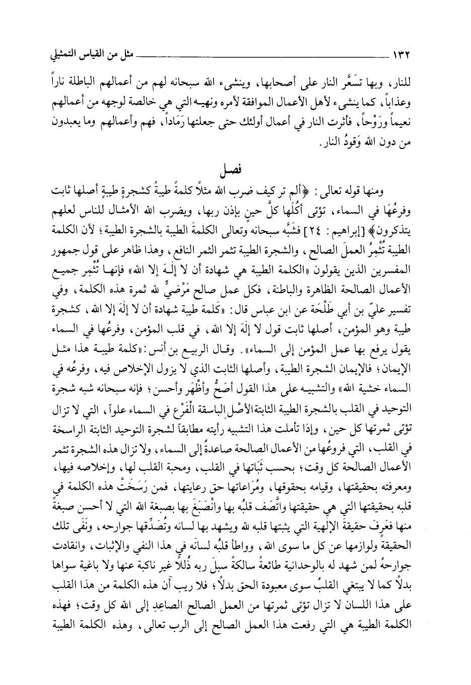 وَقَالَ الرَّبِيعُ بْنُ أَنَسٍ: " كَلِمَةٌ طَيِّبَةٌ هَذَا مَثَلُ الْإِيمَانِ؛ فَالْإِيمَانُ الشَّجَرَةُ الطَّيِّبَةُ. وَأَصْلُهَا الثَّابِتُ الَّذِي لَا يَزُولُ الْإِخْلَاصُ فِيهِ، وَفَرْعُهُ فِي السَّمَاءِ خَشْيَةُ اللَّهِ " وَالتَّشْبِيهُ عَلَى هَذَا الْقَوْلِ أَصَحُّ وَأَظْهَرُ وَأَحْسَنُ؛ فَإِنَّهُ سُبْحَانَهُ شَبَّهَ شَجَرَةَ التَّوْحِيدِ فِي الْقَلْبِ بِالشَّجَرَةِ الطَّيِّبَةِ الثَّابِتَةِ الْأَصْلِ الْبَاسِقَةِ الْفَرْعِ فِي السَّمَاءِ عُلُوًّا، الَّتِي لَا تَزَالُ تُؤْتِي ثَمَرَتَهَا كُلَّ حِينٍ، وَإِذَا تَأَمَّلْت هَذَا التَّشْبِيهَ رَأَيْتَهُ مُطَابِقًا لِشَجَرَةِ التَّوْحِيدِ الثَّابِتَةِ الرَّاسِخَةِ فِي الْقَلْبِ، الَّتِي فُرُوعُهَا مِنْ الْأَعْمَالِ الصَّالِحَةِ صَاعِدَةٌ إلَى السَّمَاءِ، وَلَا تُزَال هَذِهِ الشَّجَرَةُ تُثْمِرُ الْأَعْمَالَ الصَّالِحَةَ كُلَّ وَقْتٍ؛ بِحَسْبِ ثَبَاتِهَا فِي الْقَلْبِ، وَمَحَبَّةِ الْقَلْبِ لَهَا، وَإِخْلَاصِهِ فِيهَا، وَمَعْرِفَتِهِ بِحَقِيقَتِهَا، وَقِيَامِهِ بِحُقُوقِهَا، وَمُرَاعَاتِهَا حَقَّ رِعَايَتِهَا، فَمَنْ رَسَخَتْ هَذِهِ الْكَلِمَةُ فِي قَلْبِهِ بِحَقِيقَتِهَا الَّتِي هِيَ حَقِيقَتُهَا وَاتَّصَفَ قَلْبُهُ بِهَا وَانْصَبَغَ بِهَا بِصِبْغَةِ اللَّهِ الَّتِي لَا أَحْسَنَ صِبْغَةً مِنْهَا فَعَرَفَ حَقِيقَةَ الْإِلَهِيَّةِ الَّتِي يُثْبِتُهَا قَلْبُهُ لِلَّهِ وَيَشْهَدُ بِهَا لِسَانُهُ وَتُصَدِّقُهَا جَوَارِحُهُ، وَنَفَى تِلْكَ الْحَقِيقَةِ وَلَوَازِمَهَا عَنْ كُلِّ مَا سِوَى اللَّهِ، وَوَاطَأَ قَلْبُهُ لِسَانَهُ فِي هَذَا النَّفْيِ وَالْإِثْبَاتِ، وَانْقَادَتْ جَوَارِحُهُ لِمَنْ شَهِدَ لَهُ بِالْوَحْدَانِيَّةِ طَائِعَةً سَالِكَةً سُبُلَ رَبِّهِ ذُلُلًا غَيْرَ نَاكِبَةٍ عَنْهَا وَلَا بَاغِيَةٍ سِوَاهَا بَدَلًا كَمَا لَا يَبْتَغِي الْقَلْبُ سِوَى مَعْبُودِهِ الْحَقِّ بَدَلًا.