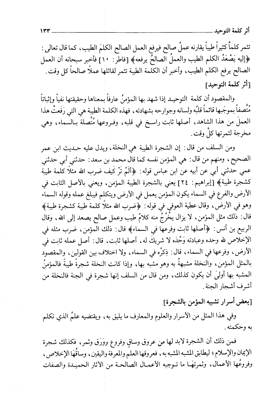 وَالْمَقْصُودُ أَنَّ كَلِمَةَ التَّوْحِيدِ إذَا شَهِدَ بِهَا الْمُؤْمِنُ عَارِفًا بِمَعْنَاهَا وَحَقِيقَتِهَا نَفْيًا وَإِثْبَاتًا مُتَّصِفًا بِمُوجِبِهَا قَائِمًا قَلْبُهُ وَلِسَانُهُ وَجَوَارِحُهُ بِشَهَادَتِهِ، فَهَذِهِ الْكَلِمَةُ الطَّيِّبَةُ هِيَ الَّتِي رَفَعَتْ هَذَا الْعَمَلَ مِنْ هَذَا الشَّاهِدِ، أَصْلُهَا ثَابِتٌ رَاسِخٌ فِي قَلْبِهِ، وَفُرُوعُهَا مُتَّصِلَةٌ بِالسَّمَاءِ، وَهِيَ مُخْرِجَةٌ لِثَمَرَتِهَا كُلَّ وَقْتٍ.