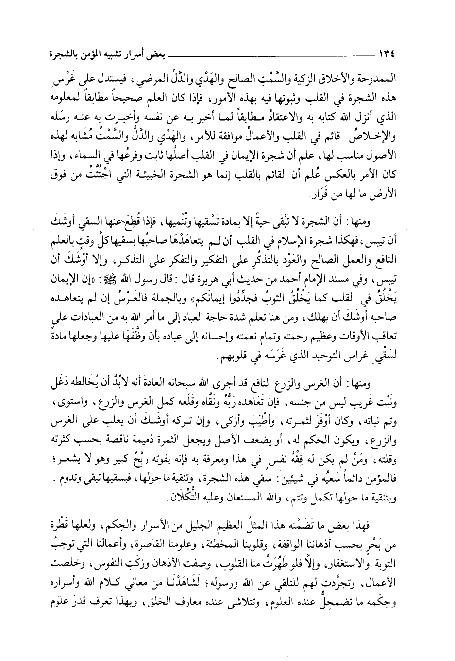 وَمِنْهَا: أَنَّ الشَّجَرَةَ لَا تَبْقَى حَيَّةً إلَّا بِمَادَّةٍ تُسْقِيهَا وَتُنَمِّيهَا، فَإِذَا قُطِعَ عَنْهَا السَّقْيُ أَوْشَكَ أَنْ تَيْبَسَ، فَهَكَذَا شَجَرَةُ الْإِسْلَامِ فِي الْقَلْبِ إنْ لَمْ يَتَعَاهَدْهَا صَاحِبُهَا بِسَقْيِهَا كُلَّ وَقْتٍ بِالْعِلْمِ النَّافِعِ وَالْعَمَلِ الصَّالِحِ وَالْعَوْدِ بِالتَّذَكُّرِ عَلَى التَّفْكِيرِ وَالتَّفَكُّرِ عَلَى التَّذَكُّرِ، وَإِلَّا أَوْشَكَ أَنْ تَيْبَسَ، وَفِي مُسْنَدِ الْإِمَامِ أَحْمَدَ مِنْ حَدِيثِ أَبِي هُرَيْرَةَ قَالَ: قَالَ رَسُولُ اللَّهِ - صَلَّى اللَّهُ عَلَيْهِ وَسَلَّمَ -: «إنَّ الْإِيمَانَ يَخْلَقُ فِي الْقَلْبِ كَمَا يَخْلَقُ الثَّوْبُ فَجَدِّدُوا إيمَانَكُمْ» وَبِالْجُمْلَةِ فَالْغَرْسُ إنْ لَمْ يَتَعَاهَدْهُ صَاحِبُهُ أَوْشَكَ أَنْ يَهْلَكَ، وَمِنْ هُنَا تَعْلَمُ شِدَّةَ حَاجَةِ الْعِبَادِ إلَى مَا أَمَرَ اللَّهُ بِهِ مِنْ الْعِبَادَاتِ عَلَى تَعَاقُبِ الْأَوْقَاتِ وَعَظِيمِ رَحْمَتِهِ وَتَمَامِ نِعْمَتِهِ وَإِحْسَانِهِ إلَى عِبَادِهِ بِأَنْ وَظَّفَهَا عَلَيْهَا وَجَعَلَهَا مَادَّةً لِسَقْيِ غِرَاسِ التَّوْحِيدِ الَّذِي غَرَسَهُ فِي قُلُوبِهِمْ.