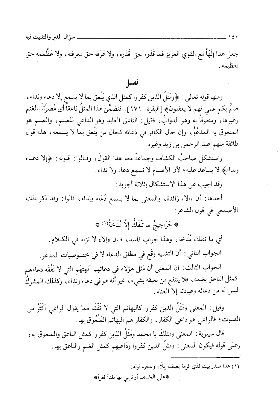 وَقَدْ أُجِيبَ عَنْ هَذَا الِاسْتِشْكَالِ بِثَلَاثَةِ أَجْوِبَةٍ: أَحَدُهَا: أَنَّ " إلَّا " زَائِدَةٌ، وَالْمَعْنَى بِمَا لَا يَسْمَعُ دُعَاءً وَنِدَاءً، قَالُوا: وَقَدْ ذَكَرَ ذَلِكَ الْأَصْمَعِيُّ فِي قَوْلِ الشَّاعِرِ: