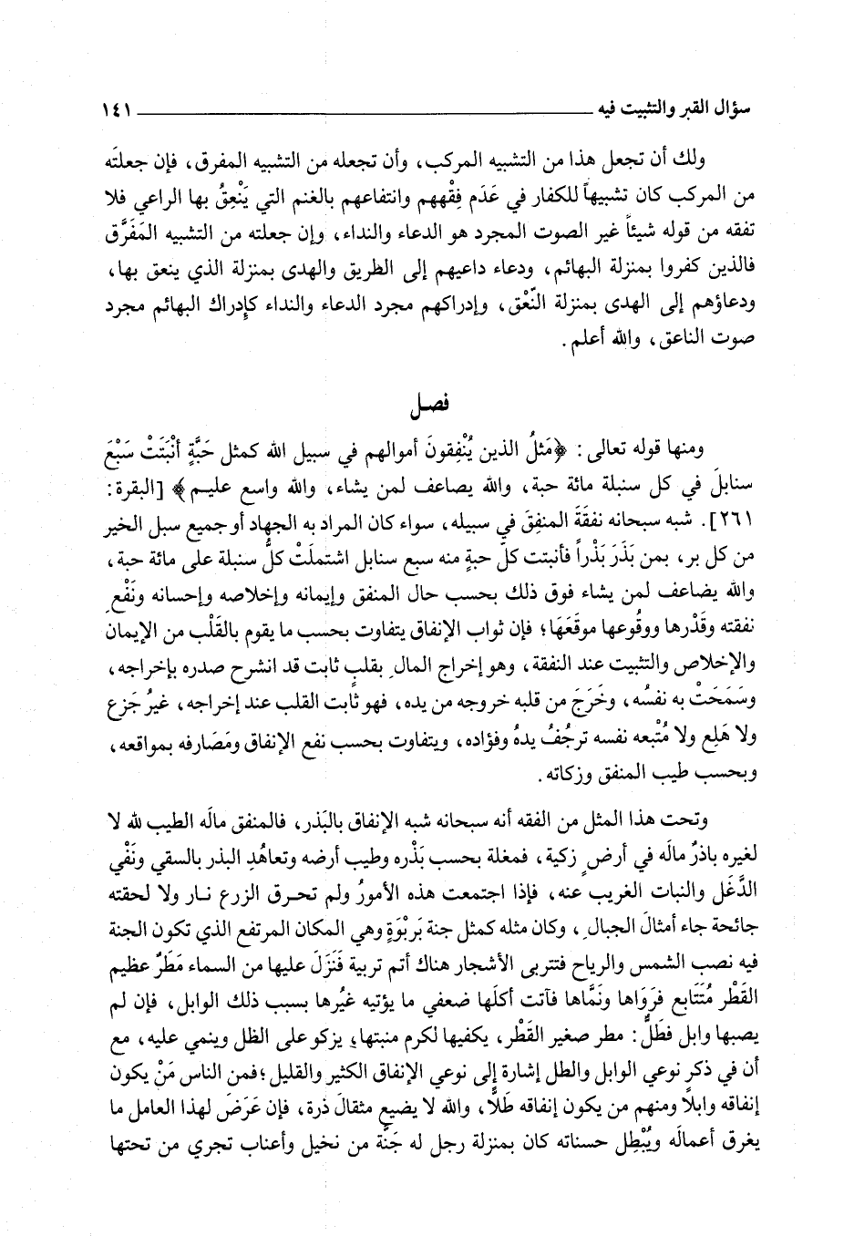 وَمِنْهَا قَوْله تَعَالَى: {مَثَلُ الَّذِينَ يُنْفِقُونَ أَمْوَالَهُمْ فِي سَبِيلِ اللَّهِ كَمَثَلِ حَبَّةٍ أَنْبَتَتْ سَبْعَ سَنَابِلَ فِي كُلِّ سُنْبُلَةٍ مِائَةُ حَبَّةٍ وَاللَّهُ يُضَاعِفُ لِمَنْ يَشَاءُ وَاللَّهُ وَاسِعٌ عَلِيمٌ} [البقرة: 261] شَبَّهَ سُبْحَانَهُ نَفَقَةَ الْمُنْفِقِ فِي سَبِيلِهِ، سَوَاءٌ كَانَ الْمُرَادُ بِهِ الْجِهَادُ أَوْ جَمِيعُ سُبُلِ الْخَيْرِ مِنْ كُلِّ بِرٍّ، بِمَنْ بَذَرَ بَذْرًا فَأَنْبَتَتْ كُلُّ حَبَّةٍ مِنْهُ سَبْعَ سَنَابِلَ اشْتَمَلَتْ كُلُّ سُنْبُلَةٍ عَلَى مِائَةِ حَبَّةٍ، وَاَللَّهُ يُضَاعِفُ لِمَنْ يَشَاءُ فَوْقَ ذَلِكَ بِحَسْبِ حَالِ الْمُنْفِقِ وَإِيمَانِهِ وَإِخْلَاصِهِ وَإِحْسَانِهِ وَنَفْعِ نَفَقَتِهِ وَقَدْرِهَا وَوُقُوعِهَا مَوْقِعَهَا؛ فَإِنَّ ثَوَابَ الْإِنْفَاقِ يَتَفَاوَتُ بِحَسَبِ مَا يَقُومُ بِالْقَلْبِ مِنْ الْإِيمَانِ وَالْإِخْلَاصِ وَالتَّثْبِيتِ عِنْدَ النَّفَقَةِ، وَهُوَ إخْرَاجُ الْمَالِ بِقَلْبٍ ثَابِتٍ قَدْ انْشَرَحَ صَدْرُهُ بِإِخْرَاجِهِ، وَسَمَحَتْ بِهِ نَفْسُهُ، وَخَرَجَ مِنْ قَلْبِهِ خُرُوجَهُ مِنْ يَدِهِ، فَهُوَ ثَابِتُ الْقَلْبِ عِنْدَ إخْرَاجِهِ، غَيْرُ جَزِعٍ وَلَا هَلِعٍ وَلَا مُتْبِعِهِ نَفْسَهُ تَرْجُفُ يَدُهُ وَفُؤَادُهُ، وَيَتَفَاوَتُ بِحَسْبِ نَفْعِ الْإِنْفَاقِ وَمَصَارِفِهِ بِمَوَاقِعِهِ، وَبِحَسْبِ طِيبِ الْمُنْفِقِ وَزَكَاتِهِ وَتَحْتَ هَذَا الْمَثَلِ مِنْ الْفِقْهِ أَنَّهُ سُبْحَانَهُ شَبَّهَ الْإِنْفَاقَ بِالْبَذْرِ.