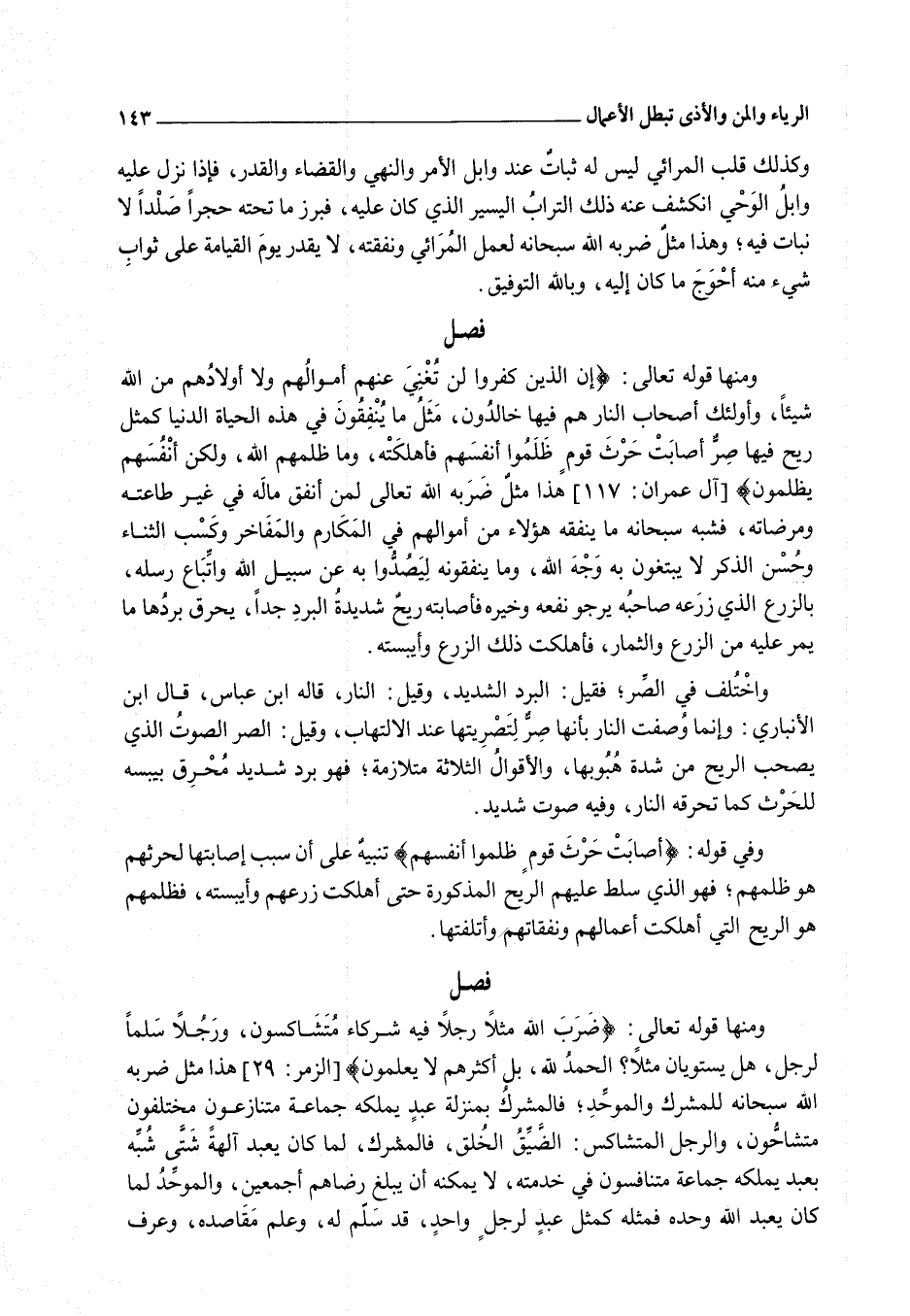 وَمِنْهَا قَوْله تَعَالَى: {إِنَّ الَّذِينَ كَفَرُوا لَنْ تُغْنِيَ عَنْهُمْ أَمْوَالُهُمْ وَلا أَوْلادُهُمْ مِنَ اللَّهِ شَيْئًا وَأُولَئِكَ أَصْحَابُ النَّارِ هُمْ فِيهَا خَالِدُونَ} [آل عمران: 116] {مَثَلُ مَا يُنْفِقُونَ فِي هَذِهِ الْحَيَاةِ الدُّنْيَا كَمَثَلِ رِيحٍ فِيهَا صِرٌّ أَصَابَتْ حَرْثَ قَوْمٍ ظَلَمُوا أَنْفُسَهُمْ فَأَهْلَكَتْهُ وَمَا ظَلَمَهُمُ اللَّهُ وَلَكِنْ أَنْفُسَهُمْ يَظْلِمُونَ} [آل عمران: 117] هَذَا مَثَلٌ ضَرَبَهُ اللَّهُ تَعَالَى لِمَنْ أَنْفَقَ مَالَهُ فِي غَيْرِ طَاعَتِهِ وَمَرْضَاتِهِ، فَشَبَّهَ سُبْحَانَهُ مَا يُنْفِقُهُ هَؤُلَاءِ مِنْ أَمْوَالِهِمْ فِي الْمَكَارِمِ وَالْمَفَاخِرِ وَكَسْبِ الثَّنَاءِ وَحُسْنِ الذِّكْرِ لَا يَبْتَغُونَ بِهِ وَجْهَ اللَّهِ، وَمَا يُنْفِقُونَهُ لِيَصُدُّوا بِهِ عَنْ سَبِيلِ اللَّهِ وَاتِّبَاعِ رُسُلِهِ، بِالزَّرْعِ الَّذِي زَرَعَهُ صَاحِبُهُ يَرْجُو نَفْعَهُ وَخَيْرَهُ فَأَصَابَتْهُ رِيحٌ شَدِيدَةُ الْبَرْدِ جِدًّا، يُحْرِقُ بَرْدُهَا مَا يَمُرُّ عَلَيْهِ مِنْ الزَّرْعِ وَالثِّمَارِ، فَأَهْلَكَتْ ذَلِكَ الزَّرْعَ وَأَيْبَسَتْهُ.