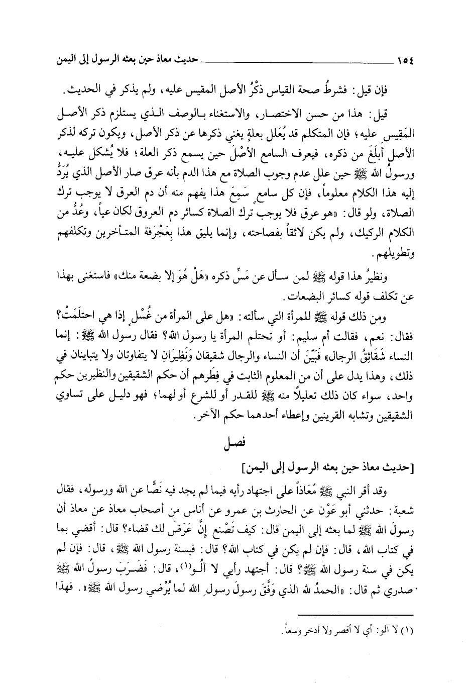 وَقَدْ أَقَرَّ النَّبِيُّ - صَلَّى اللَّهُ عَلَيْهِ وَسَلَّمَ - مُعَاذًا عَلَى اجْتِهَادِ رَأْيِهِ فِيمَا لَمْ يَجِدْ فِيهِ نَصًّا عَنْ اللَّهِ وَرَسُولِهِ، فَقَالَ شُعْبَةُ: حَدَّثَنِي أَبُو عَوْنٍ عَنْ الْحَارِثِ بْنِ عَمْرٍو عَنْ أُنَاسٍ مِنْ أَصْحَابِ مُعَاذٍ «عَنْ مُعَاذٍ أَنَّ رَسُولَ اللَّهِ - صَلَّى اللَّهُ عَلَيْهِ وَسَلَّمَ - لَمَّا بَعَثَهُ إلَى الْيَمَنِ قَالَ: كَيْفَ تَصْنَعُ إنْ عَرَضَ لَكَ قَضَاءٌ؟ قَالَ: أَقْضِي بِمَا فِي كِتَابِ اللَّهِ، قَالَ: فَإِنْ لَمْ يَكُنْ فِي كِتَابِ اللَّهِ؟ قَالَ: فَبِسُنَّةِ رَسُولِ اللَّهِ - صَلَّى اللَّهُ عَلَيْهِ وَسَلَّمَ -، قَالَ: فَإِنْ لَمْ يَكُنْ فِي سُنَّةِ رَسُولِ اللَّهِ - صَلَّى اللَّهُ عَلَيْهِ وَسَلَّمَ -؟ قَالَ: أَجْتَهِدُ رَأْيِي لَا آلُو، قَالَ: فَضَرَبَ رَسُولُ اللَّهِ - صَلَّى اللَّهُ عَلَيْهِ وَسَلَّمَ - صَدْرِي ثُمَّ قَالَ: الْحَمْدُ لِلَّهِ الَّذِي وَفَّقَ رَسُولَ رَسُولِ اللَّهِ لِمَا يُرْضِي رَسُولَ اللَّهِ - صَلَّى اللَّهُ عَلَيْهِ وَسَلَّمَ -» . فَهَذَا