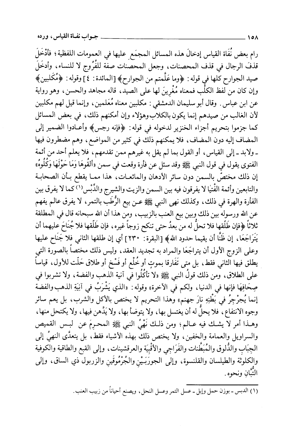 وَقَالَ أَبُو سُلَيْمَانَ الدِّمَشْقِيُّ: مُكَلِّبِينَ مَعْنَاهُ مُعَلَّمِينَ، وَإِنَّمَا قِيلَ لَهُمْ مُكَلِّبِينَ؛ لِأَنَّ الْغَالِبَ مِنْ صَيْدِهِمْ إنَّمَا يَكُونُ بِالْكِلَابِ وَهَؤُلَاءِ وَإِنْ أَمْكَنَهُمْ ذَلِكَ فِي بَعْضِ الْمَسَائِلِ كَمَا جَزَمُوا بِتَحْرِيمِ أَجْزَاءِ الْخِنْزِيرِ لِدُخُولِهِ فِي قَوْلِهِ: {فَإِنَّهُ رِجْسٌ} [الأنعام: 145] ، وَأَعَادُوا الضَّمِيرَ إلَى الْمُضَافِ إلَيْهِ دُونَ الْمُضَافِ، فَلَا يُمْكِنُهُمْ ذَلِكَ فِي كَثِيرٍ مِنْ الْمَوَاضِعِ، وَهُمْ مُضْطَرُّونَ فِيهَا - وَلَا بُدَّ - إلَى الْقِيَاسِ، أَوْ الْقَوْلِ بِمَا لَمْ يَقُلْ بِهِ غَيْرُهُمْ مِمَّنْ تَقَدَّمَهُمْ، فَلَا يُعْلَمُ أَحَدٌ مِنْ أَئِمَّةِ الْفَتْوَى يَقُولُ فِي «قَوْلِ النَّبِيِّ - صَلَّى اللَّهُ عَلَيْهِ وَسَلَّمَ - وَقَدْ سُئِلَ عَنْ فَأْرَةٍ وَقَعَتْ فِي سَمْنٍ أَلْقُوهَا وَمَا حَوْلَهَا وَكُلُوهُ» ، إنَّ ذَلِكَ مُخْتَصٌّ بِالسَّمْنِ دُونَ سَائِرِ الْأَدْهَانِ وَالْمَائِعَاتِ، هَذَا مِمَّا يَقْطَعُ بِأَنَّ الصَّحَابَةَ وَالتَّابِعِينَ وَأَئِمَّةَ الْفَتِيَّا لَا يُفَرِّقُونَ فِيهِ بَيْنَ السَّمْنِ وَالزَّيْتِ وَالشَّيْرَجِ وَالدِّبْسِ؛ كَمَا لَا يُفَرَّقُ بَيْنَ الْفَأْرَةِ وَالْهِرَّةِ فِي ذَلِكَ، وَكَذَلِكَ «نَهَى النَّبِيُّ - صَلَّى اللَّهُ عَلَيْهِ وَسَلَّمَ - عَنْ بَيْعِ الرُّطَبِ بِالتَّمْرِ» ، لَا يُفَرِّقُ عَالِمٌ يَفْهَمُ عَنْ اللَّهِ وَرَسُولِهِ بَيْنَ ذَلِكَ وَبَيْنَ بَيْعِ الْعِنَبِ بِالزَّبِيبِ، وَمِنْ هَذَا أَنَّ اللَّهَ - سُبْحَانَهُ - قَالَ فِي الْمُطَلَّقَةِ ثَلَاثًا {فَإِنْ طَلَّقَهَا فَلا تَحِلُّ لَهُ مِنْ بَعْدُ حَتَّى تَنْكِحَ زَوْجًا غَيْرَهُ فَإِنْ طَلَّقَهَا فَلا جُنَاحَ عَلَيْهِمَا أَنْ يَتَرَاجَعَا إِنْ ظَنَّا أَنْ يُقِيمَا حُدُودَ اللَّهِ} [البقرة: 230] ، أَيْ إنْ طَلَّقَهَا الثَّانِيَ فَلَا جُنَاحَ عَلَيْهَا وَعَلَى الزَّوْجِ الْأَوَّلِ أَنْ يَتَرَاجَعَا وَالْمُرَادُ بِهِ تَجْدِيدُ الْعَقْدِ، وَلَيْسَ ذَلِكَ مُخْتَصًّا بِالصُّورَةِ الَّتِي يُطْلَقُ فِيهَا الثَّانِي فَقَطْ، بَلْ مَتَى تَفَارَقَا بِمَوْتٍ أَوْ خُلْعٍ أَوْ فَسْخٍ أَوْ طَلَاقٍ حَلَّتْ لِلْأَوَّلِ، قِيَاسًا عَلَى الطَّلَاقِ.