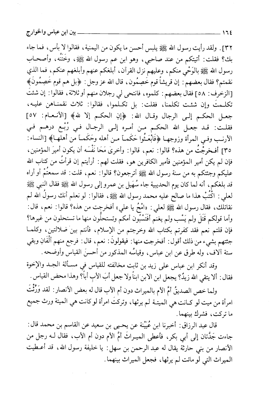 وَلَقَدْ رَأَيْتُ رَسُولَ اللَّهِ - صَلَّى اللَّهُ عَلَيْهِ وَسَلَّمَ - يَلْبَسُ أَحْسَنَ مَا يَكُونُ مِنْ الْيَمَنِيَّةِ، فَقَالُوا لَا بَأْسَ، فَمَا جَاءَ بِكَ؟ فَقُلْتُ: أَتَيْتُكُمْ مِنْ عِنْدِ صَاحِبِي، وَهُوَ ابْنُ عَمِّ رَسُولِ اللَّهِ - صَلَّى اللَّهُ عَلَيْهِ وَسَلَّمَ -، وَخَتَنُهُ، وَأَصْحَابُ رَسُولِ اللَّهِ - صَلَّى اللَّهُ عَلَيْهِ وَسَلَّمَ - بِالْوَحْيِ مِنْكُمْ، وَعَلَيْهِمْ نَزَلَ الْقُرْآنُ، أَبْلَغَكُمْ عَنْهُمْ وَأَبْلَغَهُمْ عَنْكُمْ، فَمَا الَّذِي نَقَمْتُمْ؟ فَقَالَ بَعْضُهُمْ: إنَّ قُرَيْشًا قَوْمٌ خَصِمُونَ، قَالَ اللَّهُ - عَزَّ وَجَلَّ -: {بَلْ هُمْ قَوْمٌ خَصِمُونَ} [الزخرف: 58] . فَقَالَ بَعْضُهُمْ: كَلِّمُوهُ، فَانْتَحَى لِي رَجُلَانِ مِنْهُمْ أَوْ ثَلَاثَةٌ، فَقَالُوا: إنْ شِئْتَ تَكَلَّمْتَ وَإِنْ شِئْتَ تَكَلَّمْنَا، فَقُلْتُ: بَلْ تَكَلَّمُوا، فَقَالُوا: ثَلَاثٌ نَقَمْنَاهُنَّ عَلَيْهِ، جَعَلَ الْحُكْمَ إلَى الرِّجَالِ وَقَالَ اللَّهُ: {إِنِ الْحُكْمُ إِلا لِلَّهِ} [الأنعام: 57] ، فَقُلْتُ: قَدْ جَعَلَ اللَّهُ الْحُكْمَ مِنْ أَمْرِهِ إلَى الرِّجَالِ فِي رُبْعِ دِرْهَمٍ فِي الْأَرْنَبِ وَفِي الْمَرْأَةِ وَزَوْجِهَا: {فَابْعَثُوا حَكَمًا مِنْ أَهْلِهِ وَحَكَمًا مِنْ أَهْلِهَا} [النساء: 35] ، أَفَخَرَجْتُ مِنْ هَذِهِ؟ قَالُوا: نَعَمْ، قَالُوا: وَأُخْرَى مَحَا نَفْسَهُ أَنْ يَكُونَ أَمِيرَ الْمُؤْمِنِينَ، فَإِنْ لَمْ يَكُنْ أَمِيرَ الْمُؤْمِنِينَ فَأَمِيرُ الْكَافِرِينَ هُوَ، فَقُلْتُ لَهُمْ: أَرَأَيْتُمْ إنْ قَرَأْتُ مِنْ كِتَابِ اللَّهِ عَلَيْكُمْ وَجِئْتُكُمْ بِهِ مِنْ سُنَّةِ رَسُولِ اللَّهِ - صَلَّى اللَّهُ عَلَيْهِ وَسَلَّمَ - أَتَرْجِعُونَ؟ قَالُوا: نَعَمْ، قُلْتُ: قَدْ سَمِعْتُمْ أَوْ أَرَاهُ قَدْ بَلَّغَكُمْ، أَنَّهُ لَمَّا كَانَ يَوْمَ الْحُدَيْبِيَةِ جَاءَ سُهَيْلُ بْنُ عَمْرٍو إلَى رَسُولِ اللَّهِ - صَلَّى اللَّهُ عَلَيْهِ وَسَلَّمَ - فَقَالَ النَّبِيُّ - صَلَّى اللَّهُ عَلَيْهِ وَسَلَّمَ - لِعَلِيٍّ: اُكْتُبْ: هَذَا مَا صَالَحَ عَلَيْهِ مُحَمَّدٌ رَسُولُ اللَّهِ - صَلَّى اللَّهُ عَلَيْهِ وَسَلَّمَ -، فَقَالُوا: لَوْ نَعْلَمُ أَنَّكَ رَسُولُ اللَّهِ لَمْ نُقَاتِلْكَ، فَقَالَ رَسُولُ اللَّه - صَلَّى اللَّهُ عَلَيْهِ وَسَلَّمَ - لِعَلِيٍّ: " اُمْحُ يَا عَلِيُّ " أَفَخَرَجْتُ مِنْ هَذِهِ؟ قَالُوا: نَعَمْ، قَالَ: وَأَمَّا قَوْلُكُمْ قَتَلَ وَلَمْ يَسْبِ وَلَمْ يَغْنَمْ أَفَتَسْبُونَ أُمَّكُمْ وَتَسْتَحِلُّونَ مِنْهَا مَا تَسْتَحِلُّونَ مِنْ غَيْرِهَا؟ فَإِنْ قُلْتُمْ نَعَمْ فَقَدْ كَفَرْتُمْ بِكِتَابِ اللَّهِ وَخَرَجْتُمْ مِنْ الْإِسْلَامِ، فَأَنْتُمْ بَيْنَ ضَلَالَتَيْنِ، وَكُلَّمَا جِئْتُهُمْ بِشَيْءٍ مِنْ ذَلِكَ أَقُولُ: أَفَخَرَجْتُ مِنْهَا: فَيَقُولُونَ: نَعَمْ، قَالَ: فَرَجَعَ مِنْهُمْ أَلْفَانِ وَبَقِيَ سِتَّةُ آلَافٍ، وَلَهُ طُرُقٌ عَنْ ابْنِ عَبَّاسٍ، وَقِيَاسُهُ الْمَذْكُورُ مِنْ أَحْسَنِ الْقِيَاسِ وَأَوْضَحُهُ. وَقَدْ أَنْكَرَ ابْنُ عَبَّاسٍ عَلَى زَيْدِ بْنِ ثَابِتٍ مُخَالَفَتَهُ لِلْقِيَاسِ فِي مَسْأَلَةِ الْجَدِّ وَالْإِخْوَةِ فَقَالَ: أَلَا يَتَّقِي اللَّهَ زَيْدٌ؟ يَجْعَلُ ابْنَ الِابْنِ ابْنًا وَلَا جَعَلَ أَبَ الْأَبِ أَبًا؟ وَهَذَا مَحْضُ الْقِيَاسِ.