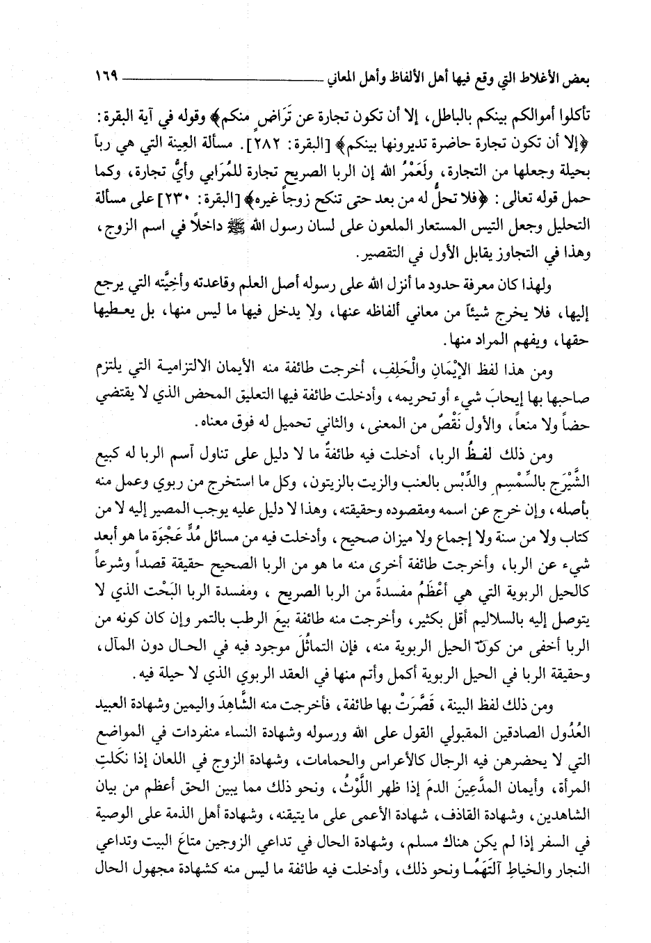 وَمِنْ ذَلِكَ لَفْظُ الرِّبَا، أَدْخَلَتْ فِيهِ طَائِفَةٌ مَا لَا دَلِيلَ عَلَى تَنَاوُلِ اسْمِ الرِّبَا لَهُ كَبَيْعِ الشَّيْرَجِ بِالسِّمْسِمِ وَالدِّبْسِ بِالْعِنَبِ وَالزَّيْتِ بِالزَّيْتُونِ، وَكُلُّ مَا اُسْتُخْرِجَ مِنْ رِبَوِيٍّ وَعُمِلَ مِنْهُ بِأَصْلِهِ، وَإِنْ خَرَجَ عَنْ اسْمِهِ وَمَقْصُودِهِ وَحَقِيقَتِهِ، وَهَذَا لَا دَلِيلَ عَلَيْهِ يُوجِبُ الْمَصِيرَ إلَيْهِ لَا مِنْ كِتَابٍ وَلَا مِنْ سُنَّةٍ وَلَا إجْمَاعٍ وَلَا مِيزَانٍ صَحِيحٍ، وَأَدْخَلَتْ فِيهِ مِنْ مَسَائِلِ مُدِّ عَجْوَةٍ مَا هُوَ أَبْعَدُ شَيْءٍ عَنْ الرِّبَا. وَأَخْرَجَتْ طَائِفَةٌ أُخْرَى مِنْهُ مَا هُوَ مِنْ الرِّبَا الصَّحِيحِ حَقِيقَةً قَصْدًا وَشَرْعًا كَالْحِيَلِ الرِّبَوِيَّةِ الَّتِي هِيَ أَعْظَمُ مَفْسَدَةً مِنْ الرِّبَا الصَّرِيحِ، وَمَفْسَدَةُ الرِّبَا الْبَحْتِ الَّذِي لَا يُتَوَصَّلُ إلَيْهِ بِالسَّلَالِيمِ أَقَلُّ بِكَثِيرٍ، وَأَخْرَجَتْ مِنْهُ طَائِفَةٌ بَيْعَ الرُّطَبِ بِالتَّمْرِ وَإِنْ كَانَ كَوْنُهُ مِنْ الرِّبَا أَخْفَى مِنْ كَوْنِ الْحِيَلِ الرِّبَوِيَّةِ مِنْهُ، فَإِنَّ التَّمَاثُلَ مَوْجُودٌ فِيهِ فِي الْحَالِ دُونَ الْمَآلِ، وَحَقِيقَةُ الرِّبَا فِي الْحِيَلِ الرِّبَوِيَّةِ أَكْمَلُ وَأَتَمُّ مِنْهَا فِي الْعَقْدِ الرِّبَوِيِّ الَّذِي لَا حِيلَةَ فِيهِ.