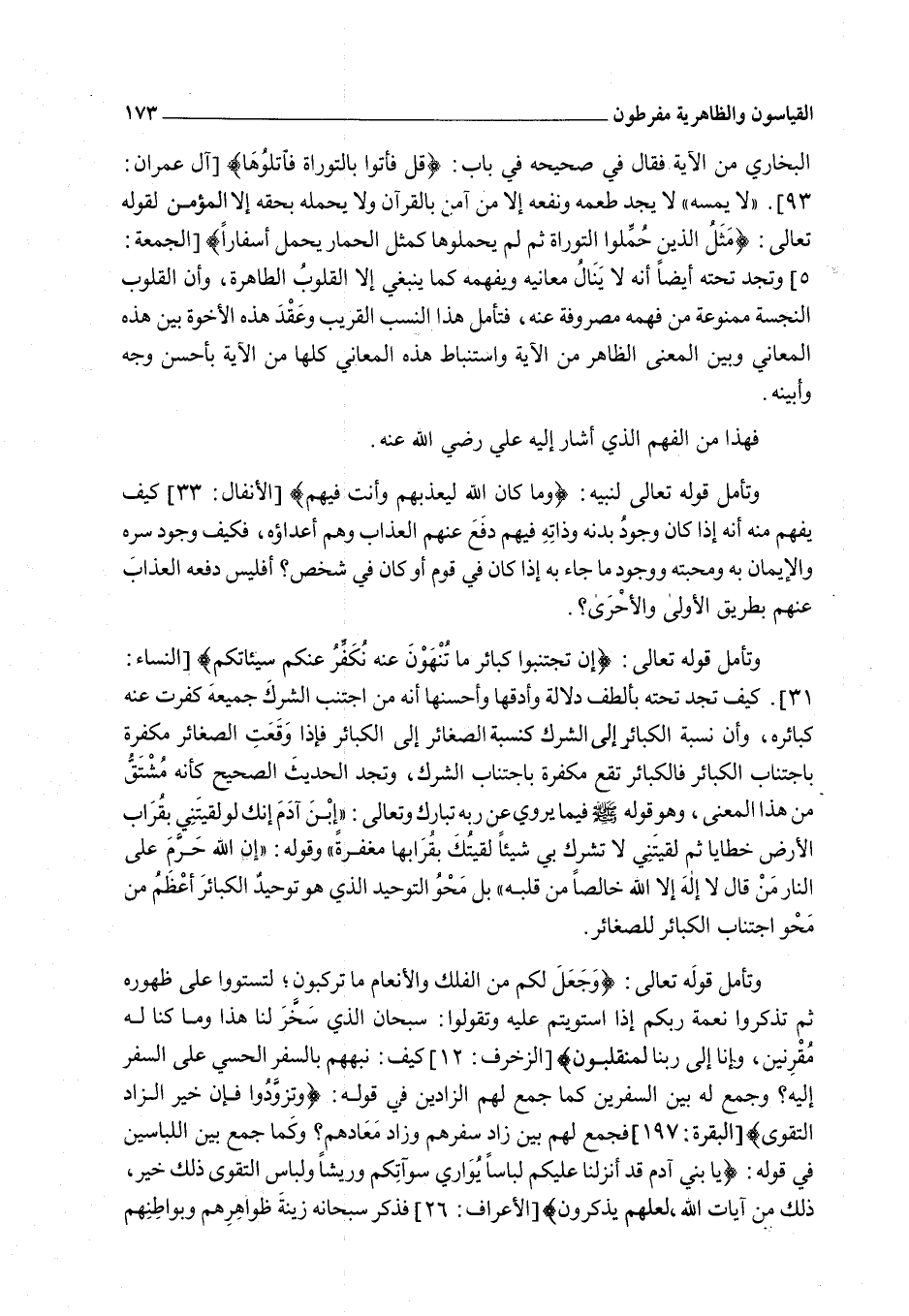 الْبُخَارِيَّ مِنْ الْآيَةِ فَقَالَ فِي صَحِيحِهِ فِي بَابِ: {قُلْ فَأْتُوا بِالتَّوْرَاةِ فَاتْلُوهَا} [آل عمران: 93] : " لَا يَمَسُّهُ " لَا يَجِدُ طَعْمَهُ وَنَفْعَهُ إلَّا مَنْ آمَنَ بِالْقُرْآنِ وَلَا يَحْمِلُهُ بِحَقِّهِ إلَّا الْمُؤْمِنُ لِقَوْلِهِ تَعَالَى: {مَثَلُ الَّذِينَ حُمِّلُوا التَّوْرَاةَ ثُمَّ لَمْ يَحْمِلُوهَا كَمَثَلِ الْحِمَارِ يَحْمِلُ أَسْفَارًا} [الجمعة: 5] ، وَتَجِدُ تَحْتَهُ أَيْضًا أَنَّهُ لَا يَنَالُ مَعَانِيَهُ وَيَفْهَمُهُ كَمَا يَنْبَغِي إلَّا الْقُلُوبُ الطَّاهِرَةُ، وَأَنَّ الْقُلُوبَ النَّجِسَةَ مَمْنُوعَةٌ مِنْ فَهْمِهِ مَصْرُوفَةٌ عَنْهُ، فَتَأَمَّلْ هَذَا النَّسَبَ الْقَرِيبَ وَعَقْدَ هَذِهِ الْأُخُوَّةِ بَيْنَ هَذِهِ الْمَعَانِي وَبَيْنَ الْمَعْنَى الظَّاهِرِ مِنْ الْآيَةِ وَاسْتِنْبَاطُ هَذِهِ الْمَعَانِي كُلِّهَا مِنْ الْآيَةِ بِأَحْسَنِ وَجْهٍ وَأَبْيَنِهِ.