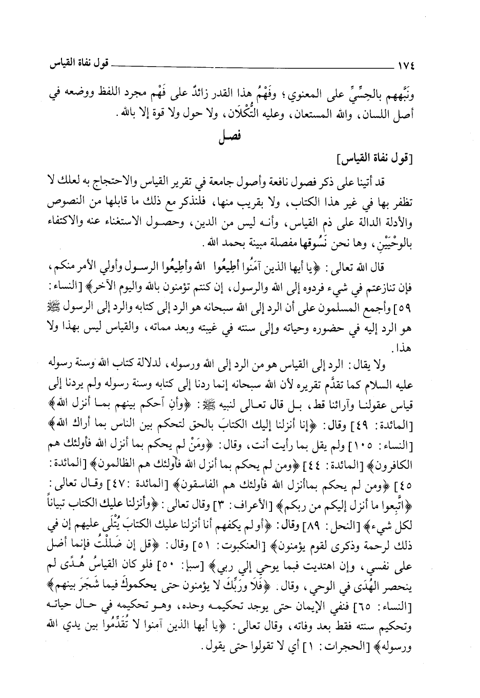وَلَا يُقَالُ: الرَّدُّ إلَى الْقِيَاسِ هُوَ مِنْ الرَّدِّ إلَى اللَّهِ وَرَسُولِهِ، لِدَلَالَةِ كِتَابِ اللَّهِ وَسُنَّةِ رَسُولِهِ - عَلَيْهِ السَّلَامُ - كَمَا تَقَدَّمَ تَقْرِيرُهُ؛ لِأَنَّ اللَّهَ - سُبْحَانَهُ - إنَّمَا رَدَّنَا إلَى كِتَابِهِ وَسُنَّةِ رَسُولِهِ وَلَمْ يَرُدَّنَا إلَى قِيَاسِ عُقُولِنَا وَآرَائِنَا قَطُّ، بَلْ قَالَ - تَعَالَى - لِنَبِيِّهِ - صَلَّى اللَّهُ عَلَيْهِ وَسَلَّمَ -: {وَأَنِ احْكُمْ بَيْنَهُمْ بِمَا أَنْزَلَ اللَّهُ} [المائدة: 49] ، وَقَالَ: {إِنَّا أَنْزَلْنَا إِلَيْكَ الْكِتَابَ بِالْحَقِّ لِتَحْكُمَ بَيْنَ النَّاسِ بِمَا أَرَاكَ اللَّهُ} [النساء: 105] ، وَلَمْ يَقُلْ بِمَا رَأَيْتَ أَنْتَ، وَقَالَ: {وَمَنْ لَمْ يَحْكُمْ بِمَا أَنْزَلَ اللَّهُ فَأُولَئِكَ هُمُ الْكَافِرُونَ} [المائدة: 44] ، {وَمَنْ لَمْ يَحْكُمْ بِمَا أَنْزَلَ اللَّهُ فَأُولَئِكَ هُمُ الظَّالِمُونَ} [المائدة: 45] ، {وَمَنْ لَمْ يَحْكُمْ بِمَا أَنْزَلَ اللَّهُ فَأُولَئِكَ هُمُ الْفَاسِقُونَ} [المائدة: 47] ، وَقَالَ - تَعَالَى -: {اتَّبِعُوا مَا أُنْزِلَ إِلَيْكُمْ مِنْ رَبِّكُمْ} [الأعراف: 3] ، وَقَالَ - تَعَالَى -: {وَنَزَّلْنَا عَلَيْكَ الْكِتَابَ تِبْيَانًا لِكُلِّ شَيْءٍ} [النحل: 89] وَقَالَ: {أَوَلَمْ يَكْفِهِمْ أَنَّا أَنْزَلْنَا عَلَيْكَ الْكِتَابَ يُتْلَى عَلَيْهِمْ إِنَّ فِي ذَلِكَ لَرَحْمَةً وَذِكْرَى لِقَوْمٍ يُؤْمِنُونَ} [العنكبوت: 51] ، وَقَالَ: {قُلْ إِنْ ضَلَلْتُ فَإِنَّمَا أَضِلُّ عَلَى نَفْسِي وَإِنِ اهْتَدَيْتُ فَبِمَا يُوحِي إِلَيَّ رَبِّي} [سبأ: 50] ، فَلَوْ كَانَ الْقِيَاسُ هُدًى لَمْ يَنْحَصِرْ الْهُدَى فِي الْوَحْيِ، وَقَالَ: {فَلا وَرَبِّكَ لا يُؤْمِنُونَ حَتَّى يُحَكِّمُوكَ فِيمَا شَجَرَ بَيْنَهُمْ} [النساء: 65] ، فَنَفَى الْإِيمَانَ حَتَّى يُوجَدَ تَحْكِيمُهُ وَحْدَهُ، وَهُوَ تَحْكِيمُهُ فِي حَالِ حَيَاتِهِ وَتَحْكِيمُ سُنَّتِهِ فَقَطْ بَعْدَ وَفَاتِهِ، وَقَالَ - تَعَالَى -: {يَا أَيُّهَا الَّذِينَ آمَنُوا لا تُقَدِّمُوا بَيْنَ يَدَيِ اللَّهِ وَرَسُولِهِ} [الحجرات: 1] ، أَيْ لَا تَقُولُوا حَتَّى يَقُولَ.