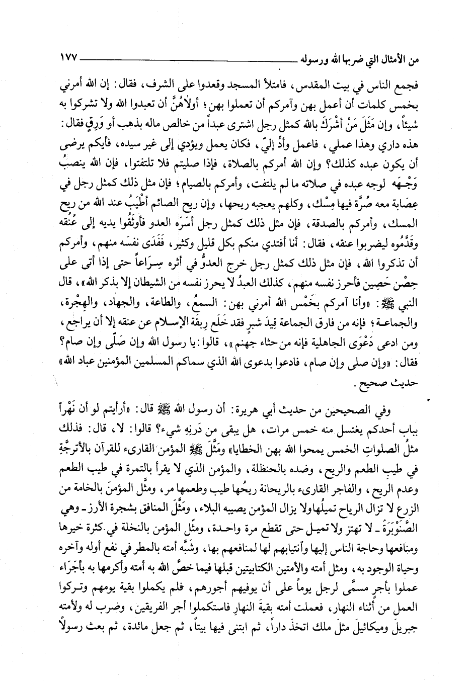وَفِي الصَّحِيحَيْنِ مِنْ حَدِيثِ أَبِي هُرَيْرَةَ: أَنَّ رَسُولَ اللَّهِ - صَلَّى اللَّهُ عَلَيْهِ وَسَلَّمَ - قَالَ: «أَرَأَيْتُمْ لَوْ أَنَّ نَهْرًا بِبَابِ أَحَدِكُمْ يَغْتَسِلُ مِنْهُ خَمْسَ مَرَّاتٍ، هَلْ يَبْقَى مِنْ دَرَنِهِ شَيْءٌ؟ قَالُوا: لَا، قَالَ: فَذَلِكَ مَثَلُ الصَّلَوَاتِ الْخَمْسِ يَمْحُوَا اللَّهُ بِهِنَّ الْخَطَايَا وَمَثَّلَ - صَلَّى اللَّهُ عَلَيْهِ وَسَلَّمَ - الْمُؤْمِنَ الْقَارِئَ لِلْقُرْآنِ بِالْأُتْرُجَّةِ فِي طِيبِ الطَّعْمِ وَالرِّيحِ، وَضِدَّهُ بِالْحَنْظَلَةِ، وَالْمُؤْمِنَ الَّذِي لَا يَقْرَأُ بِالتَّمْرَةِ فِي طِيبِ الطَّعْمِ وَعَدَمِ الرِّيحِ، وَالْفَاجِرَ الْقَارِئَ بِالرَّيْحَانَةِ رِيحُهَا طَيِّبٌ وَطَعْمُهَا مُرٌّ، وَمَثَّلَ الْمُؤْمِنَ بِالْخَامَةِ مِنْ الزَّرْعِ لَا تَزَالُ الرِّيَاحُ تُمِيلُهَا وَلَا يَزَالُ الْمُؤْمِنُ يُصِيبُهُ الْبَلَاءُ، وَمَثَّلَ الْمُنَافِقَ بِشَجَرَةِ الْأَرْزِ - وَهِيَ الصَّنَوْبَرَةُ - لَا تَهْتَزُّ وَلَا تَمِيلُ حَتَّى تُقْطَعَ مَرَّةً وَاحِدَةً، وَمَثَّلَ الْمُؤْمِنَ بِالنَّخْلَةِ فِي كَثْرَةِ خَيْرِهَا وَمَنَافِعِهَا وَحَاجَةِ النَّاسِ إلَيْهَا وَانْتِيَابِهِمْ لَهَا لِمَنَافِعِهِمْ بِهَا، وَشَبَّهَ أُمَّتَهُ بِالْمَطَرِ فِي نَفْعِ أَوَّلِهِ وَآخِرِهِ وَحَيَاةِ الْوُجُودِ بِهِ، وَمَثَّلَ أُمَّتَهُ وَالْأُمَّتَيْنِ الْكِتَابِيَّتَيْنِ قَبْلَهَا فِيمَا خَصَّ اللَّهُ بِهِ أُمَّتَهُ وَأَكْرَمَهَا بِهِ بِأُجَرَاءَ عَمِلُوا بِأَجْرٍ مُسَمًّى لِرَجُلٍ يَوْمًا عَلَى أَنْ يُوَفِّيَهُمْ أُجُورَهُمْ، فَلَمْ يُكْمِلُوا بَقِيَّةَ يَوْمِهِمْ وَتَرَكُوا الْعَمَلَ مِنْ أَثْنَاءِ النَّهَارِ، فَعَمِلَتْ أُمَّتُهُ بَقِيَّةَ النَّهَارِ فَاسْتَكْمَلُوا أَجْرَ الْفَرِيقَيْنِ، وَضَرَبَ لَهُ وَلِأُمَّتِهِ جِبْرِيلُ وَمِيكَائِيلُ مَثَلَ مَلِكٍ اتَّخَذَ دَارًا، ثُمَّ ابْتَنَى فِيهَا بَيْتًا، ثُمَّ جَعَلَ مَائِدَةً، ثُمَّ بَعَثَ رَسُولًا