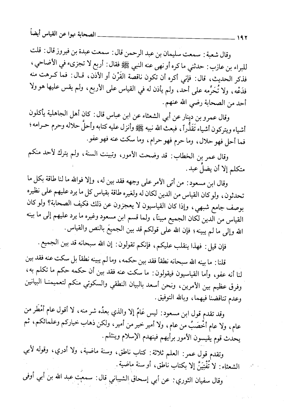 وَقَالَ ابْنُ مَسْعُودٍ: مَنْ أَتَى الْأَمْرَ عَلَى وَجْهِهِ فَقَدْ بُيِّنَ لَهُ، وَإِلَّا فَوَاَللَّهِ مَا لَنَا طَاقَةٌ بِكُلِّ مَا تُحْدِثُونَ، وَلَوْ كَانَ الْقِيَاسُ مِنْ الدَّيْنِ لَكَانَ لَهُ وَلِغَيْرِهِ طَاقَةٌ بِقِيَاسِ كُلِّ مَا يَرِدُ عَلَيْهِمْ عَلَى نَظِيرِهِ بِوَصْفٍ جَامِعٍ شَبَهِيٍّ، وَإِذَا كَانَ الْقِيَاسِيُّونَ لَا يَعْجِزُونَ عَنْ ذَلِكَ فَكَيْفَ الصَّحَابَةُ؟ وَلَوْ كَانَ الْقِيَاسُ مِنْ الدِّينِ لَكَانَ الْجَمِيعُ مُبَيَّنًا، وَلَمَّا قَسَمَ ابْنُ مَسْعُودٍ وَغَيْرُهُ مَا يَرِدُ عَلَيْهِمْ إلَى مَا بَيَّنَهُ اللَّهُ وَإِلَى مَا لَمْ يُبَيِّنْهُ؛ فَإِنَّ اللَّهَ عَلَى قَوْلِكُمْ قَدْ بَيَّنَ الْجَمِيعَ بِالنَّصِّ وَالْقِيَاسِ.