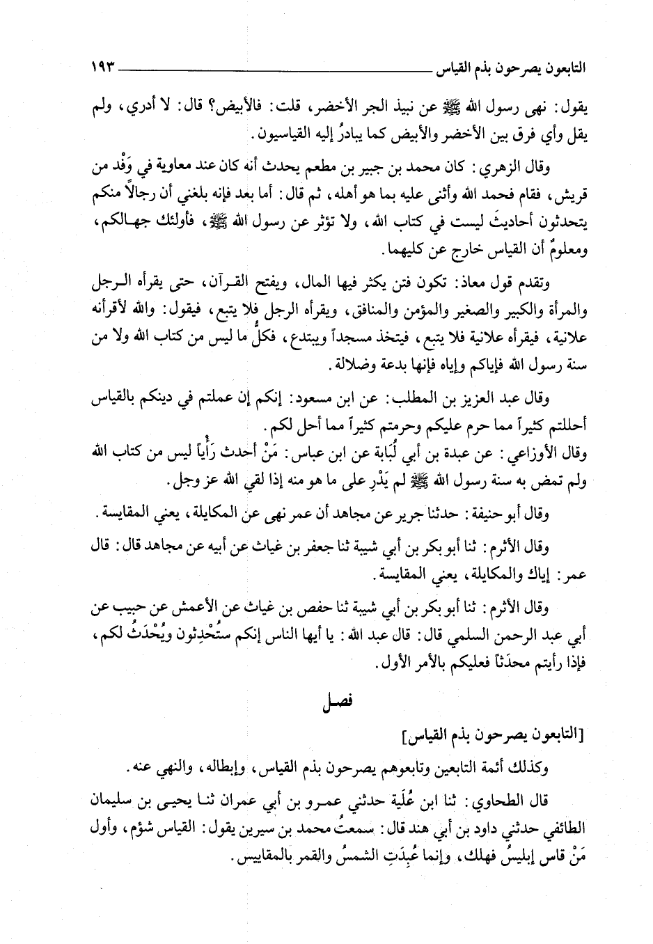 وَكَذَلِكَ أَئِمَّةُ التَّابِعِينَ وَتَابِعُوهُمْ يُصَرِّحُونَ بِذَمِّ الْقِيَاسِ، وَإِبْطَالِهِ، وَالنَّهْيِ عَنْهُ