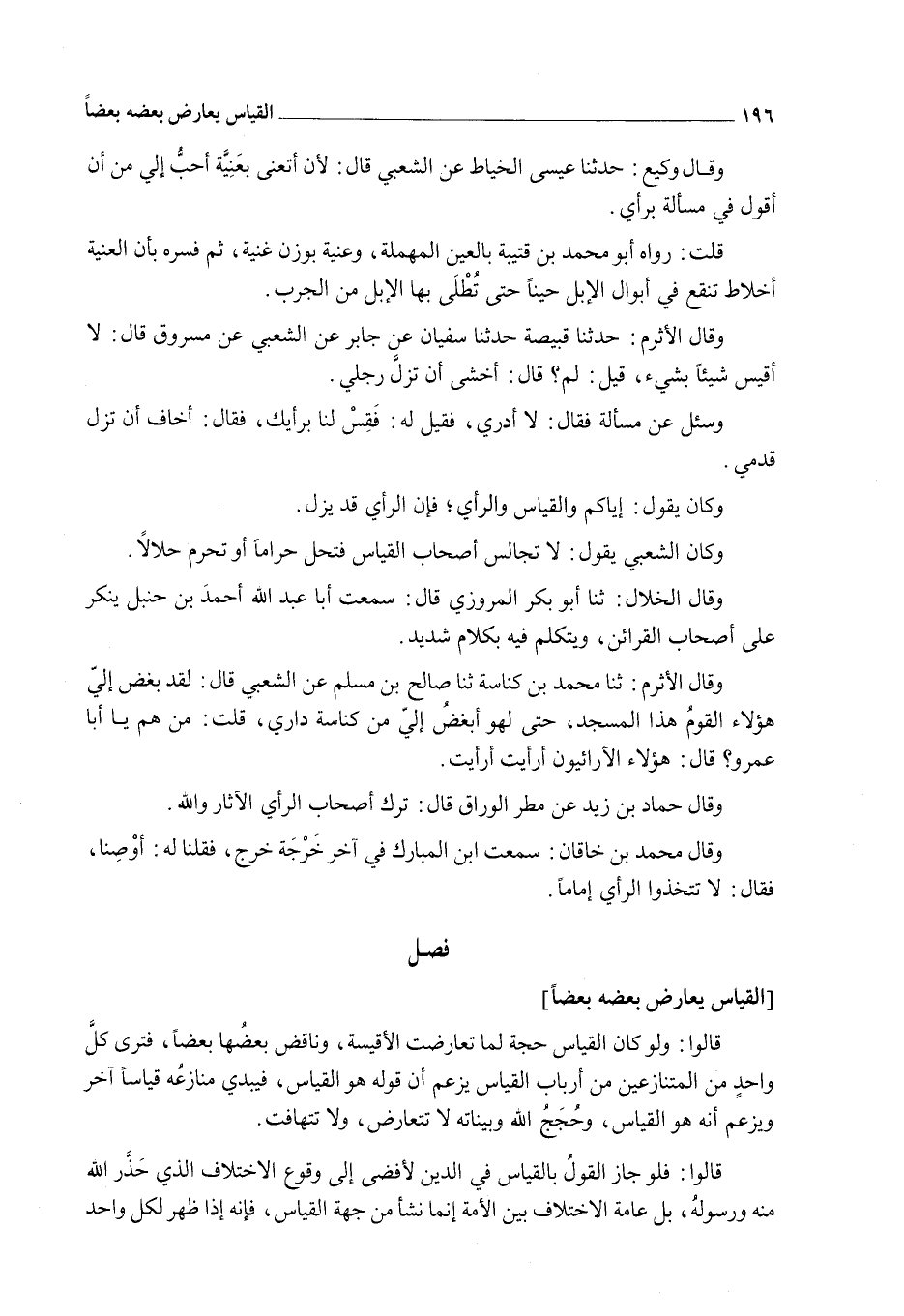 . وَكَانَ الشَّعْبِيُّ يَقُولُ: لَا تُجَالِسْ أَصْحَابَ الْقِيَاسِ فَتُحِلَّ حَرَامًا أَوْ تُحَرِّمَ حَلَالًا.