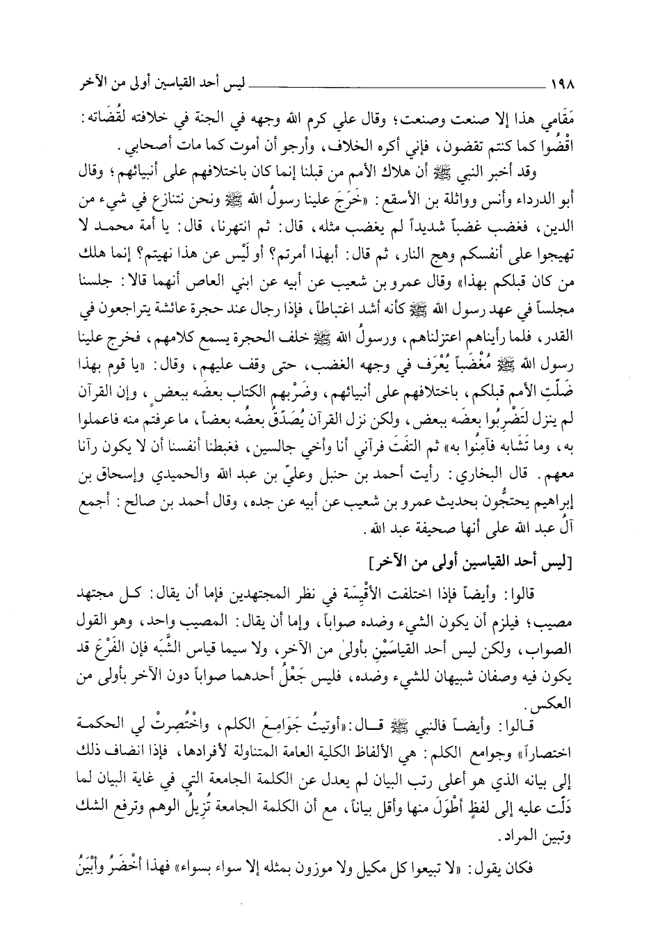 وَقَدْ أَخْبَرَ النَّبِيُّ - صَلَّى اللَّهُ عَلَيْهِ وَسَلَّمَ - أَنَّ هَلَاكَ الْأُمَمِ مِنْ قَبْلِنَا إنَّمَا كَانَ بِاخْتِلَافِهِمْ عَلَى أَنْبِيَائِهِمْ، وَقَالَ أَبُو الدَّرْدَاءِ وَأَنَسٌ وَوَاثِلَةُ بْنُ الْأَسْقَعِ: «خَرَجَ عَلَيْنَا رَسُولُ اللَّهِ - صَلَّى اللَّهُ عَلَيْهِ وَسَلَّمَ - وَنَحْنُ نَتَنَازَعُ فِي شَيْءٍ مِنْ الدِّينِ، فَغَضِبَ غَضَبًا شَدِيدًا لَمْ يَغْضَبْ مِثْلَهُ، قَالَ: ثُمَّ انْتَهَرَنَا، قَالَ: يَا أُمَّةَ مُحَمَّدٍ لَا تُهَيِّجُوا عَلَى أَنْفُسِكُمْ وَهَجَ النَّارِ، ثُمَّ قَالَ: أَبِهَذَا أُمِرْتُمْ؟ أَوَ لَيْسَ عَنْ هَذَا نُهِيتُمْ؟ إنَّمَا هَلَكَ مَنْ كَانَ قَبْلَكُمْ بِهَذَا» وَقَالَ عَمْرُو بْنُ شُعَيْبٍ عَنْ أَبِيهِ عَنْ ابْنَيْ الْعَاصِ أَنَّهُمَا قَالَا: «جَلَسْنَا مَجْلِسًا فِي عَهْدِ رَسُولِ اللَّهِ - صَلَّى اللَّهُ عَلَيْهِ وَسَلَّمَ - كَأَنَّهُ أَشَدُّ اغْتِبَاطًا، فَإِذَا رِجَالٌ عِنْدَ حُجْرَةِ عَائِشَةَ يَتَرَاجَعُونَ فِي الْقَدَرِ، فَلَمَّا رَأَيْنَاهُمْ اعْتَزَلْنَاهُمْ، وَرَسُولُ اللَّهِ - صَلَّى اللَّهُ عَلَيْهِ وَسَلَّمَ - خَلْفَ الْحُجْرَةِ يَسْمَعُ كَلَامَهُمْ، فَخَرَجَ عَلَيْنَا رَسُولُ اللَّهِ - صَلَّى اللَّهُ عَلَيْهِ وَسَلَّمَ - مُغْضَبًا يُعْرَفُ فِي وَجْهِهِ الْغَضَبُ، حَتَّى وَقَفَ عَلَيْهِمْ، وَقَالَ: يَا قَوْمِ بِهَذَا ضَلَّتْ الْأُمَمُ قَبْلَكُمْ، بِاخْتِلَافِهِمْ عَلَى أَنْبِيَائِهِمْ، وَضَرْبِهِمْ الْكِتَابَ بَعْضَهُ بِبَعْضٍ، وَإِنَّ الْقُرْآنَ لَمْ يَنْزِلْ لِتَضْرِبُوا بَعْضَهُ بِبَعْضٍ، وَلَكِنْ نَزَلَ الْقُرْآنُ يُصَدِّقُ بَعْضُهُ بَعْضًا، مَا عَرَفْتُمْ مِنْهُ فَاعْمَلُوا بِهِ، وَمَا تَشَابَهَ فَآمِنُوا بِهِ ثُمَّ الْتَفَتَ فَرَآنِي أَنَا وَأَخِي جَالِسَيْنِ، فَغَبَطْنَا أَنْفُسَنَا أَنْ لَا يَكُونَ رَآنَا مَعَهُمْ» . قَالَ الْبُخَارِيُّ: رَأَيْتُ أَحْمَدَ بْنَ حَنْبَلٍ وَعَلِيَّ بْنَ عَبْدِ اللَّهِ وَالْحُمَيْدِيَّ وَإِسْحَاقَ بْنَ إبْرَاهِيمَ يَحْتَجُّونَ بِحَدِيثِ عَمْرِو بْنِ شُعَيْبٍ عَنْ أَبِيهِ عَنْ جَدِّهِ، وَقَالَ أَحْمَدُ بْنُ صَالِحٍ: أَجْمَعَ آلُ عَبْدِ اللَّهِ عَلَى أَنَّهَا صَحِيفَةُ عَبْدِ اللَّهِ.