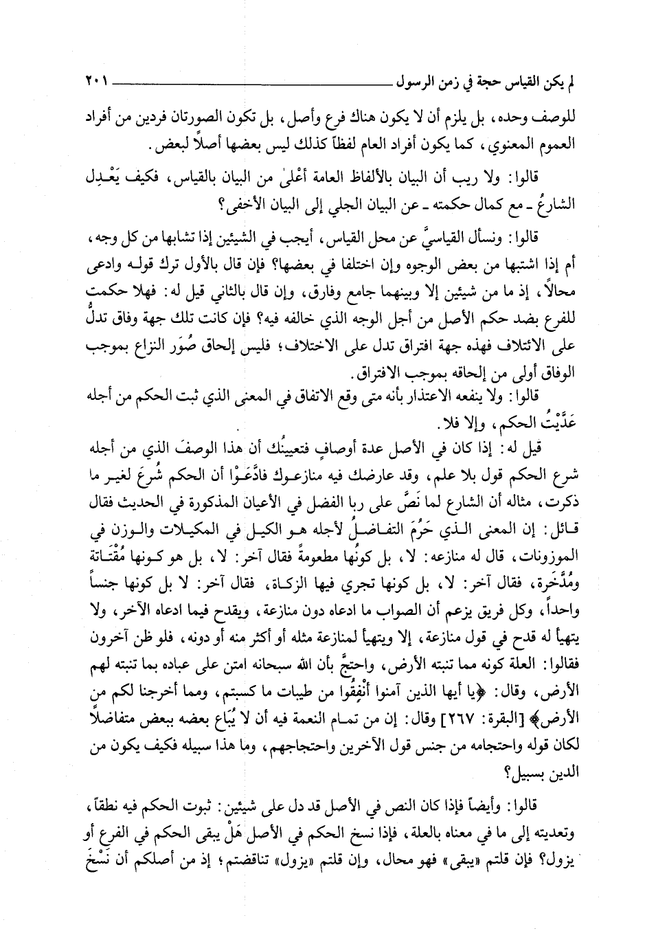 قَالُوا: وَلَا رَيْبَ أَنَّ الْبَيَانَ بِالْأَلْفَاظِ الْعَامَّةِ أَعْلَى مِنْ الْبَيَانِ بِالْقِيَاسِ، فَكَيْفَ يَعْدِلُ الشَّارِعُ - مَعَ كَمَالِ حِكْمَتِهِ - عَنْ الْبَيَانِ الْجَلِيِّ إلَى الْبَيَانِ الْأَخْفَى؟ قَالُوا: وَنَسْأَلُ الْقِيَاسِيَّ عَنْ مَحَلِّ الْقِيَاسِ، أَيَجِبُ فِي الشَّيْئَيْنِ إذَا تَشَابَهَا مِنْ كُلِّ وَجْهٍ، أَمْ إذَا اشْتَبَهَا مِنْ بَعْضِ الْوُجُوهِ وَإِنْ اخْتَلَفَا فِي بَعْضِهَا؟ فَإِنْ قَالَ بِالْأَوَّلِ تَرَكَ قَوْلَهُ وَادَّعَى مُحَالًا، إذْ مَا مِنْ شَيْئَيْنِ إلَّا وَبَيْنَهُمَا جَامِعٌ وَفَارِقٌ، وَإِنْ قَالَ بِالثَّانِي قِيلَ لَهُ: فَهَلَّا حَكَمْتَ لِلْفَرْعِ بِضِدِّ حُكْمِ الْأَصْلِ مِنْ أَجْلِ الْوَجْهِ الَّذِي خَالَفَهُ فِيهِ؟ فَإِنْ كَانَتْ تِلْكَ جِهَةَ وِفَاقٍ تَدُلُّ عَلَى الِائْتِلَافِ فَهَذِهِ جِهَةُ افْتِرَاقٍ تَدُلُّ عَلَى الِاخْتِلَافِ؛ فَلَيْسَ إلْحَاقُ صُوَرِ النِّزَاعِ بِمُوجَبِ الْوِفَاقِ أَوْلَى مِنْ إلْحَاقِهِ بِمُوجَبِ الِافْتِرَاقِ.