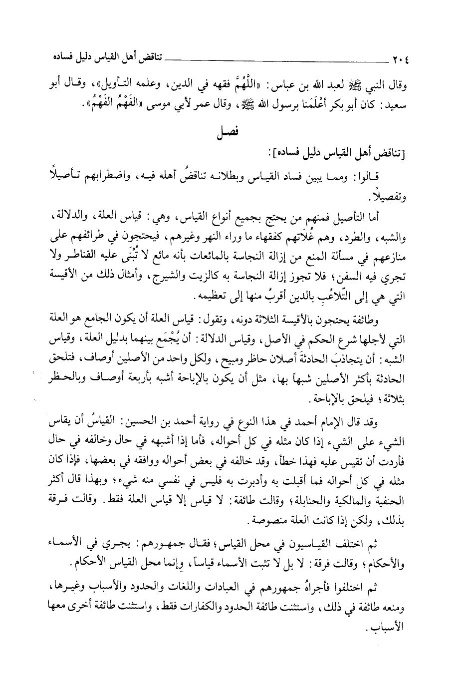 وَقَدْ قَالَ الْإِمَامُ أَحْمَدُ فِي هَذَا النَّوْعِ فِي رِوَايَةِ أَحْمَدَ بْنِ الْحُسَيْنِ: الْقِيَاسُ أَنْ يُقَاسَ الشَّيْءُ عَلَى الشَّيْءِ إذَا كَانَ مِثْلَهُ فِي كُلِّ أَحْوَالِهِ، فَأَمَّا إذَا أَشْبَهَهُ فِي حَالٍ وَخَالَفَهُ فِي حَالٍ فَأَرَدْتَ أَنْ تَقِيسَ عَلَيْهِ فَهَذَا خَطَأٌ، وَقَدْ خَالَفَهُ فِي بَعْضِ أَحْوَالِهِ وَوَافَقَهُ فِي بَعْضِهَا، فَإِذَا كَانَ مِثْلَهُ فِي كُلِّ أَحْوَالِهِ فَمَا أَقْبَلْتَ بِهِ وَأَدْبَرْتَ بِهِ فَلَيْسَ فِي نَفْسِي مِنْهُ شَيْءٌ؛ وَبِهَذَا قَالَ أَكْثَرُ الْحَنَفِيَّةِ وَالْمَالِكِيَّةِ وَالْحَنَابِلَةِ. وَقَالَتْ طَائِفَةٌ: لَا قِيَاسَ إلَّا قِيَاسُ الْعِلَّةِ فَقَطْ. وَقَالَتْ فِرْقَةٌ بِذَلِكَ، وَلَكِنْ إذَا كَانَتْ الْعِلَّةُ مَنْصُوصَةً. .