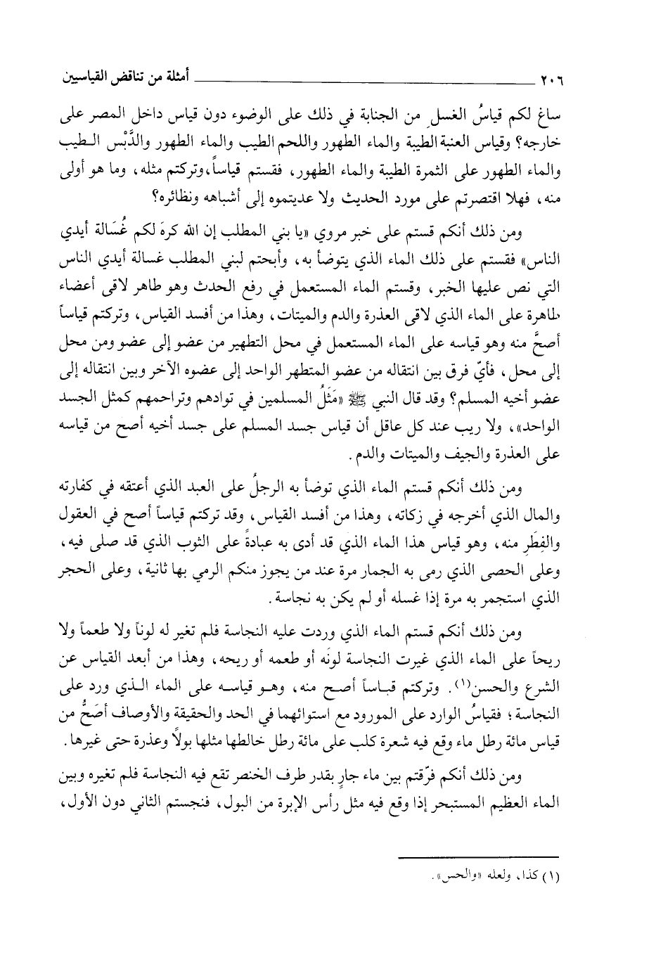 وَمِنْ ذَلِكَ أَنَّكُمْ قِسْتُمْ عَلَى خَبَرٍ مَرْوِيٍّ «يَا بَنِي الْمُطَّلِبِ إنَّ اللَّهَ كَرِهَ لَكُمْ غُسَالَةَ أَيْدِي النَّاسِ» فَقِسْتُمْ عَلَى ذَلِكَ الْمَاءَ الَّذِي يُتَوَضَّأُ بِهِ، وَأَبَحْتُمْ لِبَنِي الْمُطَّلِبِ غُسَالَةَ أَيْدِي النَّاسِ الَّتِي نَصَّ عَلَيْهَا الْخَبَرُ، وَقِسْتُمْ الْمَاءَ الْمُسْتَعْمَلَ فِي رَفْعِ الْحَدَثِ وَهُوَ طَاهِرٌ لَاقَى أَعْضَاءً طَاهِرَةً عَلَى الْمَاءِ الَّذِي لَاقَى الْعَذِرَةَ وَالدَّمَ وَالْمَيْتَاتِ، وَهَذَا مِنْ أَفْسَدِ الْقِيَاسِ، وَتَرَكْتُمْ قِيَاسًا أَصَحَّ مِنْهُ وَهُوَ قِيَاسُهُ عَلَى الْمَاءِ الْمُسْتَعْمَلِ فِي مَحَلِّ التَّطْهِيرِ مِنْ عُضْوٍ إلَى عُضْوٍ وَمِنْ مَحَلٍّ إلَى مَحَلٍّ، فَأَيُّ فَرْقٍ بَيْنَ انْتِقَالِهِ مِنْ عُضْوِ الْمُتَطَهِّرِ الْوَاحِدِ إلَى عُضْوِهِ الْآخَرِ وَبَيْنَ انْتِقَالِهِ إلَى عُضْوِ أَخِيهِ الْمُسْلِمِ؟ وَقَدْ قَالَ النَّبِيُّ - صَلَّى اللَّهُ عَلَيْهِ وَسَلَّمَ - «مَثَلُ الْمُسْلِمِينَ فِي تَوَادِّهِمْ وَتَرَاحُمِهِمْ كَمَثَلِ الْجَسَدِ الْوَاحِدِ» ، وَلَا رَيْبَ عِنْدَ كُلِّ عَاقِلٍ أَنَّ قِيَاسَ جَسَدِ الْمُسْلِمِ عَلَى جَسَدِ أَخِيهِ أَصَحُّ مِنْ قِيَاسِهِ عَلَى الْعَذِرَةِ وَالْجِيَفِ وَالْمَيْتَاتِ وَالدَّمِ.
