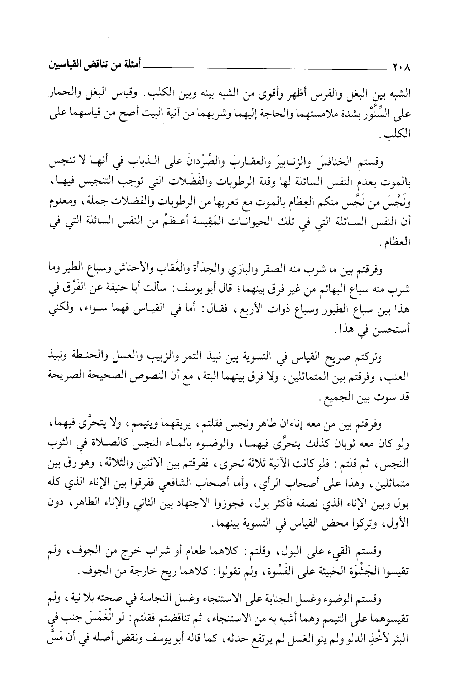 وَتَرَكْتُمْ صَرِيحَ الْقِيَاسِ فِي التَّسْوِيَةِ بَيْنَ نَبِيذِ التَّمْرِ وَالزَّبِيبِ وَالْعَسَلِ وَالْحِنْطَةِ وَنَبِيذِ الْعِنَبِ، وَفَرَّقْتُمْ بَيْنَ الْمُتَمَاثِلَيْنِ، وَلَا فَرْقَ بَيْنَهُمَا أَلْبَتَّةَ، مَعَ أَنَّ النُّصُوصَ الصَّحِيحَةَ الصَّرِيحَةَ قَدْ سَوَّتْ بَيْنَ الْجَمِيعِ.