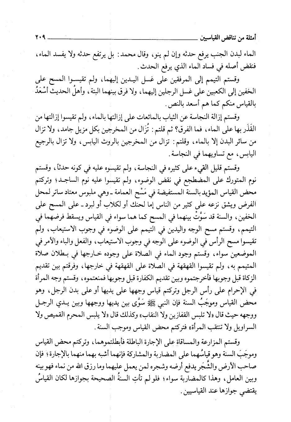 وَقِسْتُمْ وُجُودَ الْمَاءِ فِي الصَّلَاةِ عَلَى وُجُودِهِ خَارِجَهَا فِي بُطْلَانِ صَلَاةِ الْمُتَيَمِّمِ بِهِ، وَلَمْ تَقِيسُوا الْقَهْقَهَةَ فِي الصَّلَاةِ عَلَى الْقَهْقَهَةِ فِي خَارِجِهَا، وَفَرَّقْتُمْ بَيْنَ تَقْدِيمِ الزَّكَاةِ قَبْلَ وُجُوبِهَا فَأَخْرَجْتُمُوهُ وَبَيْنَ تَقْدِيمِ الْكَفَّارَةِ قَبْلَ وُجُوبِهَا فَمَنَعْتُمُوهُ.