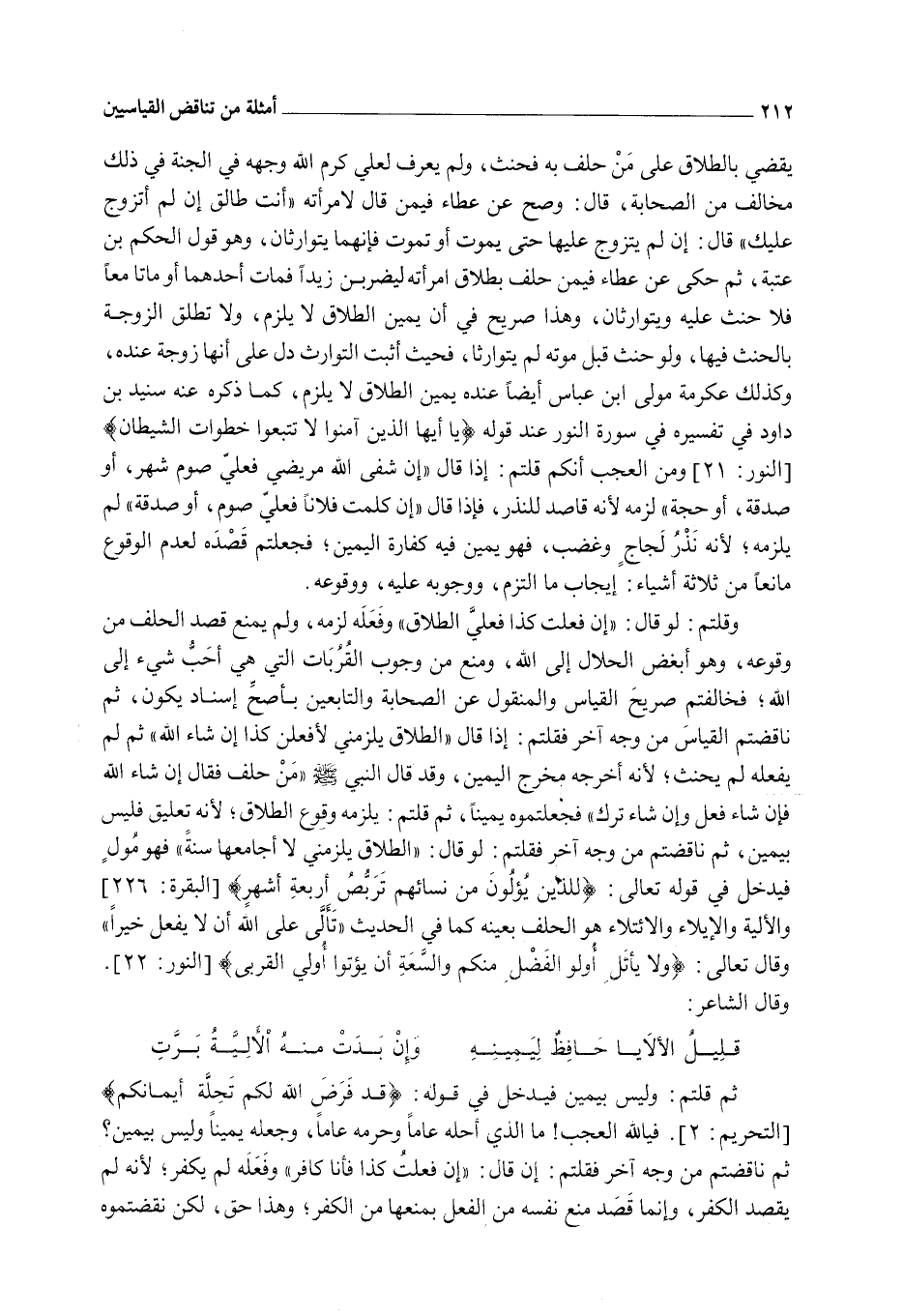 وَقُلْتُمْ: لَوْ قَالَ: " إنْ فَعَلْتُ كَذَا فَعَلَيَّ الطَّلَاقُ " وَفَعَلَهُ لَزِمَهُ، وَلَمْ يَمْنَعْ قَصْدُ الْحَلِفِ مِنْ وُقُوعِهِ، وَهُوَ أَبْغَضُ الْحَلَالِ إلَى اللَّهِ، وَمَنَعَ مِنْ وُجُوبِ الْقُرُبَاتِ الَّتِي هِيَ أَحَبُّ شَيْءٍ إلَى اللَّهِ، فَخَالَفْتُمْ صَرِيحَ الْقِيَاسِ وَالْمَنْقُولِ عَنْ الصَّحَابَةِ وَالتَّابِعِينَ بِأَصَحِّ إسْنَادٍ يَكُونُ، ثُمَّ نَاقَضْتُمْ الْقِيَاسَ مِنْ وَجْهٍ آخَرَ فَقُلْتُمْ: إذَا قَالَ " الطَّلَاقُ يَلْزَمُنِي لَأَفْعَلَنَّ كَذَا إنْ شَاءَ اللَّهُ " ثُمَّ لَمْ يَفْعَلْهُ لَمْ يَحْنَثْ؛ لِأَنَّهُ أَخْرَجَهُ مَخْرَجَ الْيَمِينِ، وَقَدْ قَالَ النَّبِيُّ - صَلَّى اللَّهُ عَلَيْهِ وَسَلَّمَ - «مَنْ حَلَفَ فَقَالَ إنْ شَاءَ اللَّهُ فَإِنْ شَاءَ فَعَلَ وَإِنْ شَاءَ تَرَكَ» فَجَعَلْتُمُوهُ يَمِينًا، ثُمَّ قُلْتُمْ: يَلْزَمُهُ وُقُوعُ الطَّلَاقِ؛ لِأَنَّهُ تَعْلِيقٌ فَلَيْسَ بِيَمِينٍ، ثُمَّ نَاقَضْتُمْ مِنْ وَجْهٍ آخَرَ فَقُلْتُمْ: لَوْ قَالَ: " الطَّلَاقُ يَلْزَمُنِي لَا أُجَامِعُهَا سَنَةً " فَهُوَ مُولٍ فَيَدْخُلُ فِي قَوْله تَعَالَى: {لِلَّذِينَ يُؤْلُونَ مِنْ نِسَائِهِمْ تَرَبُّصُ أَرْبَعَةِ أَشْهُرٍ} [البقرة: 226] وَالْأَلِيَّةُ وَالْإِيلَاءُ وَالِائْتِلَاءُ هُوَ الْحَلِفُ بِعَيْنِهِ كَمَا فِي الْحَدِيثِ «تَأَلَّى عَلَى اللَّهِ أَنْ لَا يَفْعَلَ خَيْرًا» وَقَالَ تَعَالَى: {وَلا يَأْتَلِ أُولُو الْفَضْلِ مِنْكُمْ وَالسَّعَةِ أَنْ يُؤْتُوا أُولِي الْقُرْبَى} [النور: 22] .