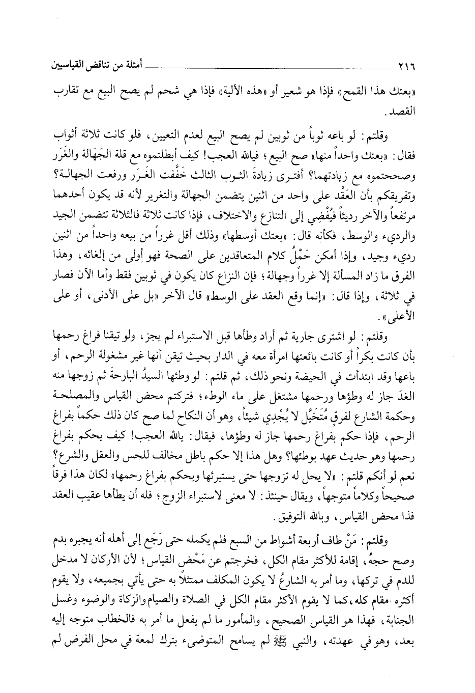 وَقُلْتُمْ: مَنْ طَافَ أَرْبَعَةَ أَشْوَاطٍ مِنْ السَّبْعِ فَلَمْ يُكْمِلْهُ حَتَّى رَجَعَ إلَى أَهْلِهِ إنَّهُ يَجْبُرُهُ بِدَمٍ وَصَحَّ حَجُّهُ، إقَامَةً لِلْأَكْثَرِ مَقَامَ الْكُلِّ، فَخَرَجْتُمْ عَنْ مَحْضِ الْقِيَاسِ؛ لِأَنَّ الْأَرْكَانَ لَا مَدْخَلَ لِلدَّمِ فِي تَرْكِهَا، وَمَا أَمَرَ بِهِ الشَّارِعُ لَا يَكُونُ الْمُكَلَّفُ مُمْتَثِلًا بِهِ حَتَّى يَأْتِيَ بِجَمِيعِهِ، وَلَا يَقُومُ أَكْثَرُهُ مَقَامَ كُلِّهِ، كَمَا لَا يَقُومُ الْأَكْثَرُ مَقَامَ الْكُلِّ فِي الصَّلَاةِ وَالصِّيَامِ وَالزَّكَاةِ وَالْوُضُوءِ وَغُسْلِ الْجَنَابَةِ، فَهَذَا هُوَ الْقِيَاسُ الصَّحِيحُ، وَالْمَأْمُورُ مَا لَمْ يَفْعَلْ مَا أُمِرَ بِهِ فَالْخِطَابُ مُتَوَجِّهٌ إلَيْهِ بَعْدُ، وَهُوَ فِي عُهْدَتِهِ، وَالنَّبِيُّ - صَلَّى اللَّهُ عَلَيْهِ وَسَلَّمَ - لَمْ يُسَامِحْ الْمُتَوَضِّئَ بِتَرْكِ لُمْعَةٍ فِي مَحَلِّ الْفَرْضِ لَمْ