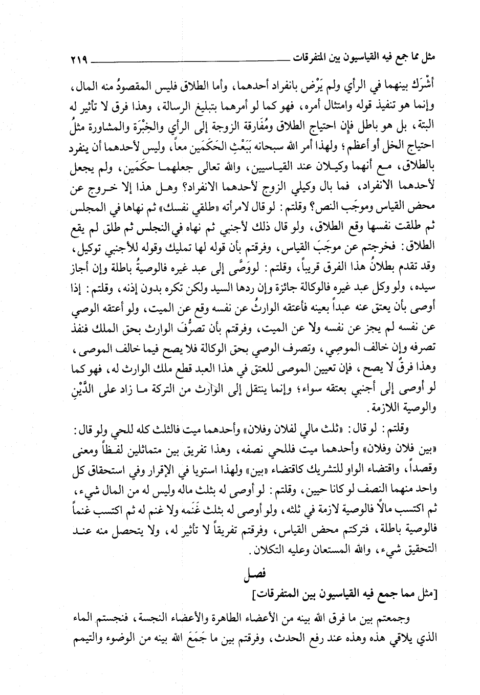 وَقُلْتُمْ: لَوْ قَالَ: " ثُلُثُ مَالِي لِفُلَانٍ وَفُلَانٍ " وَأَحَدُهُمَا مَيِّتٌ فَالثُّلُثُ كُلُّهُ لِلْحَيِّ وَلَوْ قَالَ: " بَيْنَ فُلَانٍ وَفُلَانٍ " وَأَحَدُهُمَا مَيِّتٌ فَلِلْحَيِّ نِصْفُهُ، وَهَذَا تَفْرِيقٌ بَيْنَ مُتَمَاثِلَيْنِ لَفْظًا وَمَعْنًى وَقَصْدًا، وَاقْتِضَاءُ الْوَاوِ لِلتَّشْرِيكِ كَاقْتِضَاءِ " بَيْنَ " وَلِهَذَا اسْتَوَيَا فِي الْإِقْرَارِ وَفِي اسْتِحْقَاقِ كُلِّ وَاحِدٍ مِنْهُمَا النِّصْفَ لَوْ كَانَا حَيَّيْنِ، وَقُلْتُمْ: لَوْ أَوْصَى لَهُ بِثُلُثِ مَالِهِ وَلَيْسَ لَهُ مِنْ الْمَالِ شَيْءٌ، ثُمَّ اكْتَسَبَ مَالًا فَالْوَصِيَّةُ لَازِمَةٌ فِي ثُلُثِهِ، وَلَوْ أَوْصَى لَهُ بِثُلُثِ غَنَمِهِ وَلَا غَنَمَ لَهُ ثُمَّ اكْتَسَبَ غَنَمًا فَالْوَصِيَّةُ بَاطِلَةٌ، فَتَرَكْتُمْ مَحْضَ الْقِيَاسِ، وَفَرَّقْتُمْ تَفْرِيقًا لَا تَأْثِيرَ لَهُ، وَلَا يَتَحَصَّلُ مِنْهُ عِنْدَ التَّحْقِيقِ شَيْءٌ، وَاَللَّهُ الْمُسْتَعَانُ وَعَلَيْهِ التُّكْلَانُ