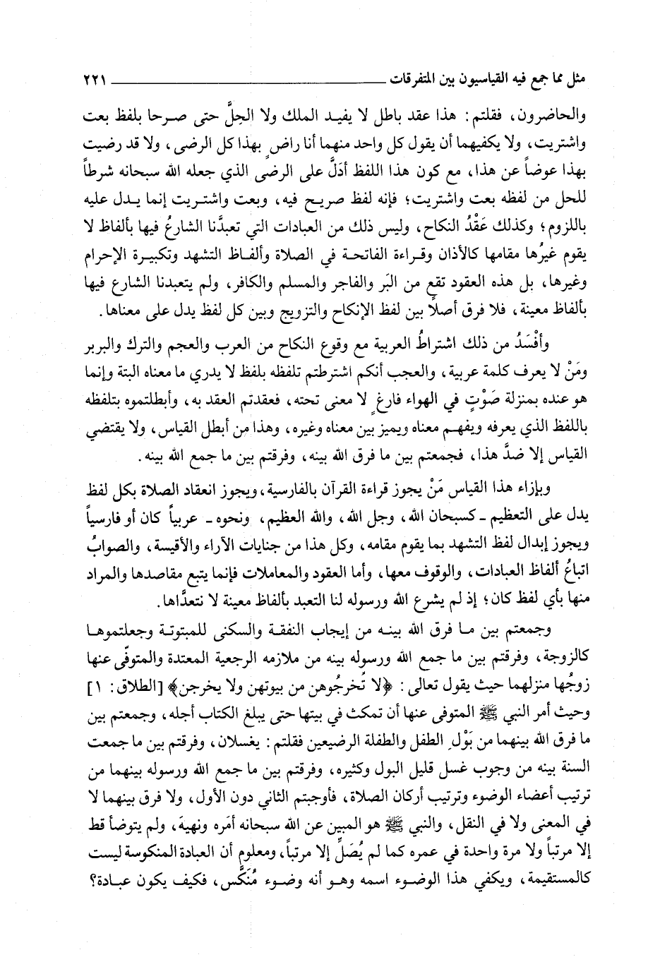 وَبِإِزَاءِ هَذَا الْقِيَاسِ مَنْ يُجَوِّزُ قِرَاءَةَ الْقُرْآنِ بِالْفَارِسِيَّةِ، وَيُجَوِّزُ انْعِقَادَ الصَّلَاةِ بِكُلِّ لَفْظٍ يَدُلُّ عَلَى التَّعْظِيمِ كَسُبْحَانَ اللَّهِ، وَجَلَّ اللَّهُ، وَاَللَّهُ الْعَظِيمُ، وَنَحْوِهِ - عَرَبِيًّا كَانَ أَوْ فَارِسِيًّا وَيُجَوِّزُ إبْدَالَ لَفْظِ التَّشَهُّدِ بِمَا يَقُومُ مَقَامَهُ، وَكُلُّ هَذَا مِنْ جِنَايَاتِ الْآرَاءِ وَالْأَقْيِسَةِ، وَالصَّوَابُ اتِّبَاعُ أَلْفَاظِ الْعِبَادَاتِ، وَالْوُقُوفُ مَعَهَا، وَأَمَّا الْعُقُودُ وَالْمُعَامَلَاتُ فَإِنَّمَا يَتْبَعُ مَقَاصِدَهَا وَالْمُرَادُ مِنْهَا بِأَيِّ لَفْظٍ كَانَ، إذْ لَمْ يُشَرِّعْ اللَّهُ وَرَسُولُهُ لَنَا التَّعَبُّدَ بِأَلْفَاظٍ مُعَيَّنَةٍ لَا نَتَعَدَّاهَا.
