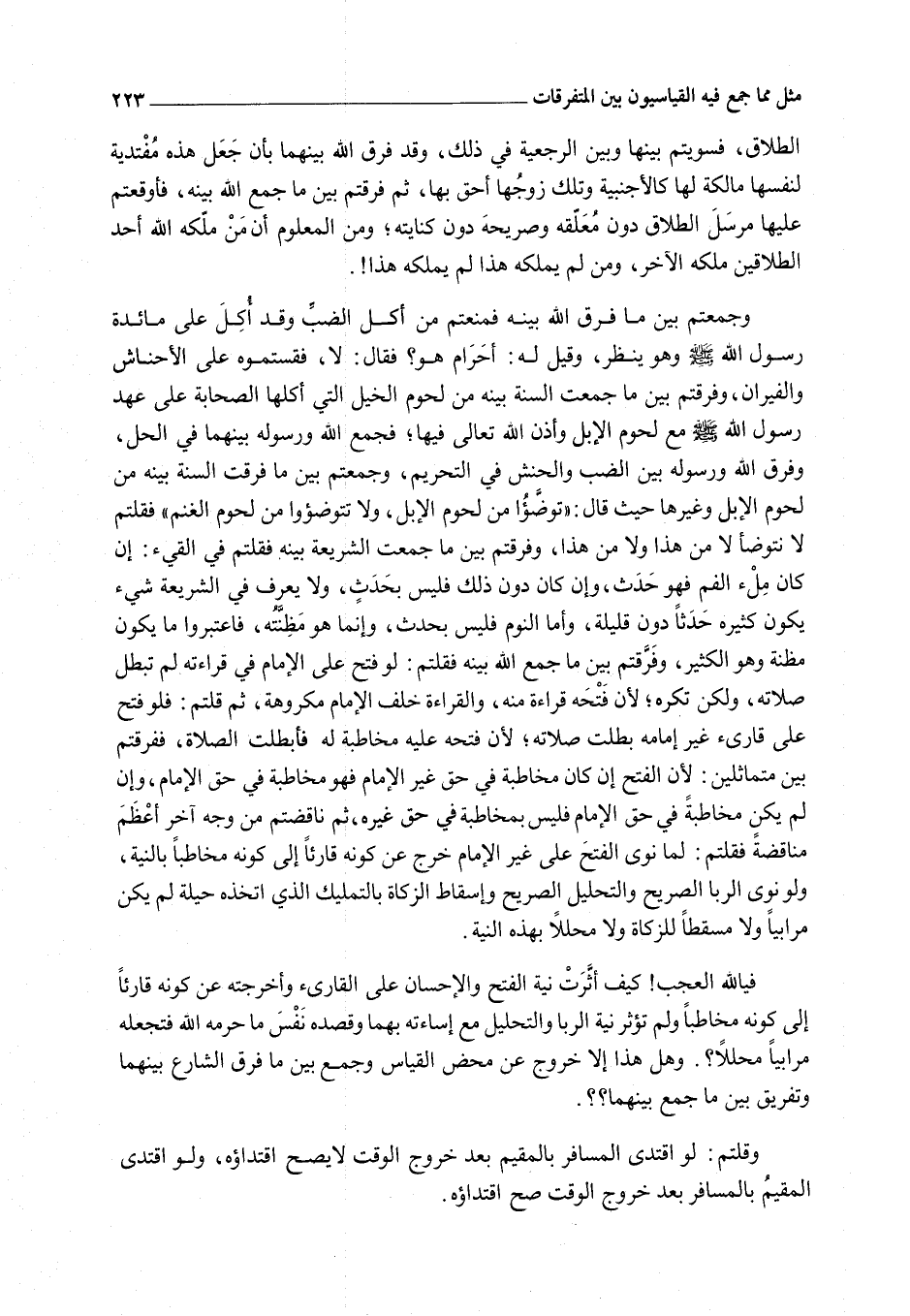 وَجَمَعْتُمْ بَيْنَ مَا فَرَّقَ اللَّهُ بَيْنَهُ فَمَنَعْتُمْ مِنْ أَكْلِ الضَّبِّ وَقَدْ أُكِلَ عَلَى مَائِدَةِ رَسُولِ اللَّهِ - صَلَّى اللَّهُ عَلَيْهِ وَسَلَّمَ - وَهُوَ يَنْظُرُ، وَقِيلَ لَهُ: أَحَرَامٌ هُوَ؟ فَقَالَ: لَا، فَقِسْتُمُوهُ عَلَى الْأَحْنَاشِ وَالْفِئْرَانِ، وَفَرَّقْتُمْ بَيْنَ مَا جَمَعَتْ السُّنَّةُ بَيْنَهُ مِنْ لُحُومِ الْخَيْلِ الَّتِي أَكَلَهَا الصَّحَابَةُ عَلَى عَهْدِ رَسُولِ اللَّهِ - صَلَّى اللَّهُ عَلَيْهِ وَسَلَّمَ - مَعَ لُحُومِ الْإِبِلِ وَأَذِنَ اللَّهُ تَعَالَى فِيهَا، فَجَمَعَ اللَّهُ وَرَسُولُهُ بَيْنَهُمَا فِي الْحِلِّ، وَفَرَّقَ اللَّهُ وَرَسُولُهُ بَيْنَ الضَّبِّ وَالْحَنَشِ فِي التَّحْرِيمِ، وَجَمَعْتُمْ بَيْنَ مَا فَرَّقَتْ السُّنَّةُ بَيْنَهُ مِنْ لُحُومِ الْإِبِلِ وَغَيْرِهَا حَيْثُ قَالَ: «تَوَضَّؤُا مِنْ لُحُومِ الْإِبِلِ، وَلَا تَتَوَضَّئُوا مِنْ لُحُومِ الْغَنَمِ» فَقُلْتُمْ لَا نَتَوَضَّأُ لَا مِنْ هَذَا وَلَا مِنْ هَذَا، وَفَرَّقْتُمْ بَيْنَ مَا جَمَعَتْ الشَّرِيعَةُ بَيْنَهُ فَقُلْتُمْ فِي الْقَيْءِ: إنْ كَانَ مِلْءَ الْفَمِ فَهُوَ حَدَثٌ، وَإِنْ كَانَ دُونَ ذَلِكَ فَلَيْسَ بِحَدَثٍ، وَلَا يُعْرَفُ فِي الشَّرِيعَةِ شَيْءٌ يَكُونُ كَثِيرُهُ حَدَثًا دُونَ قَلِيلَةِ، وَأَمَّا النَّوْمُ فَلَيْسَ بِحَدَثٍ، وَإِنَّمَا هُوَ مَظِنَّتُهُ، فَاعْتَبَرُوا مَا يَكُونُ مَظِنَّةً وَهُوَ الْكَثِيرُ، وَفَرَّقْتُمْ بَيْنَ مَا جَمَعَ اللَّهُ بَيْنَهُ فَقُلْتُمْ: لَوْ فَتَحَ عَلَى الْإِمَامِ فِي قِرَاءَتِهِ لَمْ تَبْطُلْ صَلَاتُهُ، وَلَكِنْ تُكْرَهُ؛ لِأَنَّ فَتْحَهُ قِرَاءَةٌ مِنْهُ، وَالْقِرَاءَةُ خَلْفَ الْإِمَامِ مَكْرُوهَةٌ، ثُمَّ قُلْتُمْ: فَلَوْ فَتَحَ عَلَى قَارِئٍ غَيْرِ إمَامِهِ بَطَلَتْ صَلَاتُهُ؛ لِأَنَّ فَتْحَهُ عَلَيْهِ مُخَاطَبَةٌ لَهُ فَأَبْطَلَتْ الصَّلَاةَ، فَفَرَّقْتُمْ بَيْنَ مُتَمَاثِلَيْنِ؛ لِأَنَّ الْفَتْحَ إنْ كَانَ مُخَاطَبَةً فِي حَقِّ غَيْرِ الْإِمَامِ فَهُوَ مُخَاطَبَةٌ فِي حَقِّ الْإِمَامِ، وَإِنْ لَمْ يَكُنْ مُخَاطَبَةً فِي حَقِّ الْإِمَامِ فَلَيْسَ بِمُخَاطَبَةٍ فِي حَقِّ غَيْرِهِ، ثُمَّ نَاقَضْتُمْ مِنْ وَجْهٍ آخَرَ أَعْظَمَ مُنَاقَضَةً فَقُلْتُمْ: لَمَّا نَوَى الْفَتْحَ عَلَى غَيْرِ الْإِمَامِ خَرَجَ عَنْ كَوْنِهِ قَارِئًا إلَى كَوْنِهِ مُخَاطِبًا بِالنِّيَّةِ، وَلَوْ نَوَى الرِّبَا الصَّرِيحَ وَالتَّحْلِيلَ الصَّرِيحَ وَإِسْقَاطَ الزَّكَاةِ بِالتَّمْلِيكِ الَّذِي اتَّخَذَهُ حِيلَةً لَمْ يَكُنْ مُرَابِيًا وَلَا مُسْقِطًا لِلزَّكَاةِ وَلَا مُحَلِّلًا بِهَذِهِ النِّيَّةِ.