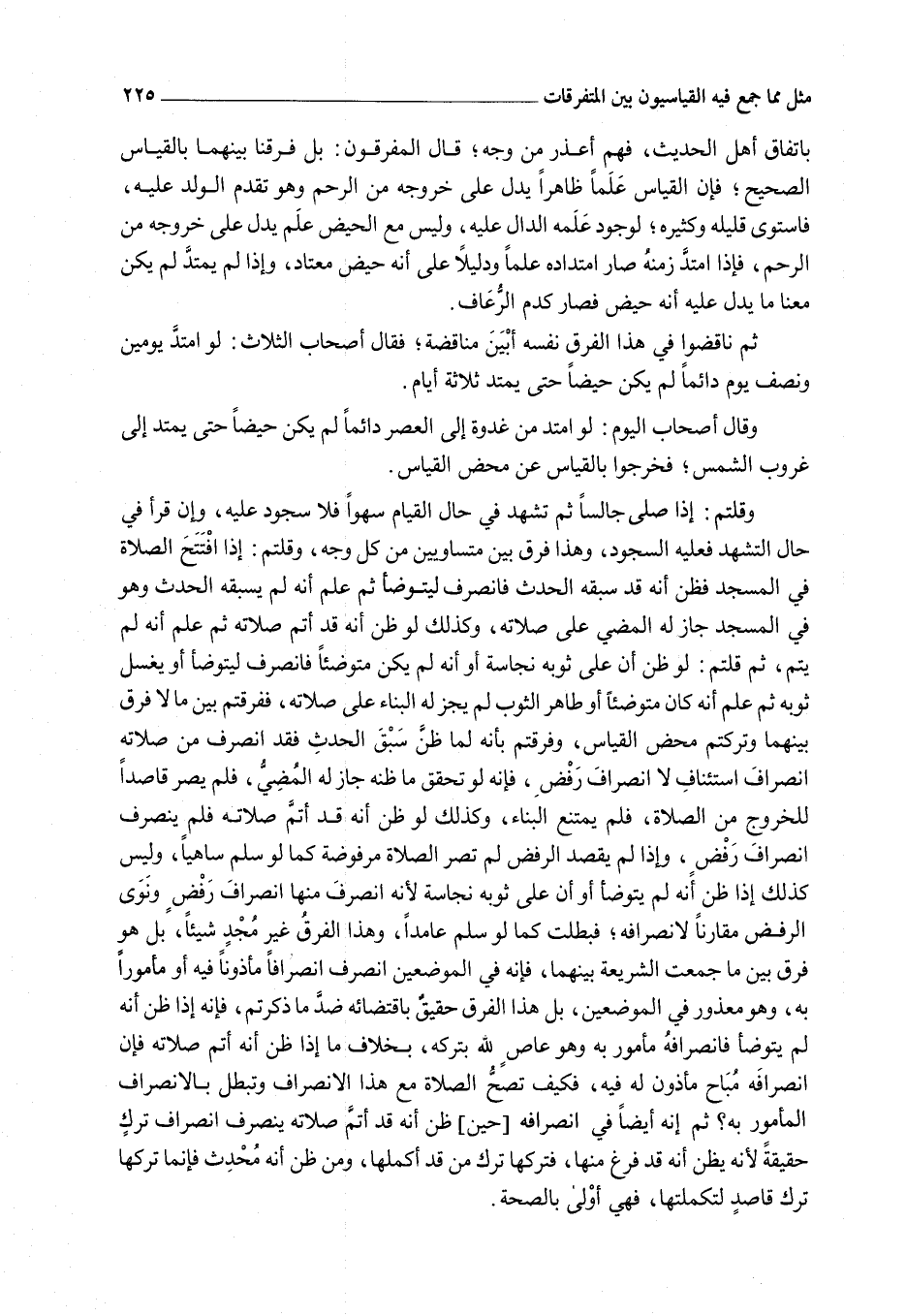 وَقُلْتُمْ: إذَا صَلَّى جَالِسًا ثُمَّ تَشَهَّدَ فِي حَالِ الْقِيَامِ سَهْوًا فَلَا سُجُودَ عَلَيْهِ، وَإِنْ قَرَأَ فِي حَالِ التَّشَهُّدِ فَعَلَيْهِ السُّجُودُ، وَهَذَا فَرْقٌ بَيْنَ مُتَسَاوِيَيْنِ مِنْ كُلِّ وَجْهٍ، وَقُلْتُمْ: إذَا افْتَتَحَ الصَّلَاةَ فِي الْمَسْجِدِ فَظَنَّ أَنَّهُ قَدْ سَبَقَهُ الْحَدَثُ فَانْصَرَفَ لِيَتَوَضَّأَ ثُمَّ عَلِمَ أَنَّهُ لَمْ يَسْبِقْهُ الْحَدَثُ وَهُوَ فِي الْمَسْجِدِ جَازَ لَهُ الْمُضِيُّ عَلَى صَلَاتِهِ، وَكَذَلِكَ لَوْ ظَنَّ أَنَّهُ قَدْ أَتَمَّ صَلَاتَهُ ثُمَّ عَلِمَ أَنَّهُ لَمْ يُتِمَّ، ثُمَّ قُلْتُمْ: لَوْ ظَنَّ أَنَّ عَلَى ثَوْبِهِ نَجَاسَةً أَوْ أَنَّهُ لَمْ يَكُنْ مُتَوَضِّئًا فَانْصَرَفَ لِيَتَوَضَّأَ أَوْ يَغْسِلَ ثَوْبَهُ ثُمَّ عَلِمَ أَنَّهُ كَانَ مُتَوَضِّئًا أَوْ طَاهِرَ الثَّوْبِ لَمْ يَجُزْ لَهُ الْبِنَاءُ عَلَى صَلَاتِهِ، فَفَرَّقْتُمْ بَيْنَ مَا لَا فَرْقَ بَيْنَهُمَا وَتَرَكْتُمْ مَحْضَ الْقِيَاسِ، وَفَرَّقْتُمْ بِأَنَّهُ لَمَّا ظَنَّ سَبْقَ الْحَدَثِ فَقَدْ انْصَرَفَ مِنْ صَلَاتِهِ انْصِرَافَ اسْتِئْنَافٍ لَا انْصِرَافَ رَفْضٍ، فَإِنَّهُ لَوْ تَحَقَّقَ مَا ظَنَّهُ جَازَ لَهُ الْمُضِيُّ، فَلَمْ يَصِرْ قَاصِدًا لِلْخُرُوجِ مِنْ الصَّلَاةِ، فَلَمْ يَمْتَنِعْ الْبِنَاءُ، وَكَذَلِكَ لَوْ ظَنَّ أَنَّهُ قَدْ أَتَمَّ صَلَاتَهُ فَلَمْ يَنْصَرِفْ انْصِرَافَ رَفْضٍ، وَإِذَا لَمْ يَقْصِدْ الرَّفْضَ لَمْ تَصِرْ الصَّلَاةُ مَرْفُوضَةً كَمَا لَوْ سَلَّمَ سَاهِيًا، وَلَيْسَ كَذَلِكَ إذَا ظَنَّ أَنَّهُ لَمْ يَتَوَضَّأْ أَوْ أَنَّ عَلَى ثَوْبِهِ نَجَاسَةً؛ لِأَنَّهُ انْصَرَفَ مِنْهَا انْصِرَافَ رَفْضٍ وَنَوَى الرَّفْضَ مُقَارِنًا لِانْصِرَافِهِ، فَبَطَلَتْ كَمَا لَوْ سَلَّمَ عَامِدًا، وَهَذَا الْفَرْقُ غَيْرُ مُجْدٍ شَيْئًا، بَلْ هُوَ فَرْقٌ بَيْنَ مَا جَمَعَتْ الشَّرِيعَةُ بَيْنَهُمَا، فَإِنَّهُ فِي الْمَوْضِعَيْنِ انْصَرَفَ انْصِرَافًا مَأْذُونًا فِيهِ أَوْ مَأْمُورًا بِهِ، وَهُوَ مَعْذُورٌ فِي الْمَوْضِعَيْنِ، بَلْ هَذَا الْفَرْقُ حَقِيقٌ بِاقْتِضَائِهِ ضِدَّ مَا ذَكَرْتُمْ، فَإِنَّهُ إذَا ظَنَّ أَنَّهُ لَمْ يَتَوَضَّأْ فَانْصِرَافُهُ مَأْمُورٌ بِهِ وَهُوَ عَاصٍ لِلَّهِ بِتَرْكِهِ، بِخِلَافِ مَا إذَا ظَنَّ أَنَّهُ أَتَمَّ صَلَاتَهُ فَإِنَّ انْصِرَافَهُ مُبَاحٌ مَأْذُونٌ لَهُ فِيهِ، فَكَيْفَ تَصِحُّ الصَّلَاةُ مَعَ هَذَا الِانْصِرَافِ وَتَبْطُلُ بِالِانْصِرَافِ الْمَأْمُورِ بِهِ؟ ثُمَّ إنَّهُ أَيْضًا فِي انْصِرَافِهِ [حِينَ] ظَنَّ أَنَّهُ قَدْ أَتَمَّ صَلَاتَهُ يَنْصَرِفُ انْصِرَافَ تَرْكٍ حَقِيقَةً؛ لِأَنَّهُ يَظُنُّ أَنَّهُ قَدْ فَرَغَ مِنْهَا، فَتَرَكَهَا تَرْكَ مَنْ قَدْ أَكْمَلَهَا، وَمَنْ ظَنَّ أَنَّهُ مُحْدِثٌ فَإِنَّمَا تَرَكَهَا تَرْكَ قَاصِدٍ لِتَكْمِلَتِهَا، فَهِيَ أَوْلَى بِالصِّحَّةِ