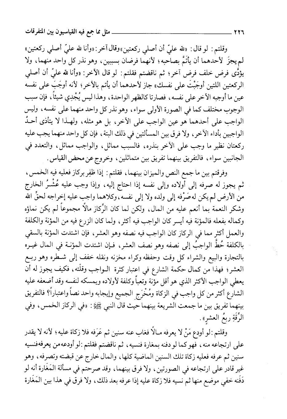 وَفَرَّقْتُمْ بَيْنَ مَا جَمَعَ النَّصُّ وَالْمِيزَانُ بَيْنَهُمَا، فَقُلْتُمْ: إذَا ظَفِرَ بِرِكَازٍ فَعَلَيْهِ فِيهِ الْخُمُسُ، ثُمَّ يَجُوزُ لَهُ صَرْفُهُ إلَى أَوْلَادِهِ وَإِلَى نَفْسِهِ إذَا احْتَاجَ إلَيْهِ، وَإِذَا وَجَبَ عَلَيْهِ عُشْرُ الْخَارِجِ مِنْ الْأَرْضِ لَمْ يَكُنْ لَهُ صَرْفُهُ إلَى وَلَدِهِ وَلَا إلَى نَفْسِهِ، وَكِلَاهُمَا وَاجِبٌ عَلَيْهِ إخْرَاجُهُ لِحَقِّ اللَّهِ وَشُكْرِ النِّعْمَةِ بِمَا أَنْعَمَ عَلَيْهِ مِنْ الْمَالِ، وَلَكِنْ لَمَّا كَانَ الرِّكَازُ مَالًا مَجْمُوعًا لَمْ يَكُنْ نَمَاؤُهُ وَكَمَالُهُ بِفِعْلِهِ فَالْمُؤْنَةُ فِيهِ أَيْسَرُ كَانَ الْوَاجِبُ فِيهِ أَكْثَرَ، وَلَمَّا كَانَ الزَّرْعُ فِيهِ مِنْ الْمُؤْنَةِ وَالْكُلْفَةِ وَالْعَمَلِ أَكْثَرَ مِمَّا فِي الرِّكَازِ كَانَ الْوَاجِبُ فِيهِ نِصْفَهُ وَهُوَ الْعُشْرُ، فَإِنْ اشْتَدَّتْ الْمُؤْنَةُ بِالسَّقْيِ بِالْكُلْفَةِ حُطَّ الْوَاجِبُ إلَى نِصْفِهِ وَهُوَ نِصْفُ الْعُشْرِ، فَإِنْ اشْتَدَّتْ الْمُؤْنَةُ فِي الْمَالِ غَيْرُهُ بِالتِّجَارَةِ وَالْبَيْعِ وَالشِّرَاءِ كُلَّ وَقْتٍ وَحِفْظُهُ وَكِرَاءُ مَخْزَنِهِ وَنَقْلُهُ خُفِّفَ إلَى شَطْرِهِ وَهُوَ رُبُعُ الْعُشْرِ، فَهَذَا مِنْ كَمَالِ حِكْمَةِ الشَّارِعِ فِي اعْتِبَارِ كَثْرَةِ الْوَاجِبِ وَقِلَّتِهِ، فَكَيْفَ يَجُوزُ لَهُ أَنْ يُعْطِيَ الْوَاجِبَ الْأَكْثَرَ الَّذِي هُوَ أَقَلُّ مُؤْنَةً وَتَعَبًا وَكُلْفَةً لِأَوْلَادِهِ وَيَمْسِكَهُ لِنَفْسِهِ وَقَدْ أَضْعَفَهُ عَلَيْهِ الشَّارِعُ أَكْثَرَ مِنْ كُلِّ وَاجِبٍ فِي الزَّكَاةِ وَمَخْرَجُ الْجَمِيعِ وَإِيجَابُهُ وَاحِدٌ نَصًّا وَاعْتِبَارًا؟ فَالتَّفْرِيقُ بَيْنَهُمَا تَفْرِيقٌ بَيْنَ مَا جَمَعَتْ الشَّرِيعَةُ بَيْنَهُمَا حَيْثُ قَالَ النَّبِيُّ - صَلَّى اللَّهُ عَلَيْهِ وَسَلَّمَ -: «فِي الرِّكَازِ الْخُمُسُ، وَفِي الرِّقَةِ رُبُعُ الْعُشْرِ» .