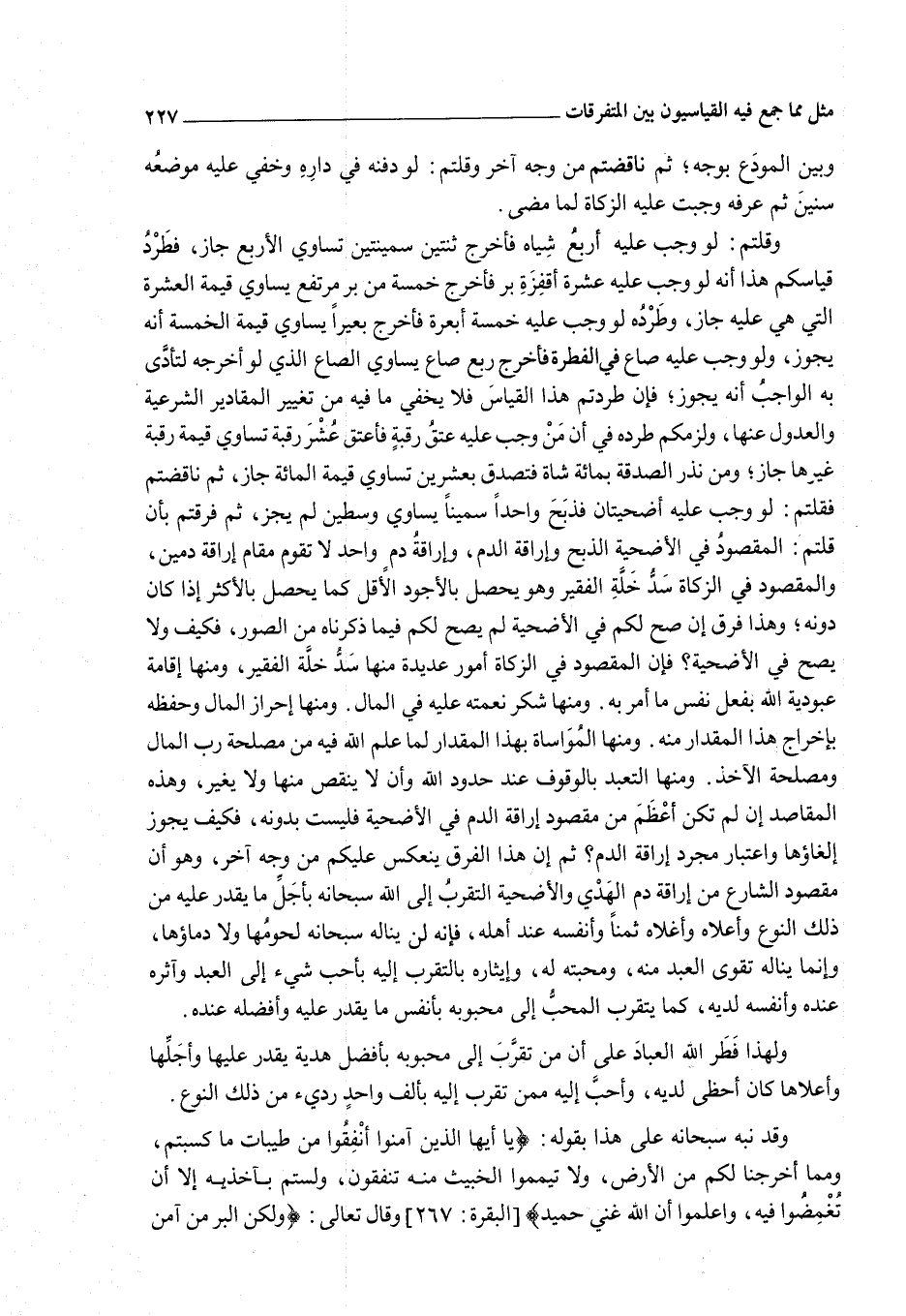 وَقُلْتُمْ: لَوْ وَجَبَ عَلَيْهِ أَرْبَعُ شِيَاهٍ فَأَخْرَجَ ثِنْتَيْنِ سَمِينَتَيْنِ تُسَاوِي الْأَرْبَعَ جَازَ، فَطَرْدُ قِيَاسِكُمْ هَذَا أَنَّهُ لَوْ وَجَبَ عَلَيْهِ عَشَرَةُ أَقْفِزَةِ بُرٍّ فَأَخْرَجَ خَمْسَةً مِنْ بُرٍّ مُرْتَفِعٍ يُسَاوِي قِيمَةَ الْعَشَرَةِ الَّتِي هِيَ عَلَيْهِ جَازَ، وَطَرْدُهُ لَوْ وَجَبَ عَلَيْهِ خَمْسَةُ أَبْعِرَةٍ فَأَخْرَجَ بَعِيرًا يُسَاوِي قِيمَةَ الْخَمْسَةِ أَنَّهُ يَجُوزُ، وَلَوْ وَجَبَ عَلَيْهِ صَاعٌ فِي الْفِطْرَةِ فَأَخْرَجَ رُبُعَ صَاعٍ يُسَاوِي الصَّاعَ الَّذِي لَوْ أَخْرَجَهُ لَتَأَدَّى بِهِ الْوَاجِبُ أَنَّهُ يَجُوزُ، فَإِنْ طَرَدْتُمْ هَذَا الْقِيَاسَ فَلَا يَخْفَى مَا فِيهِ مِنْ تَغْيِيرِ الْمَقَادِيرِ الشَّرْعِيَّةِ وَالْعُدُولِ عَنْهَا، وَلَزِمَكُمْ طَرْدُهُ فِي أَنَّ مَنْ وَجَبَ عَلَيْهِ عِتْقُ رَقَبَةٍ فَأَعْتَقَ عُشْرَ رَقَبَةٍ تُسَاوِي قِيمَةَ رَقَبَةٍ غَيْرِهَا جَازَ، وَمَنْ نَذَرَ الصَّدَقَةَ بِمِائَةِ شَاةٍ فَتَصَدَّقَ بِعِشْرِينَ تَسَاوِي قِيمَةَ الْمِائَةِ جَازَ، ثُمَّ نَاقَضْتُمْ فَقُلْتُمْ: لَوْ وَجَبَ عَلَيْهِ أُضْحِيَّتَانِ فَذَبَحَ وَاحِدًا سَمِينًا يُسَاوِي وَسَطَيْنِ لَمْ يَجُزْ، ثُمَّ فَرَّقْتُمْ بِأَنْ قُلْتُمْ: الْمَقْصُودُ فِي الْأُضْحِيَّةَ الذَّبْحُ وَإِرَاقَةُ الدَّمِ، وَإِرَاقَةُ دَمٍ وَاحِدٍ لَا تَقُومُ مَقَامَ إرَاقَةِ دَمَيْنِ، وَالْمَقْصُودُ فِي الزَّكَاةِ سَدُّ خَلَّةِ الْفَقِيرِ وَهُوَ يَحْصُلُ بِالْأَجْوَدِ الْأَقَلِّ كَمَا يَحْصُلُ بِالْأَكْثَرِ إذَا كَانَ دُونَهُ، وَهَذَا فَرْقٌ إنْ صَحَّ لَكُمْ فِي الْأُضْحِيَّةَ لَمْ يَصِحَّ لَكُمْ فِيمَا ذَكَرْنَاهُ مِنْ الصُّوَرِ، فَكَيْفَ وَلَا يَصِحُّ فِي الْأُضْحِيَّةَ؟ فَإِنَّ الْمَقْصُودَ فِي الزَّكَاةِ أُمُورٌ عَدِيدَةٌ مِنْهَا سَدُّ خَلَّةِ الْفَقِيرِ، وَمِنْهَا إقَامَةُ عُبُودِيَّةِ اللَّهِ بِفِعْلِ نَفْسِ مَا أَمَرَ بِهِ. وَمِنْهَا شُكْرُ نِعْمَتِهِ عَلَيْهِ فِي الْمَالِ. وَمِنْهَا إحْرَازُ الْمَالِ وَحِفْظُهُ بِإِخْرَاجِ هَذَا الْمِقْدَارِ مِنْهُ. وَمِنْهَا الْمُوَاسَاةُ بِهَذَا الْمِقْدَارِ لِمَا عَلِمَ اللَّهُ فِيهِ مِنْ مَصْلَحَةِ رَبِّ الْمَالِ وَمَصْلَحَةِ الْآخِذِ. وَمِنْهَا التَّعَبُّدُ بِالْوُقُوفِ عِنْدَ حُدُودِ اللَّهِ وَأَنْ لَا يُنْقِصَ مِنْهَا وَلَا يُغَيِّرَ، وَهَذِهِ الْمَقَاصِدُ إنْ لَمْ تَكُنْ أَعْظَمَ مِنْ مَقْصُودِ إرَاقَةِ الدَّمِ فِي الْأُضْحِيَّةَ فَلَيْسَتْ بِدُونِهِ، فَكَيْفَ يَجُوزُ إلْغَاؤُهَا وَاعْتِبَارُ مُجَرَّدِ إرَاقَةِ الدَّمِ؟ ثُمَّ إنَّ هَذَا الْفَرْقَ يَنْعَكِسُ عَلَيْكُمْ مِنْ وَجْهٍ آخَرَ، وَهُوَ أَنَّ مَقْصُودَ الشَّارِعِ مِنْ إرَاقَةِ دَمِ الْهَدْيِ وَالْأُضْحِيَّةِ التَّقَرُّبُ إلَى اللَّهِ - سُبْحَانَهُ - بِأَجَلِّ مَا يَقْدِرُ عَلَيْهِ مِنْ ذَلِكَ النَّوْعِ وَأَعْلَاهُ وَأَغْلَاهُ ثَمَنًا وَأَنْفَسُهُ عِنْدَ أَهْلِهِ، فَإِنَّهُ لَنْ يَنَالَهُ - سُبْحَانَهُ - لُحُومُهَا وَلَا دِمَاؤُهَا، وَإِنَّمَا يَنَالُهُ تَقْوَى الْعَبْدِ مِنْهُ، وَمَحَبَّتُهُ لَهُ، وَإِيثَارُهُ بِالتَّقَرُّبِ إلَيْهِ بِأَحَبِّ شَيْءٍ إلَى الْعَبْدِ وَآثَرَهُ عِنْدَهُ وَأَنْفَسَهُ لَدَيْهِ، كَمَا يَتَقَرَّبُ الْمُحِبُّ إلَى مَحْبُوبِهِ بِأَنْفَسِ مَا يَقْدِرُ عَلَيْهِ وَأَفْضَلِهِ عِنْدَهُ.