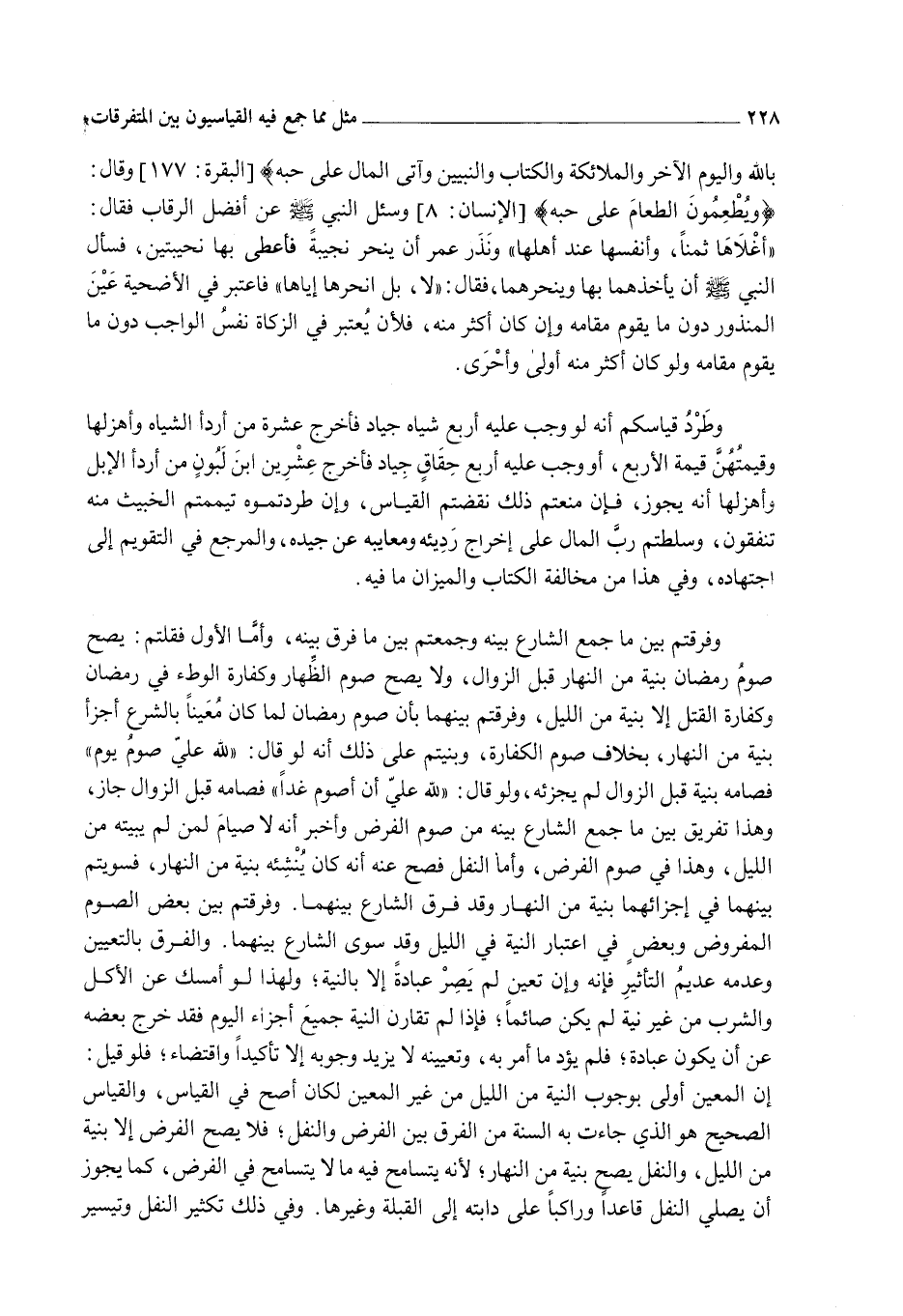 وَفَرَّقْتُمْ بَيْنَ مَا جَمَعَ الشَّارِعُ بَيْنَهُ وَجَمَعْتُمْ بَيْنَ مَا فَرَّقَ بَيْنَهُ، وَأَمَّا الْأَوَّلُ فَقُلْتُمْ: يَصِحُّ صَوْمُ رَمَضَانَ بِنِيَّةٍ مِنْ النَّهَارِ قَبْلَ الزَّوَالِ، وَلَا يَصِحُّ صَوْمُ الظِّهَارِ وَكَفَّارَةِ الْوَطْءِ فِي رَمَضَانَ وَكَفَّارَةِ الْقَتْلِ إلَّا بِنِيَّةٍ مِنْ اللَّيْلِ، وَفَرَّقْتُمْ بَيْنَهُمَا بِأَنَّ صَوْمَ رَمَضَانَ لَمَّا كَانَ مُعَيَّنًا بِالشَّرْعِ أَجْزَأَ بِنِيَّةٍ مِنْ النَّهَارِ، بِخِلَافِ صَوْمِ الْكَفَّارَةِ، وَبَنَيْتُمْ عَلَى ذَلِكَ أَنَّهُ لَوْ قَالَ: " لِلَّهِ عَلَيَّ صَوْمُ يَوْمٍ " فَصَامَهُ بِنِيَّةٍ قَبْلَ الزَّوَالِ لَمْ يُجْزِئْهُ، وَلَوْ قَالَ: " لِلَّهِ عَلَيَّ أَنْ أَصُومَ غَدًا " فَصَامَهُ قَبْلَ الزَّوَالِ جَازَ، وَهَذَا تَفْرِيقٌ بَيْنَ مَا جَمَعَ الشَّارِعُ بَيْنَهُ مِنْ صَوْمِ الْفَرْضِ وَأَخْبَرَ أَنَّهُ لَا صِيَامَ لِمَنْ لَمْ يُبَيِّتْهُ مِنْ اللَّيْلِ، وَهَذَا فِي صَوْمِ الْفَرْضِ، وَأَمَّا النَّفَلُ فَصَحَّ عَنْهُ أَنَّهُ كَانَ يُنْشِئُهُ بِنِيَّةٍ مِنْ النَّهَارِ، فَسَوَّيْتُمْ بَيْنَهُمَا فِي إجْزَائِهِمَا بِنِيَّةٍ مِنْ النَّهَارِ وَقَدْ فَرَّقَ الشَّارِعُ بَيْنَهُمَا. وَفَرَّقْتُمْ بَيْنَ بَعْضِ الصَّوْمِ الْمَفْرُوضِ وَبَعْضٍ فِي اعْتِبَارِ النِّيَّةِ فِي اللَّيْلِ وَقَدْ سَوَّى الشَّارِعُ بَيْنَهُمَا. وَالْفَرْقُ بِالتَّعْيِينِ وَعَدَمِهِ عَدِيمُ التَّأْثِيرِ فَإِنَّهُ وَإِنْ تَعَيَّنَ لَمْ يَصِرْ عِبَادَةً إلَّا بِالنِّيَّةِ، وَلِهَذَا لَوْ أَمْسَكَ عَنْ الْأَكْلِ وَالشُّرْبِ مِنْ غَيْرِ نِيَّةٍ لَمْ يَكُنْ صَائِمًا، فَإِذَا لَمْ تُقَارِنْ النِّيَّةُ جَمِيعَ أَجْزَاءِ الْيَوْمِ فَقَدْ خَرَجَ بَعْضُهُ عَنْ أَنْ يَكُونَ عِبَادَةً، فَلَمْ يُؤَدِّ مَا أُمِرَ بِهِ، وَتَعْيِينُهُ لَا يَزِيدُ وُجُوبَهُ إلَّا تَأْكِيدًا وَاقْتِضَاءً، فَلَوْ قِيلَ: إنَّ الْمُعَيَّنَ أَوْلَى بِوُجُوبِ النِّيَّةِ مِنْ اللَّيْلِ مِنْ غَيْرِ الْمُعَيَّنِ لَكَانَ أَصَحَّ فِي الْقِيَاسِ، وَالْقِيَاسُ الصَّحِيحُ هُوَ الَّذِي جَاءَتْ بِهِ السُّنَّةُ مِنْ الْفَرْقِ بَيْنَ الْفَرْضِ وَالنَّفَلِ، فَلَا يَصِحُّ الْفَرْضُ إلَّا بِنِيَّةٍ مِنْ اللَّيْلِ، وَالنَّفَلُ يَصِحُّ بِنِيَّةٍ مِنْ النَّهَارِ؛ لِأَنَّهُ يُتَسَامَحُ فِيهِ مَا لَا يُتَسَامَحُ فِي الْفَرْضِ، كَمَا يَجُوزُ أَنْ يُصَلِّيَ النَّفَلَ قَاعِدًا وَرَاكِبًا عَلَى دَابَّتِهِ إلَى الْقِبْلَةِ وَغَيْرِهَا.