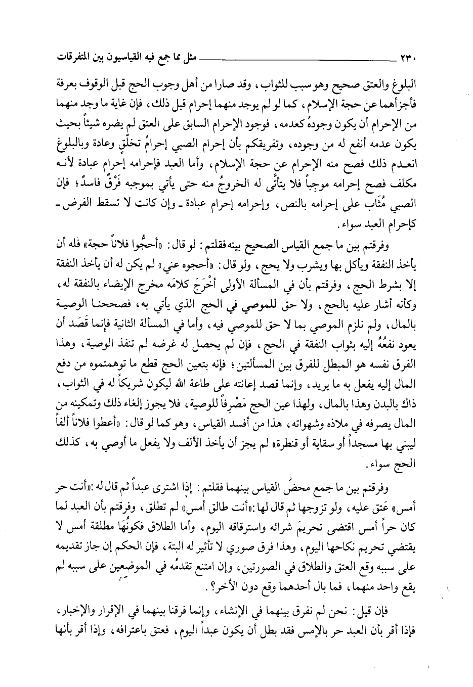 الْبُلُوغِ وَالْعِتْقِ صَحِيحٌ وَهُوَ سَبَبٌ لِلثَّوَابِ، وَقَدْ صَارَا مِنْ أَهْلِ وُجُوبِ الْحَجِّ قَبْلَ الْوُقُوفِ بِعَرَفَةَ فَأَجْزَأَهُمَا عَنْ حَجَّةِ الْإِسْلَامِ، كَمَا لَوْ لَمْ يُوجَدْ مِنْهُمَا إحْرَامٌ قَبْلَ ذَلِكَ، فَإِنَّ غَايَةَ مَا وُجِدَ مِنْهُمَا مِنْ الْإِحْرَامِ أَنْ يَكُونَ وُجُودُهُ كَعَدَمِهِ، فَوُجُودُ الْإِحْرَامِ السَّابِقِ عَلَى الْعِتْقِ لَمْ يَضُرَّهُ شَيْئًا بِحَيْثُ يَكُونُ عَدَمُهُ أَنْفَعَ لَهُ مِنْ وُجُودِهِ، وَتَفْرِيقُكُمْ بِأَنَّ إحْرَامَ الصَّبِيِّ إحْرَامُ تَخَلُّقٍ وَعَادَةٍ وَبِالْبُلُوغِ انْعَدَمَ ذَلِكَ فَصَحَّ مِنْهُ الْإِحْرَامُ عَنْ حَجَّةِ الْإِسْلَامِ، وَأَمَّا الْعَبْدُ فَإِحْرَامُهُ إحْرَامُ عِبَادَةٍ؛ لِأَنَّهُ مُكَلَّفٌ فَصَحَّ إحْرَامُهُ مُوجَبًا فَلَا يَتَأَتَّى لَهُ الْخُرُوجُ مِنْهُ حَتَّى يَأْتِيَ بِمُوجَبِهِ فَرْقٌ فَاسِدٌ، فَإِنَّ الصَّبِيَّ مُثَابٌ عَلَى إحْرَامِهِ بِالنَّصِّ، وَإِحْرَامُهُ إحْرَامُ عِبَادَةٍ - وَإِنْ كَانَتْ لَا تُسْقِطُ الْفَرْضَ - كَإِحْرَامِ الْعَبْدِ سَوَاءٌ.