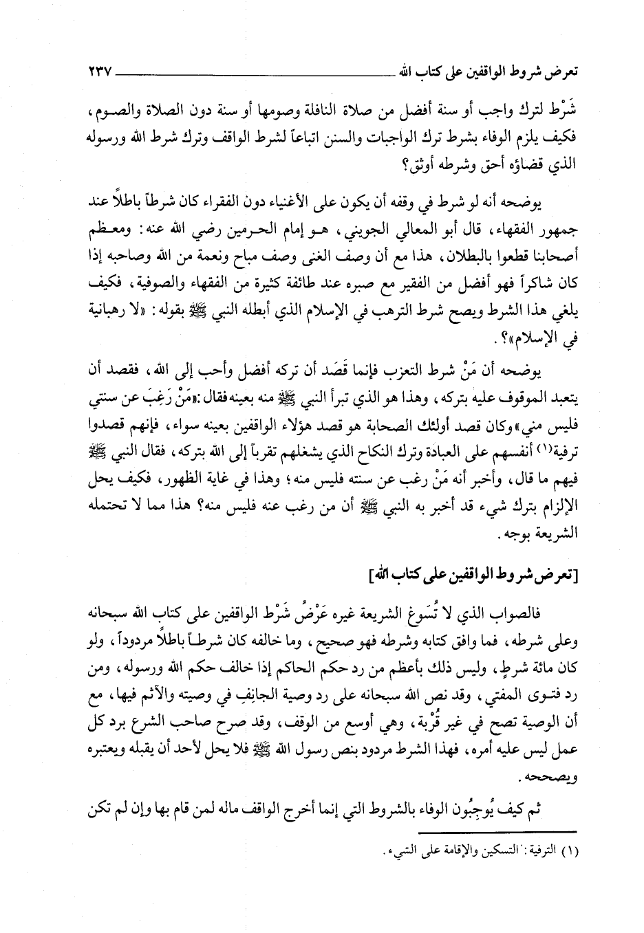 شَرْطٌ لِتَرْكِ وَاجِبٍ أَوْ سُنَّةٍ أَفْضَلُ مِنْ صَلَاةِ النَّافِلَةِ وَصَوْمِهَا أَوْ سُنَّةٍ دُونَ الصَّلَاةِ وَالصَّوْمِ، فَكَيْفَ يَلْزَمُ الْوَفَاءُ بِشَرْطِ تَرْكِ الْوَاجِبَاتِ وَالسُّنَنِ اتِّبَاعًا لِشَرْطِ الْوَاقِفِ وَتَرْكِ شَرْطِ اللَّهِ وَرَسُولِهِ الَّذِي قَضَاؤُهُ أَحَقُّ وَشَرْطُهُ أَوْثَقُ؟