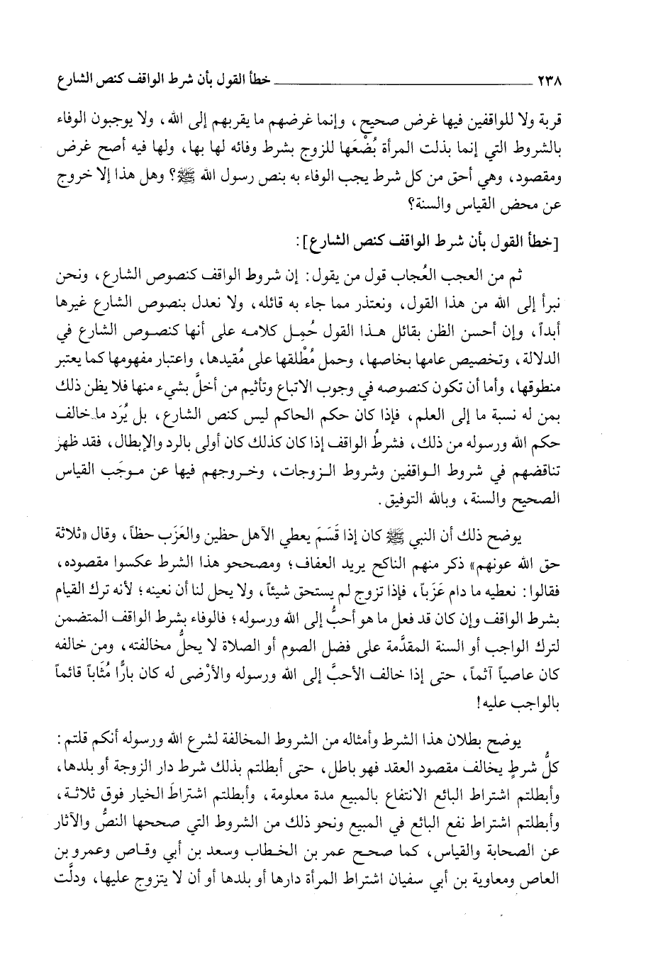 [خَطَأُ الْقَوْلِ بِأَنَّ شَرْطَ الْوَاقِفِ كَنَصِّ الشَّارِعِ] : ثُمَّ مِنْ الْعَجَبِ الْعُجَابِ قَوْلُ مَنْ يَقُولُ: إنَّ شُرُوطَ الْوَاقِفِ كَنُصُوصِ الشَّارِعِ، وَنَحْنُ نَبْرَأُ إلَى اللَّهِ مِنْ هَذَا الْقَوْلِ، وَنَعْتَذِرُ مِمَّا جَاءَ بِهِ قَائِلُهُ، وَلَا نُعَدِّلُ بِنُصُوصِ الشَّارِعِ غَيْرَهَا أَبَدًا، وَإِنَّ أَحْسَنَ الظَّنَّ بِقَائِلِ هَذَا الْقَوْلِ حَمْلُ كَلَامِهِ عَلَى أَنَّهَا كَنُصُوصِ الشَّارِعِ فِي الدَّلَالَةِ، وَتَخْصِيصِ عَامِّهَا بِخَاصِّهَا، وَحَمْلِ مُطْلَقِهَا عَلَى مُقَيَّدِهَا، وَاعْتِبَارِ مَفْهُومِهَا كَمَا يُعْتَبَرُ مَنْطُوقُهَا، وَأَمَّا أَنْ تَكُونَ كَنُصُوصِهِ فِي وُجُوبِ الِاتِّبَاعِ وَتَأْثِيمِ مَنْ أَخَلَّ بِشَيْءٍ مِنْهَا فَلَا يُظَنُّ ذَلِكَ بِمَنْ لَهُ نِسْبَةٌ مَا إلَى الْعِلْمِ، فَإِذَا كَانَ حُكْمُ الْحَاكِمِ لَيْسَ كَنَصِّ الشَّارِعِ، بَلْ يُرَدُّ مَا خَالَفَ حُكْمَ اللَّهِ وَرَسُولِهِ مِنْ ذَلِكَ، فَشَرْطُ الْوَاقِفِ إذَا كَانَ كَذَلِكَ كَانَ أَوْلَى بِالرَّدِّ وَالْإِبْطَالِ، فَقَدْ ظَهَرَ تَنَاقُضُهُمْ فِي شُرُوطِ الْوَاقِفِينَ وَشُرُوطِ الزَّوْجَاتِ، وَخُرُوجِهِمْ فِيهَا عَنْ مُوجَبِ الْقِيَاسِ الصَّحِيحِ وَالسُّنَّةِ، وَبِاَللَّهِ التَّوْفِيقُ.