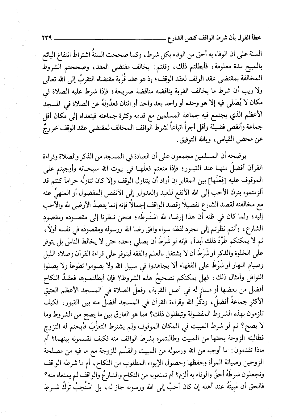 يُوَضِّحُهُ أَنَّ الْمُسْلِمِينَ مُجْمِعُونَ عَلَى أَنَّ الْعِبَادَةَ فِي الْمَسْجِدِ مِنْ الذِّكْرِ وَالصَّلَاةِ وَقِرَاءَةِ الْقُرْآنِ أَفْضَلُ مِنْهَا عِنْدَ الْقُبُورِ، فَإِذَا مَنَعْتُمْ فِعْلَهَا فِي بُيُوتِ اللَّهِ - سُبْحَانَهُ - وَأَوْجَبْتُمْ عَلَى الْمَوْقُوفِ عَلَيْهِ [فِعْلَهَا] بَيْنَ الْمَقَابِرِ إنْ أَرَادَ أَنْ يَتَنَاوَلَ الْوَقْفَ وَإِلَّا كَانَ تَنَاوُلُهُ حَرَامًا كُنْتُمْ قَدْ أَلْزَمْتُمُوهُ بِتَرْكِ الْأَحَبِّ إلَى اللَّهِ الْأَنْفَعِ لِلْعَبْدِ، وَالْعُدُولِ إلَى الْأَنْقَصِ الْمَفْضُولِ أَوْ الْمَنْهِيِّ عَنْهُ مَعَ مُخَالَفَتِهِ لِقَصْدِ الشَّارِعِ تَفْصِيلًا وَقَصْدِ الْوَاقِفِ إجْمَالًا فَإِنَّهُ إنَّمَا يَقْصِدُ الْأَرْضَى لِلَّهِ وَالْأَحَبَّ إلَيْهِ، وَلَمَّا كَانَ فِي ظَنِّهِ أَنَّ هَذَا إرْضَاءً لِلَّهِ اشْتَرَطَهُ، فَنَحْنُ نَظَرْنَا إلَى مَقْصُودِهِ وَمَقْصُودِ الشَّارِعِ، وَأَنْتُمْ نَظَرْتُمْ إلَى مُجَرَّدِ لَفْظِهِ سَوَاءٌ وَافَقَ رِضَا اللَّهِ وَرَسُولِهِ وَمَقْصُودَهُ فِي نَفْسِهِ أَوْ لَا، ثُمَّ لَا يُمْكِنُكُمْ طَرْدُ ذَلِكَ أَبَدًا، فَإِنَّهُ لَوْ شَرَطَ أَنْ يُصَلِّيَ وَحْدَهُ حَتَّى لَا يُخَالِطَ النَّاسَ بَلْ يَتَوَفَّرَ عَلَى الْخَلْوَةِ وَالذِّكْرِ، أَوْ شَرَطَ أَنْ لَا يَشْتَغِلَ بِالْعِلْمِ وَالْفِقْهِ لِيَتَوَفَّرَ عَلَى قِرَاءَةِ الْقُرْآنِ وَصَلَاةِ اللَّيْلِ وَصِيَامِ النَّهَارِ، أَوْ شَرَطَ عَلَى الْفُقَهَاءِ أَلَّا يُجَاهِدُوا فِي سَبِيلِ اللَّهِ وَلَا يَصُومُوا تَطَوُّعًا وَلَا يُصَلُّوا النَّوَافِلَ وَأَمْثَالَ ذَلِكَ، فَهَلْ يُمْكِنُكُمْ تَصْحِيحُ هَذِهِ الشُّرُوطِ؟ فَإِنْ أَبْطَلْتُمُوهَا فَعَقْدُ النِّكَاحِ أَفْضَلُ مِنْ بَعْضِهَا، أَوْ مُسَاوٍ لَهُ فِي أَصْلِ الْقُرْبَةِ، وَفِعْلُ الصَّلَاةِ فِي الْمَسْجِدِ الْأَعْظَمِ الْعَتِيقِ الْأَكْثَرِ جَمَاعَةً أَفْضَلُ، وَذِكْرُ اللَّهِ وَقِرَاءَةُ الْقُرْآنِ فِي الْمَسْجِدِ أَفْضَلُ مِنْهُ بَيْنَ الْقُبُورِ، فَكَيْفَ تُلْزِمُونَ بِهَذِهِ الشُّرُوطِ الْمَفْضُولَةِ وَتُبْطِلُونَ ذَلِكَ؟ فَمَا هُوَ الْفَارِقُ بَيْنَ مَا يَصِحُّ مِنْ الشُّرُوطِ وَمَا لَا يَصِحُّ؟