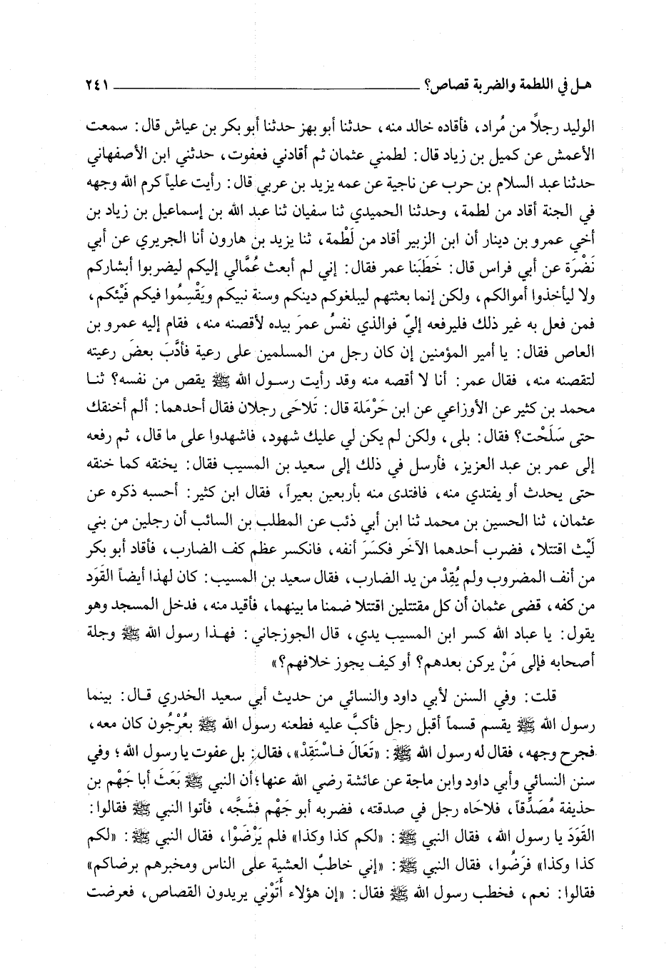 قُلْتُ: وَفِي السُّنَنِ لِأَبِي دَاوُد وَالنَّسَائِيُّ مِنْ حَدِيث أَبِي سَعِيدٍ الْخُدْرِيِّ قَالَ: «بَيْنَمَا رَسُولُ اللَّهِ - صَلَّى اللَّهُ عَلَيْهِ وَسَلَّمَ - يَقْسِمُ قَسْمًا أَقْبَلَ رَجُلٌ فَأَكَبَّ عَلَيْهِ فَطَعَنَهُ رَسُولُ اللَّهِ - صَلَّى اللَّهُ عَلَيْهِ وَسَلَّمَ - بِعُرْجُونٍ كَانَ مَعَهُ، فَجَرَحَ وَجْهَهُ، فَقَالَ لَهُ رَسُولُ اللَّهِ - صَلَّى اللَّهُ عَلَيْهِ وَسَلَّمَ -: تَعَالَ فَاسْتَقِدْ، فَقَالَ: بَلْ عَفَوْتُ يَا رَسُولَ اللَّهِ» .