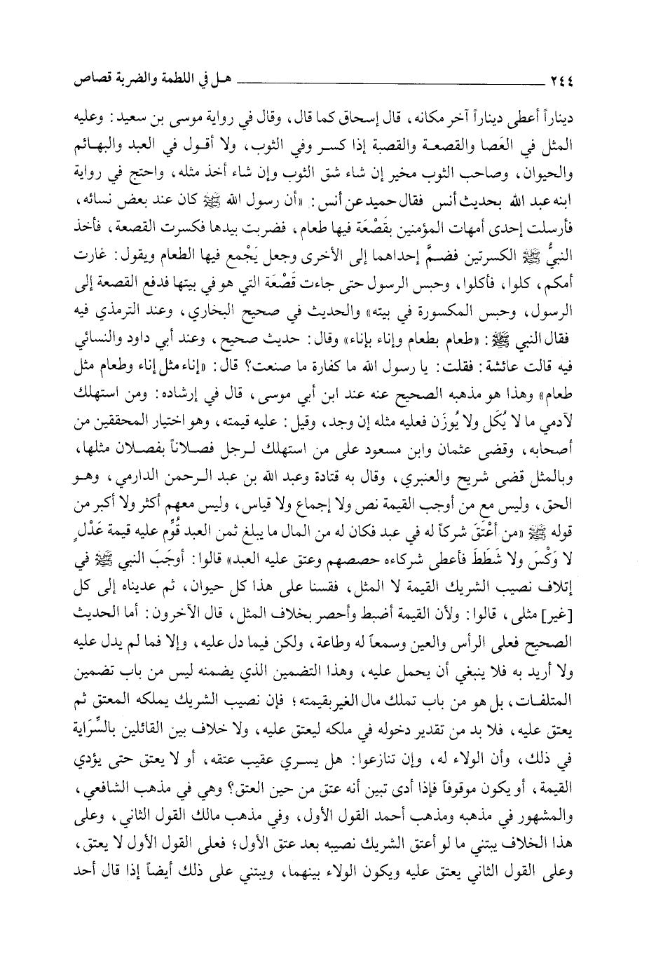 دِينَارًا أَعْطَى دِينَارًا آخَرَ مَكَانَهُ، قَالَ إِسْحَاقُ كَمَا قَالَ، وَقَالَ فِي رِوَايَةِ مُوسَى بْنِ سَعِيدٍ: وَعَلَيْهِ الْمِثْلُ فِي الْعَصَا وَالْقَصْعَةِ وَالْقَصَبَةِ إذَا كَسَرَ وَفِي الثَّوْبِ، وَلَا أَقُولُ فِي الْعَبْدِ وَالْبَهَائِمِ وَالْحَيَوَانِ، وَصَاحِبُ الثَّوْبِ مُخَيَّرٌ إنْ شَاءَ شَقَّ الثَّوْبَ وَإِنْ شَاءَ أَخَذَ مِثْلَهُ، وَاحْتَجَّ فِي رِوَايَةِ ابْنِهِ عَبْدِ اللَّهِ بِحَدِيثِ أَنَسٍ فَقَالَ حُمَيْدٍ عَنْ أَنَسٍ: «أَنَّ رَسُولَ اللَّهِ - صَلَّى اللَّهُ عَلَيْهِ وَسَلَّمَ - كَانَ عِنْدَ بَعْضِ نِسَائِهِ، فَأَرْسَلَتْ إحْدَى أُمَّهَاتِ الْمُؤْمِنِينَ بِقَصْعَةٍ فِيهَا طَعَامٌ، فَضَرَبَتْ بِيَدِهَا فَكَسَرَتْ الْقَصْعَةَ، فَأَخَذَ النَّبِيُّ - صَلَّى اللَّهُ عَلَيْهِ وَسَلَّمَ - الْكِسْرَتَيْنِ فَضَمَّ إحْدَاهُمَا إلَى الْأُخْرَى وَجَعَلَ يَجْمَعُ فِيهَا الطَّعَامَ وَيَقُولُ: غَارَتْ أُمُّكُمْ، كُلُوا، فَأَكَلُوا، وَحَبَسَ الرَّسُولَ حَتَّى جَاءَتْ قَصْعَةُ الَّتِي هُوَ فِي بَيْتِهَا فَدَفَعَ الْقَصْعَةَ إلَى الرَّسُولِ، وَحَبَسَ الْمَكْسُورَةَ فِي بَيْتِهِ» وَالْحَدِيثُ فِي صَحِيحِ الْبُخَارِيِّ وَعِنْدَ التِّرْمِذِيِّ فِيهِ فَقَالَ النَّبِيُّ - صَلَّى اللَّهُ عَلَيْهِ وَسَلَّمَ -: «طَعَامٌ بِطَعَامٍ وَإِنَاءٌ بِإِنَاءٍ» وَقَالَ: حَدِيثٌ صَحِيحٌ.