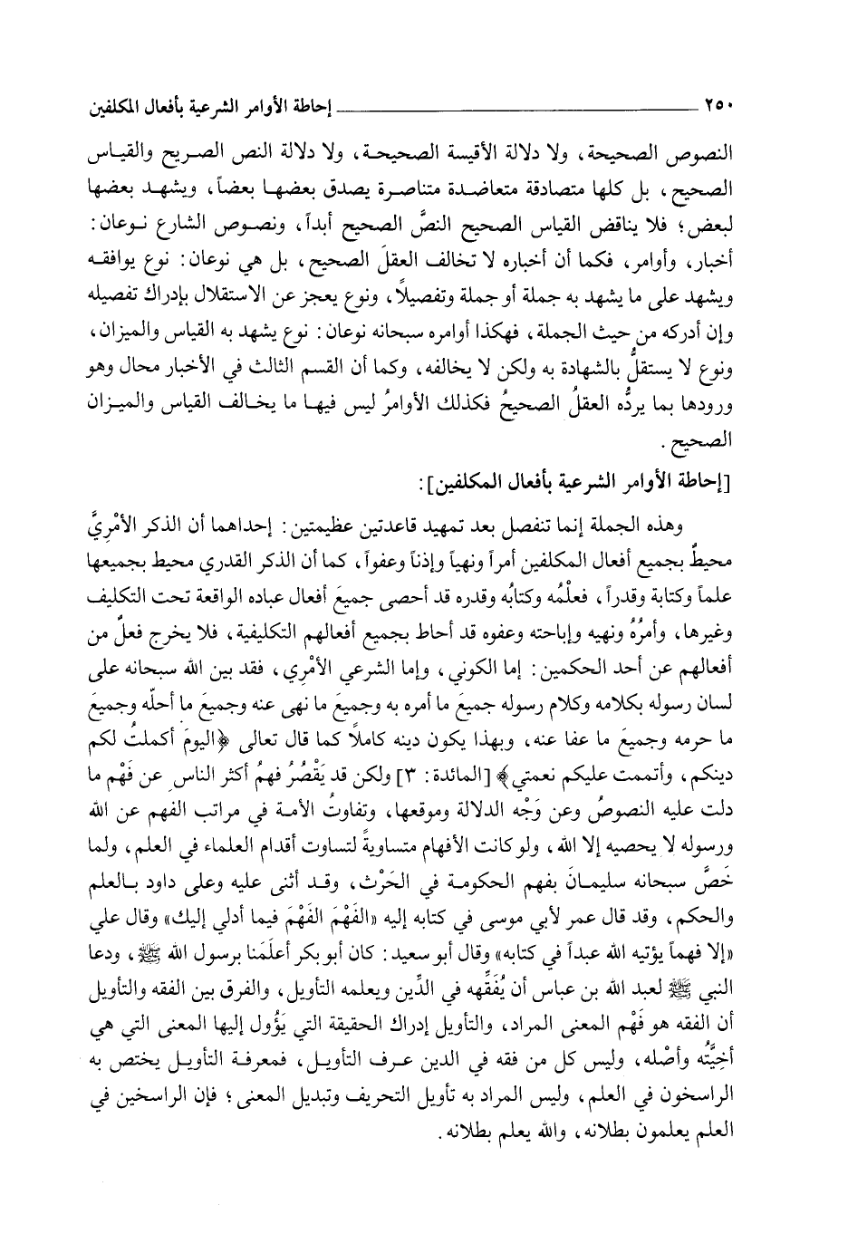 وَهَذِهِ الْجُمْلَةُ إنَّمَا تَنْفَصِلُ بَعْدَ تَمْهِيدِ قَاعِدَتَيْنِ عَظِيمَتَيْنِ: إحْدَاهُمَا: أَنَّ الذِّكْرَ الْأَمْرِيَّ مُحِيطٌ بِجَمِيعِ أَفْعَالِ الْمُكَلَّفِينَ أَمْرًا وَنَهْيًا وَإِذْنًا وَعَفْوًا، كَمَا أَنَّ الذِّكْرَ الْقَدَرِيَّ مُحِيطٌ بِجَمِيعِهَا عِلْمًا وَكِتَابَةً وَقَدَرًا، فَعِلْمُهُ وَكِتَابُهُ وَقَدَرُهُ قَدْ أَحْصَى جَمِيعَ أَفْعَالِ عِبَادِهِ الْوَاقِعَةِ تَحْتَ التَّكْلِيفِ وَغَيْرَهَا، وَأَمْرُهُ وَنَهْيُهُ وَإِبَاحَتُهُ وَعَفْوُهُ قَدْ أَحَاطَ بِجَمِيعِ أَفْعَالِهِمْ التَّكْلِيفِيَّةِ، فَلَا يَخْرُجُ فِعْلٌ مِنْ أَفْعَالِهِمْ عَنْ أَحَدِ الْحُكْمَيْنِ: إمَّا الْكَوْنِيَّ، وَإِمَّا الشَّرْعِيَّ الْأَمْرِيَّ، فَقَدْ بَيَّنَ اللَّهُ - سُبْحَانَهُ - عَلَى لِسَانِ رَسُولِهِ بِكَلَامِهِ وَكَلَامِ رَسُولِهِ جَمِيعَ مَا أَمَرَهُ بِهِ وَجَمِيعَ مَا نَهَى عَنْهُ وَجَمِيعَ مَا أَحَلَّهُ وَجَمِيعَ مَا حَرَّمَهُ وَجَمِيعَ مَا عَفَا عَنْهُ، وَبِهَذَا يَكُونُ دِينُهُ كَامِلًا كَمَا قَالَ تَعَالَى: {الْيَوْمَ أَكْمَلْتُ لَكُمْ دِينَكُمْ وَأَتْمَمْتُ عَلَيْكُمْ نِعْمَتِي} [المائدة: 3] وَلَكِنْ قَدْ يَقْصُرُ فَهْمُ أَكْثَرِ النَّاسِ عَنْ فَهْمِ مَا دَلَّتْ عَلَيْهِ النُّصُوصُ وَعَنْ وَجْهِ الدَّلَالَةِ وَمَوْقِعِهَا، وَتَفَاوُتُ الْأُمَّةِ فِي مَرَاتِبِ الْفَهْمِ عَنْ اللَّهِ وَرَسُولِهِ لَا يُحْصِيهِ إلَّا اللَّهُ، وَلَوْ كَانَتْ الْأَفْهَامُ مُتَسَاوِيَةً لَتَسَاوَتْ أَقْدَامُ الْعُلَمَاءِ فِي الْعِلْمِ، وَلَمَا خَصَّ - سُبْحَانَهُ - سُلَيْمَانَ بِفَهْمِ الْحُكُومَةِ فِي الْحَرْثِ، وَقَدْ أَثْنَى عَلَيْهِ وَعَلَى دَاوُد بِالْعِلْمِ وَالْحُكْمِ. وَقَدْ قَالَ عُمَرُ لِأَبِي مُوسَى فِي كِتَابِهِ إلَيْهِ " الْفَهْمَ الْفَهْمَ فِيمَا أُدْلِيَ إلَيْكَ ".