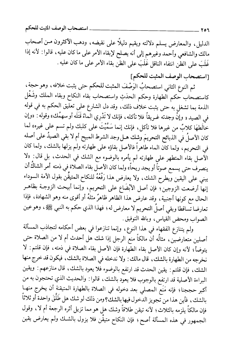 ثُمَّ النَّوْعُ الثَّانِي اسْتِصْحَابُ الْوَصْفِ الْمُثْبِتِ لِلْحُكْمِ حَتَّى يَثْبُتَ خِلَافُهُ، وَهُوَ حُجَّةٌ، كَاسْتِصْحَابِ حُكْمِ الطَّهَارَةِ وَحُكْمِ الْحَدَثِ وَاسْتِصْحَابِ بَقَاءِ النِّكَاحِ وَبَقَاءِ الْمِلْكِ وَشُغْلِ الذِّمَّةِ بِمَا تَشْغَلُ بِهِ حَتَّى يَثْبُتَ خِلَافُ ذَلِكَ، وَقَدْ دَلَّ الشَّارِعُ عَلَى تَعْلِيقِ الْحُكْمِ بِهِ فِي قَوْلِهِ فِي الصَّيْدِ " وَإِنْ وَجَدْتَهُ غَرِيقًا فَلَا تَأْكُلْهُ، فَإِنَّكَ لَا تَدْرِي: الْمَاءُ قَتَلَهُ أَوْ سَهْمُكَ " وَقَوْلِهِ: " وَإِنْ خَالَطَهَا كِلَابٌ مِنْ غَيْرِهَا فَلَا تَأْكُلْ، فَإِنَّكَ إنَّمَا سَمَّيْتَ عَلَى كَلْبِكَ وَلَمْ تُسَمِّ عَلَى غَيْرِهِ " لَمَّا كَانَ الْأَصْلُ فِي الذَّبَائِحِ التَّحْرِيمَ وَشَكَّ هَلْ وُجِدَ الشَّرْطُ الْمُبِيحُ أَمْ لَا؟ بَقِيَ الصَّيْدُ عَلَى أَصْلِهِ فِي التَّحْرِيمِ، وَلَمَّا كَانَ الْمَاءُ طَاهِرًا فَالْأَصْلُ بَقَاؤُهُ عَلَى طَهَارَتِهِ وَلَمْ يُزِلْهَا بِالشَّكِّ، وَلَمَّا كَانَ الْأَصْلُ بَقَاءَ الْمُتَطَهِّرِ عَلَى طَهَارَتِهِ لَمْ يَأْمُرْهُ بِالْوُضُوءِ مَعَ الشَّكِّ فِي الْحَدَثِ، بَلْ قَالَ: " لَا يَنْصَرِفُ حَتَّى يَسْمَعَ صَوْتًا أَوْ يَجِدَ رِيحًا "، وَلَمَّا كَانَ الْأَصْلُ بَقَاءَ الصَّلَاةِ فِي ذِمَّتِهِ أُمِرَ الشَّاكُّ أَنْ يَبْنِيَ عَلَى الْيَقِينِ وَيَطْرَحَ الشَّكَّ، وَلَا يُعَارِضُ هَذَا رَفْعُهُ لِلنِّكَاحِ الْمُتَيَقَّنِ بِقَوْلِ الْأَمَةِ السَّوْدَاءِ إنَّهَا أَرْضَعَتْ الزَّوْجَيْنِ، فَإِنَّ أَصْلَ الْأَبْضَاعِ عَلَى التَّحْرِيمِ، وَإِنَّمَا أُبِيحَتْ الزَّوْجَةُ بِظَاهِرِ الْحَالِ مَعَ كَوْنِهَا أَجْنَبِيَّةً، وَقَدْ عَارَضَ هَذَا الظَّاهِرَ ظَاهِرٌ مِثْلُهُ أَوْ أَقْوَى مِنْهُ وَهُوَ الشَّهَادَةُ، فَإِذَا تَعَارَضَا تَسَاقَطَا وَبَقِيَ أَصْلُ التَّحْرِيمِ لَا مُعَارِضَ لَهُ، فَهَذَا الَّذِي حَكَمَ بِهِ النَّبِيُّ - صَلَّى اللَّهُ عَلَيْهِ وَسَلَّمَ -، وَهُوَ عَيْنُ الصَّوَابِ وَمَحْضُ الْقِيَاسِ، وَبِاَللَّهِ التَّوْفِيقُ.