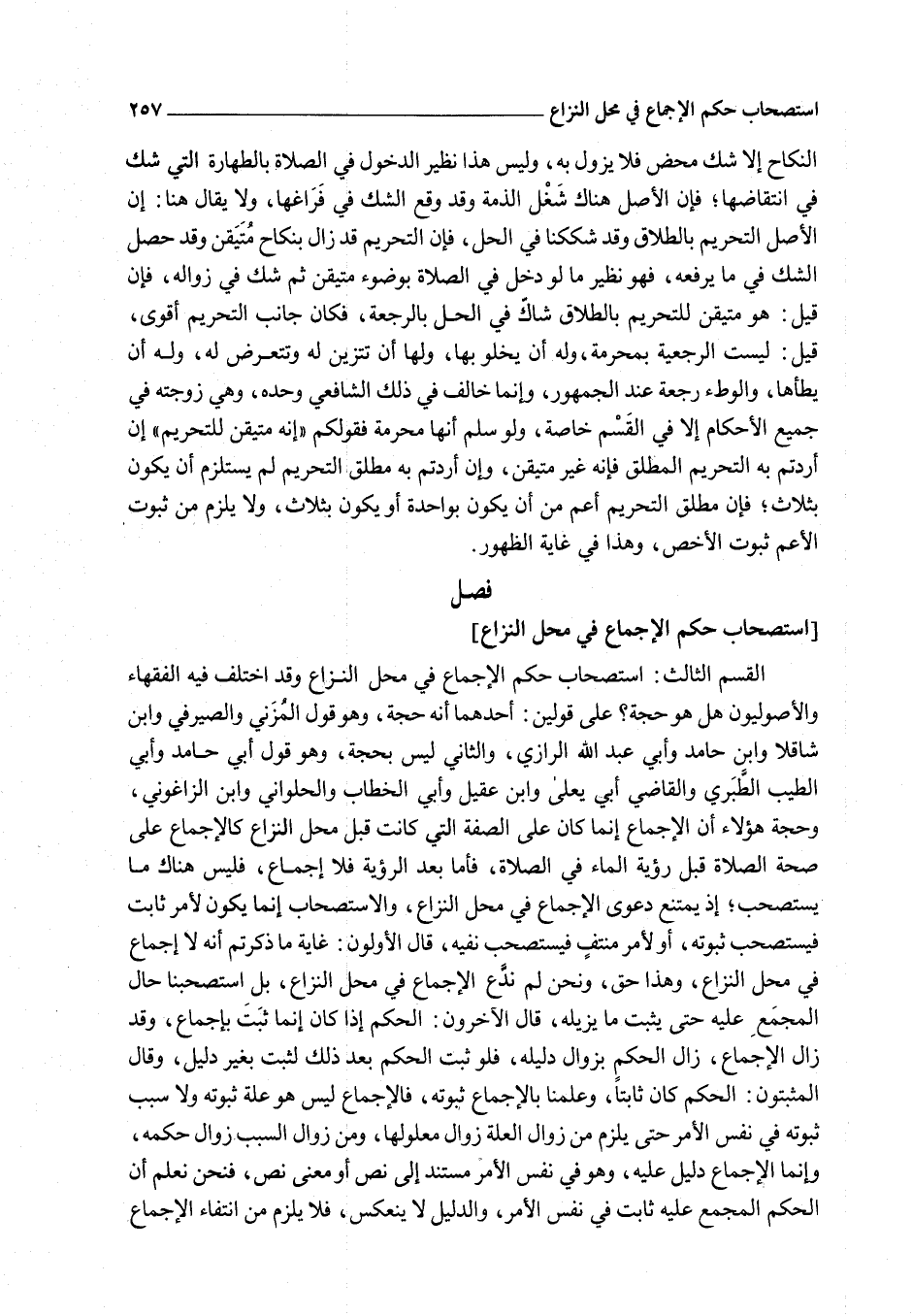 وَالثَّانِي: لَيْسَ بِحُجَّةٍ، وَهُوَ قَوْلُ أَبِي حَامِدٍ وَأَبِي الطَّيِّبِ الطَّبَرِيِّ وَالْقَاضِي أَبِي يَعْلَى وَابْنِ عَقِيلٍ وَأَبِي الْخَطَّابِ وَالْحَلْوَانِيِّ وَابْنِ الزَّاغُونِيِّ، وَحُجَّةُ هَؤُلَاءِ أَنَّ الْإِجْمَاعَ إنَّمَا كَانَ عَلَى الصِّفَةِ الَّتِي كَانَتْ قَبْلَ مَحَلِّ النِّزَاعِ كَالْإِجْمَاعِ عَلَى صِحَّةِ الصَّلَاةِ قَبْلَ رُؤْيَةِ الْمَاءِ فِي الصَّلَاةِ، فَأَمَّا بَعْدَ الرُّؤْيَةِ فَلَا إجْمَاعَ، فَلَيْسَ هُنَاكَ مَا يُسْتَصْحَبُ، إذْ يَمْتَنِعُ دَعْوَى الْإِجْمَاعِ فِي مَحَلِّ النِّزَاعِ، وَالِاسْتِصْحَابُ إنَّمَا يَكُونُ لِأَمْرٍ ثَابِتٍ فَيُسْتَصْحَبُ ثُبُوتُهُ، أَوْ لِأَمْرٍ مُنْتَفٍ فَيُسْتَصْحَبُ نَفْيُهُ، قَالَ الْأَوَّلُونَ: غَايَةُ مَا ذَكَرْتُمْ أَنَّهُ لَا إجْمَاعَ فِي مَحَلِّ النِّزَاعِ، وَهَذَا حَقٌّ، وَنَحْنُ لَمْ نَدَّعِ الْإِجْمَاعَ فِي مَحَلِّ النِّزَاعِ، بَلْ اسْتَصْحَبْنَا حَالَ الْمُجْمَعِ عَلَيْهِ حَتَّى يَثْبُتَ مَا يُزِيلُهُ، قَالَ الْآخَرُونَ: الْحُكْمُ إذَا كَانَ إنَّمَا ثَبَتَ بِإِجْمَاعٍ، وَقَدْ زَالَ الْإِجْمَاعُ، زَالَ الْحُكْمُ بِزَوَالِ دَلِيلِهِ، فَلَوْ ثَبَتَ الْحُكْمُ بَعْدَ ذَلِكَ لَثَبَتَ بِغَيْرِ دَلِيلٍ.