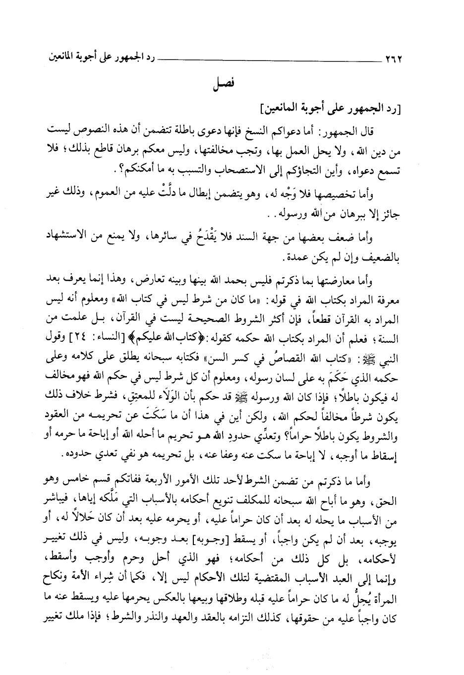 قَالَ الْجُمْهُورُ: أَمَّا دَعْوَاكُمْ النَّسْخَ فَإِنَّهَا دَعْوَى بَاطِلَةٌ تَتَضَمَّنُ أَنَّ هَذِهِ النُّصُوصَ لَيْسَتْ مِنْ دِينِ اللَّهِ، وَلَا يَحِلُّ الْعَمَلُ بِهَا، وَتَجِبُ مُخَالَفَتُهَا، وَلَيْسَ مَعَكُمْ بُرْهَانٌ قَاطِعٌ بِذَلِكَ، فَلَا تُسْمَعُ دَعْوَاهُ، وَأَيْنَ الْتِجَاؤُكُمْ إلَى الِاسْتِصْحَابِ وَالتَّسَبُّبِ بِهِ مَا أَمْكَنَكُمْ؟ .