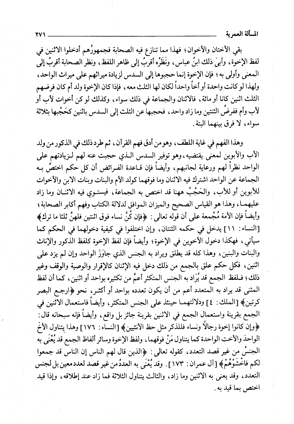 فَهَكَذَا دُخُولُ الْأَخَوَيْنِ فِي الْإِخْوَةِ، وَأَيْضًا فَإِنَّ لَفْظَ الْإِخْوَةِ كَلَفْظِ الذُّكُورِ وَالْإِنَاثِ وَالْبَنَاتِ وَالْبَنِينَ، وَهَذَا كُلُّهُ قَدْ يُطْلَقُ وَيُرَادُ بِهِ الْجِنْسُ الَّذِي جَاوَزَ الْوَاحِدَ وَإِنْ لَمْ يَزِدْ عَلَى اثْنَيْنِ، فَكُلُّ حُكْمٍ عُلِّقَ بِالْجَمْعِ مِنْ ذَلِكَ دَخَلَ فِيهِ الِاثْنَانِ كَالْإِقْرَارِ وَالْوَصِيَّةِ وَالْوَقْفِ وَغَيْرِ ذَلِكَ، فَلَفْظُ الْجَمْعِ قَدْ يُرَادُ بِهِ الْجِنْسُ الْمُتَكَثِّرِ أَعَمَّ مِنْ تَكْثِيرِهِ بِوَاحِدٍ أَوْ اثْنَيْنِ، كَمَا أَنَّ لَفْظَ الْمَثْنَى قَدْ يُرَادُ بِهِ الْمُتَعَدِّدُ أَعَمَّ مِنْ أَنْ يَكُونَ تَعَدُّدُهُ بِوَاحِدٍ أَوْ أَكْثَرَ، نَحْوُ: {ارْجِعِ الْبَصَرَ كَرَّتَيْنِ} [الملك: 4] وَدَلَالَتُهُمَا حِينَئِذٍ عَلَى الْجِنْسِ الْمُتَكَثِّرِ، وَأَيْضًا فَاسْتِعْمَالُ الِاثْنَيْنِ فِي الْجَمْعِ بِقَرِينَةٍ وَاسْتِعْمَالُ الْجَمْعِ فِي الِاثْنَيْنِ بِقَرِينَةٍ جَائِزٌ بَلْ وَاقِعٌ، وَأَيْضًا فَإِنَّهُ - سُبْحَانَهُ - قَالَ: {وَإِنْ كَانُوا إِخْوَةً رِجَالا وَنِسَاءً فَلِلذَّكَرِ مِثْلُ حَظِّ الأُنْثَيَيْنِ} [النساء: 176] وَهَذَا يَتَنَاوَلُ الْأَخَ الْوَاحِدَ وَالْأُخْتَ الْوَاحِدَةَ كَمَا يَتَنَاوَلُ مَنْ فَوْقَهُمَا، وَلَفْظُ الْإِخْوَةِ وَسَائِرُ أَلْفَاظِ الْجَمْعِ قَدْ يُعْنَى بِهِ الْجِنْسُ مِنْ غَيْرِ قَصْدِ التَّعَدُّدِ، كَقَوْلِهِ - تَعَالَى -: {الَّذِينَ قَالَ لَهُمُ النَّاسُ إِنَّ النَّاسَ قَدْ جَمَعُوا لَكُمْ فَاخْشَوْهُمْ} [آل عمران: 173] وَقَدْ يُعْنَى بِهِ الْعَدَدُ مِنْ غَيْرِ قَصْدٍ لِعَدَدٍ مُعَيَّنٍ بَلْ لِجِنْسِ التَّعَدُّدِ، وَقَدْ يُعْنَى بِهِ الِاثْنَانِ وَمَا زَادَ، وَالثَّالِثُ يَتَنَاوَلُ الثَّلَاثَةَ فَمَا زَادَ عِنْدَ إطْلَاقِهِ، وَإِذَا قُيِّدَ اخْتَصَّ بِمَا قُيِّدَ بِهِ