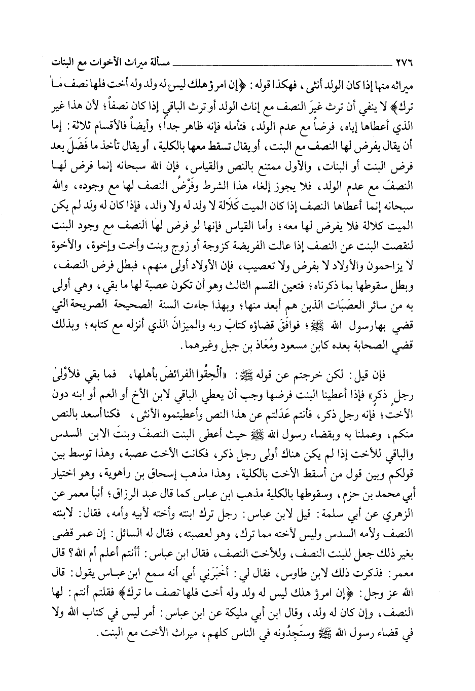مِيرَاثَهُ مِنْهَا إذَا كَانَ الْوَلَدُ أُنْثَى، فَهَكَذَا قَوْلُهُ: {إِنِ امْرُؤٌ هَلَكَ لَيْسَ لَهُ وَلَدٌ وَلَهُ أُخْتٌ فَلَهَا نِصْفُ مَا تَرَكَ} [النساء: 176] لَا يَنْفِي أَنْ تَرِثَ غَيْرَ النِّصْفِ مَعَ إنَاثِ الْوَلَدِ أَوْ تَرِثَ الْبَاقِيَ إذَا كَانَ نِصْفًا؛ لِأَنَّ هَذَا غَيْرُ الَّذِي أَعْطَاهَا إيَّاهُ، فَرْضًا مَعَ عَدَمِ الْوَلَدِ، فَتَأَمَّلْهُ فَإِنَّهُ ظَاهِرٌ جِدًّا، وَأَيْضًا فَالْأَقْسَامُ ثَلَاثَةٌ: إمَّا أَنْ يُقَالَ يُفْرَضُ لَهَا النِّصْفُ مَعَ الْبِنْتِ، أَوْ يُقَالَ تَسْقُطُ مَعَهَا بِالْكُلِّيَّةِ، أَوْ يُقَالَ تَأْخُذُ مَا فَضَلَ بَعْدَ فَرْضِ الْبِنْتِ أَوْ الْبَنَاتِ، وَالْأَوَّلُ مُمْتَنِعٌ بِالنَّصِّ وَالْقِيَاسِ، فَإِنَّ اللَّهَ - سُبْحَانَهُ - إنَّمَا فَرَضَ لَهَا النِّصْفَ مَعَ عَدَمِ الْوَلَدِ، فَلَا يَجُوزُ إلْغَاءُ هَذَا الشَّرْطِ وَفَرْضُ النِّصْفِ لَهَا مَعَ وُجُودِهِ، وَاَللَّهُ - سُبْحَانَهُ - إنَّمَا أَعْطَاهَا النِّصْفَ إذَا كَانَ الْمَيِّتُ كَلَالَةً لَا وَلَدَ لَهُ وَلَا وَالِدَ، فَإِذَا كَانَ لَهُ وَلَدٌ لَمْ يَكُنْ الْمَيِّتُ كَلَالَةً فَلَا يُفْرَضُ لَهَا مَعَهُ، وَأَمَّا الْقِيَاسُ فَإِنَّهَا لَوْ فُرِضَ لَهَا النِّصْفُ مَعَ وُجُودِ الْبِنْتِ لَنَقَصَتْ الْبِنْتُ عَنْ النِّصْفِ إذَا عَالَتْ الْفَرِيضَةُ كَزَوْجَةٍ أَوْ زَوْجٍ وَبِنْتٍ وَأُخْتٍ وَإِخْوَةٍ، وَالْإِخْوَةُ لَا يُزَاحِمُونَ الْأَوْلَادَ لَا بِفَرْضٍ وَلَا تَعْصِيبٍ، فَإِنَّ الْأَوْلَادَ أَوْلَى مِنْهُمْ، فَبَطَلَ فَرْضُ النِّصْفِ، وَبَطَلَ سُقُوطُهَا بِمَا ذَكَرْنَاهُ، فَتَعَيَّنَ الْقِسْمُ الثَّالِثُ وَهُوَ أَنْ تَكُونَ عَصَبَةً لَهَا مَا بَقِيَ، وَهِيَ أَوْلَى بِهِ مِنْ سَائِرِ الْعَصَبَاتِ الَّذِينَ هُمْ أَبْعَدُ مِنْهَا، وَبِهَذَا جَاءَتْ السُّنَّةُ الصَّحِيحَةُ الصَّرِيحَةُ الَّتِي قَضَى بِهَا رَسُولُ اللَّهِ - صَلَّى اللَّهُ عَلَيْهِ وَسَلَّمَ -، فَوَافَقَ قَضَاؤُهُ كِتَابَ رَبِّهِ وَالْمِيزَانَ الَّذِي أَنْزَلَهُ مَعَ كِتَابِهِ، وَبِذَلِكَ قَضَى الصَّحَابَةُ بَعْدَهُ كَابْنِ مَسْعُودٍ وَمُعَاذِ بْنِ جَبَلٍ وَغَيْرِهِمَا.