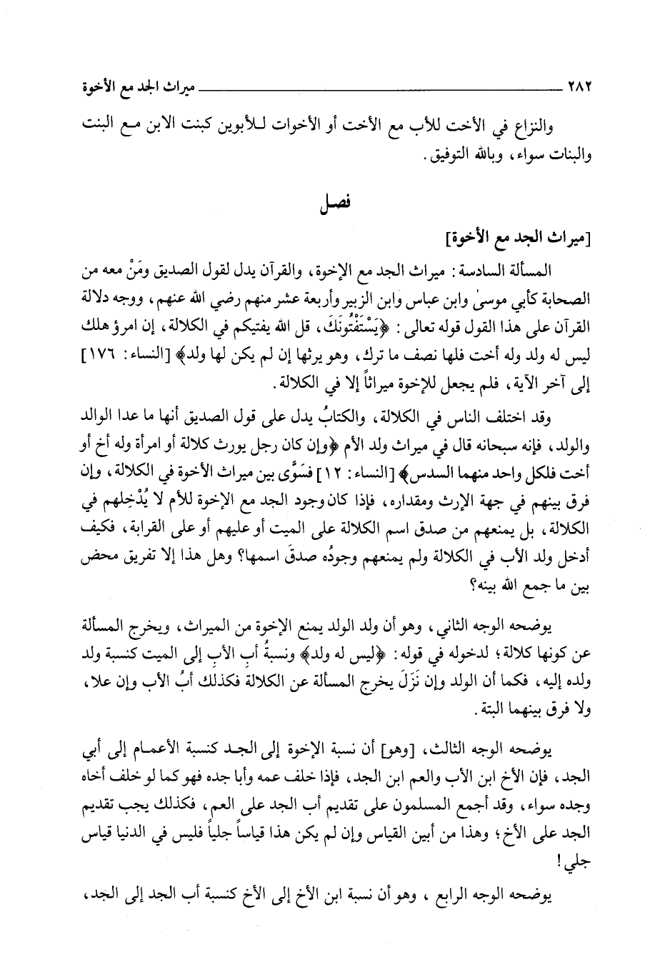 وَقَدْ اخْتَلَفَ النَّاسُ فِي الْكَلَالَةِ، وَالْكِتَابُ يَدُلُّ عَلَى قَوْلِ الصِّدِّيقِ أَنَّهَا مَا عَدَا الْوَالِدَ وَالْوَلَدَ، فَإِنَّهُ - سُبْحَانَهُ - قَالَ فِي مِيرَاثِ وَلَدِ الْأُمِّ: {وَإِنْ كَانَ رَجُلٌ يُورَثُ كَلالَةً أَوِ امْرَأَةٌ وَلَهُ أَخٌ أَوْ أُخْتٌ فَلِكُلِّ وَاحِدٍ مِنْهُمَا السُّدُسُ} [النساء: 12] فَسَوَّى بَيْنَ مِيرَاثِ الْإِخْوَةِ فِي الْكَلَالَةِ، وَإِنْ فَرَّقَ بَيْنَهُمْ فِي جِهَةِ الْإِرْثِ وَمِقْدَارِهِ، فَإِذَا كَانَ وُجُودُ الْجَدِّ مَعَ الْإِخْوَةِ لِلْأُمِّ لَا يُدْخِلُهُمْ فِي الْكَلَالَةِ، بَلْ يَمْنَعُهُمْ مِنْ صِدْقِ اسْمِ الْكَلَالَةِ عَلَى الْمَيِّتِ أَوْ عَلَيْهِمْ أَوْ عَلَى الْقَرَابَةِ، فَكَيْفَ أُدْخِلَ وَلَدُ الْأَبِ فِي الْكَلَالَةِ وَلَمْ يَمْنَعْهُمْ وُجُودُهُ صِدْقَ اسْمِهَا؟ وَهَلْ هَذَا إلَّا تَفْرِيقٌ مَحْضٌ بَيْنَ مَا جَمَعَ اللَّهُ بَيْنَهُ؟