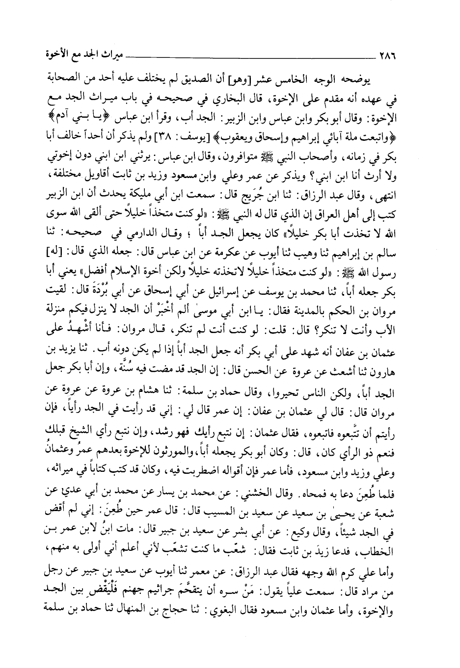 يُوَضِّحُهُ الْوَجْهُ الْخَامِسَ عَشَرَ: [وَهُوَ] أَنَّ الصِّدِّيقَ لَمْ يَخْتَلِفْ عَلَيْهِ أَحَدٌ مِنْ الصَّحَابَةِ فِي عَهْدِهِ أَنَّهُ مُقَدَّمٌ عَلَى الْإِخْوَةِ، قَالَ الْبُخَارِيُّ فِي صَحِيحِهِ فِي بَابِ مِيرَاثِ الْجَدِّ مَعَ الْإِخْوَةِ: وَقَالَ أَبُو بَكْرٍ وَابْنُ عَبَّاسٍ وَابْنُ الزُّبَيْرِ: الْجَدُّ أَبٌ، وَقَرَأَ ابْنُ عَبَّاسٍ: {يَا بَنِي آدَمَ} [الأعراف: 26] {وَاتَّبَعْتُ مِلَّةَ آبَائِي إِبْرَاهِيمَ وَإِسْحَاقَ وَيَعْقُوبَ} [يوسف: 38] وَلَمْ يَذْكُرْ أَنَّ أَحَدًا خَالَفَ أَبَا بَكْرٍ فِي زَمَانِهِ، وَأَصْحَابُ النَّبِيِّ - صَلَّى اللَّهُ عَلَيْهِ وَسَلَّمَ - مُتَوَافِرُونَ.