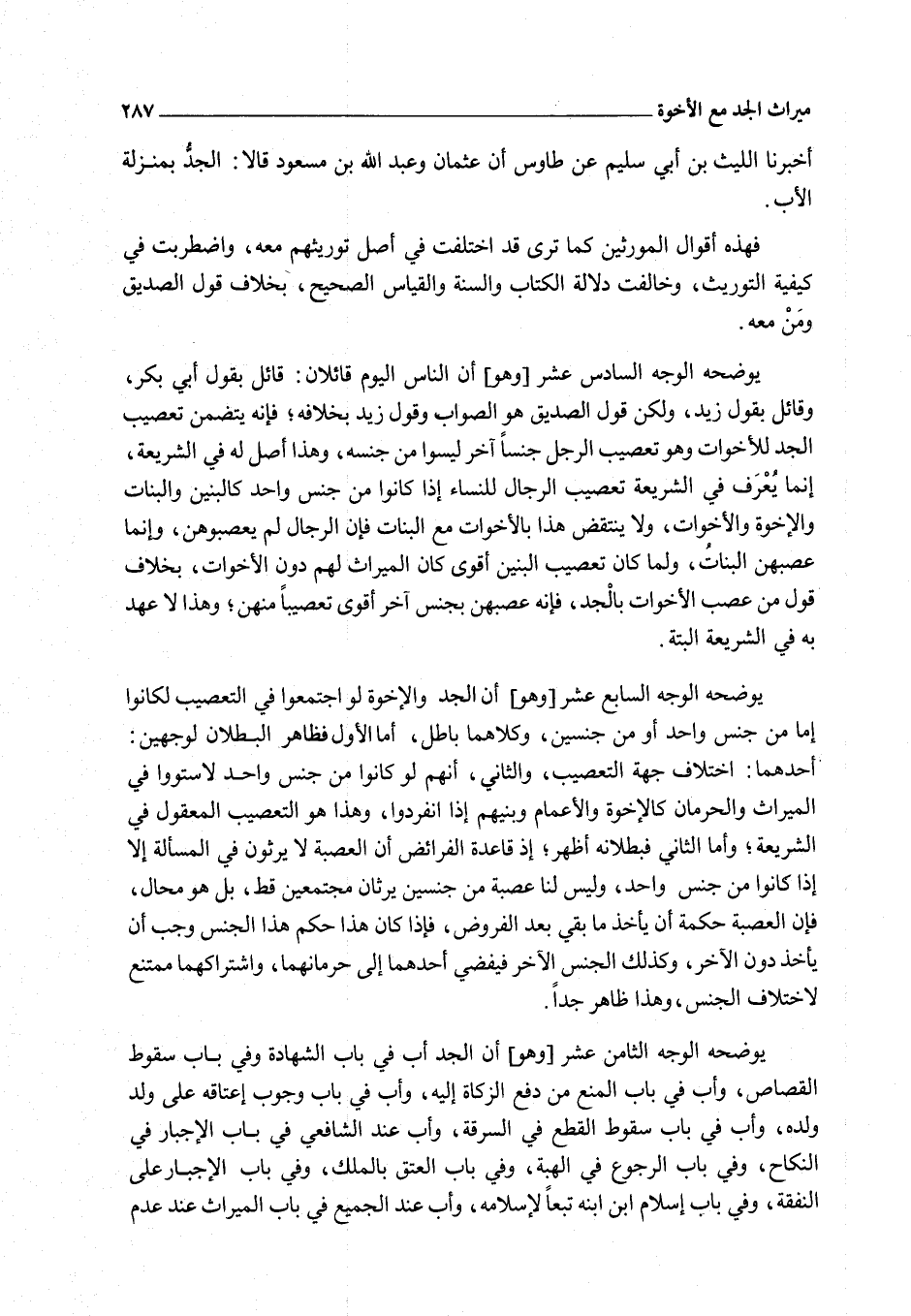 يُوَضِّحُهُ الْوَجْهُ السَّادِسَ عَشَرَ: [وَهُوَ] أَنَّ النَّاسَ الْيَوْمَ قَائِلَانِ: قَائِلٌ بِقَوْلِ أَبِي بَكْرٍ وَقَائِلٌ بِقَوْلِ زَيْدٍ، وَلَكِنَّ قَوْلَ الصِّدِّيقِ هُوَ الصَّوَابُ وَقَوْلَ زَيْدٍ بِخِلَافِهِ، فَإِنَّهُ يَتَضَمَّنُ تَعْصِيبَ الْجَدِّ لِلْأَخَوَاتِ وَهُوَ تَعْصِيبُ الرَّجُلِ جِنْسًا آخَرَ لَيْسُوا مِنْ جِنْسِهِ، وَهَذَا أَصْلٌ لَهُ فِي الشَّرِيعَةِ، إنَّمَا يُعْرَفُ فِي الشَّرِيعَةِ تَعْصِيبُ الرِّجَالِ لِلنِّسَاءِ إذَا كَانُوا مِنْ جِنْسٍ وَاحِدٍ كَالْبَنِينَ وَالْبَنَاتِ وَالْإِخْوَةِ وَالْأَخَوَاتِ، وَلَا يُنْتَقَضُ هَذَا بِالْأَخَوَاتِ مَعَ الْبَنَاتِ فَإِنَّ الرِّجَالَ لَمْ يُعَصِّبُوهُنَّ، وَإِنَّمَا عَصَّبَهُنَّ الْبَنَاتُ، وَلَمَّا كَانَ تَعْصِيبُ الْبَنِينَ أَقْوَى كَانَ الْمِيرَاثُ لَهُمْ دُونَ الْأَخَوَاتِ، بِخِلَافِ قَوْلِ مَنْ عَصَّبَ الْأَخَوَاتِ بِالْجَدِّ، فَإِنَّهُ عَصَّبَهُنَّ بِجِنْسٍ آخَرَ أَقْوَى تَعْصِيبًا مِنْهُنَّ، وَهَذَا لَا عَهْدَ بِهِ فِي الشَّرِيعَةِ أَلْبَتَّةَ.