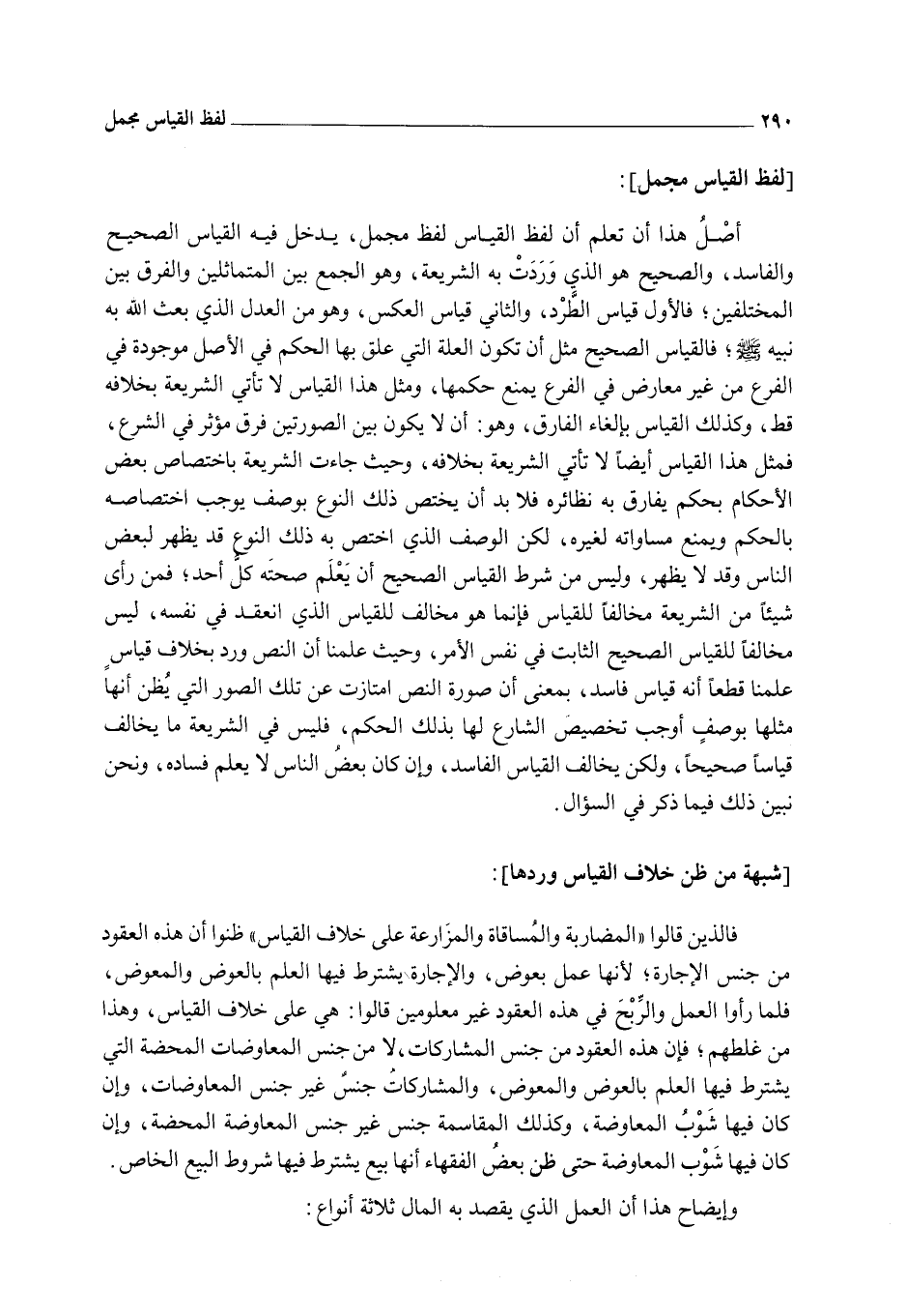 أَصْلُ هَذَا أَنْ تَعْلَمَ أَنَّ لَفْظَ الْقِيَاسِ لَفْظٌ مُجْمَلٌ، يَدْخُلُ فِيهِ الْقِيَاسُ الصَّحِيحُ وَالْفَاسِدُ، وَالصَّحِيحُ هُوَ الَّذِي وَرَدَتْ بِهِ الشَّرِيعَةُ، وَهُوَ الْجَمْعُ بَيْنَ الْمُتَمَاثِلَيْنِ وَالْفَرْقُ بَيْنَ الْمُخْتَلِفَيْنِ، فَالْأَوَّلُ قِيَاسُ الطَّرْدِ، وَالثَّانِي قِيَاسُ الْعَكْسِ، وَهُوَ مِنْ الْعَدْلِ الَّذِي بَعَثَ اللَّهُ بِهِ نَبِيَّهُ - صَلَّى اللَّهُ عَلَيْهِ وَسَلَّمَ -، فَالْقِيَاسُ الصَّحِيحُ مِثْلُ أَنْ تَكُونَ الْعِلَّةُ الَّتِي عُلِّقَ بِهَا الْحُكْمُ فِي الْأَصْلِ مَوْجُودَةً فِي الْفَرْعِ مِنْ غَيْرِ مُعَارِضٍ فِي الْفَرْعِ يَمْنَعُ حُكْمَهَا، وَمِثْلُ هَذَا الْقِيَاسِ لَا تَأْتِي الشَّرِيعَةُ بِخِلَافِهِ قَطُّ، وَكَذَلِكَ الْقِيَاسُ بِإِلْغَاءِ الْفَارِقِ، وَهُوَ: أَنْ لَا يَكُونَ بَيْنَ الصُّورَتَيْنِ فَرْقٌ مُؤَثِّرٌ فِي الشَّرْعِ، فَمِثْلُ هَذَا الْقِيَاسِ أَيْضًا لَا تَأْتِي الشَّرِيعَةُ بِخِلَافِهِ، وَحَيْثُ جَاءَتْ الشَّرِيعَةُ بِاخْتِصَاصِ بَعْضِ الْأَحْكَامِ بِحُكْمٍ يُفَارِقُ بِهِ نَظَائِرَهُ فَلَا بُدَّ أَنْ يَخْتَصَّ ذَلِكَ النَّوْعُ بِوَصْفٍ يُوجِبُ اخْتِصَاصَهُ بِالْحُكْمِ وَيَمْنَعُ مُسَاوَاتَهُ لِغَيْرِهِ، لَكِنَّ الْوَصْفَ الَّذِي اخْتَصَّ بِهِ ذَلِكَ النَّوْعُ قَدْ يَظْهَرُ لِبَعْضِ النَّاسِ وَقَدْ لَا يَظْهَرُ، وَلَيْسَ مِنْ شَرْطِ الْقِيَاسِ الصَّحِيحِ أَنْ يَعْلَمَ صِحَّتَهُ كُلُّ أَحَدٍ.